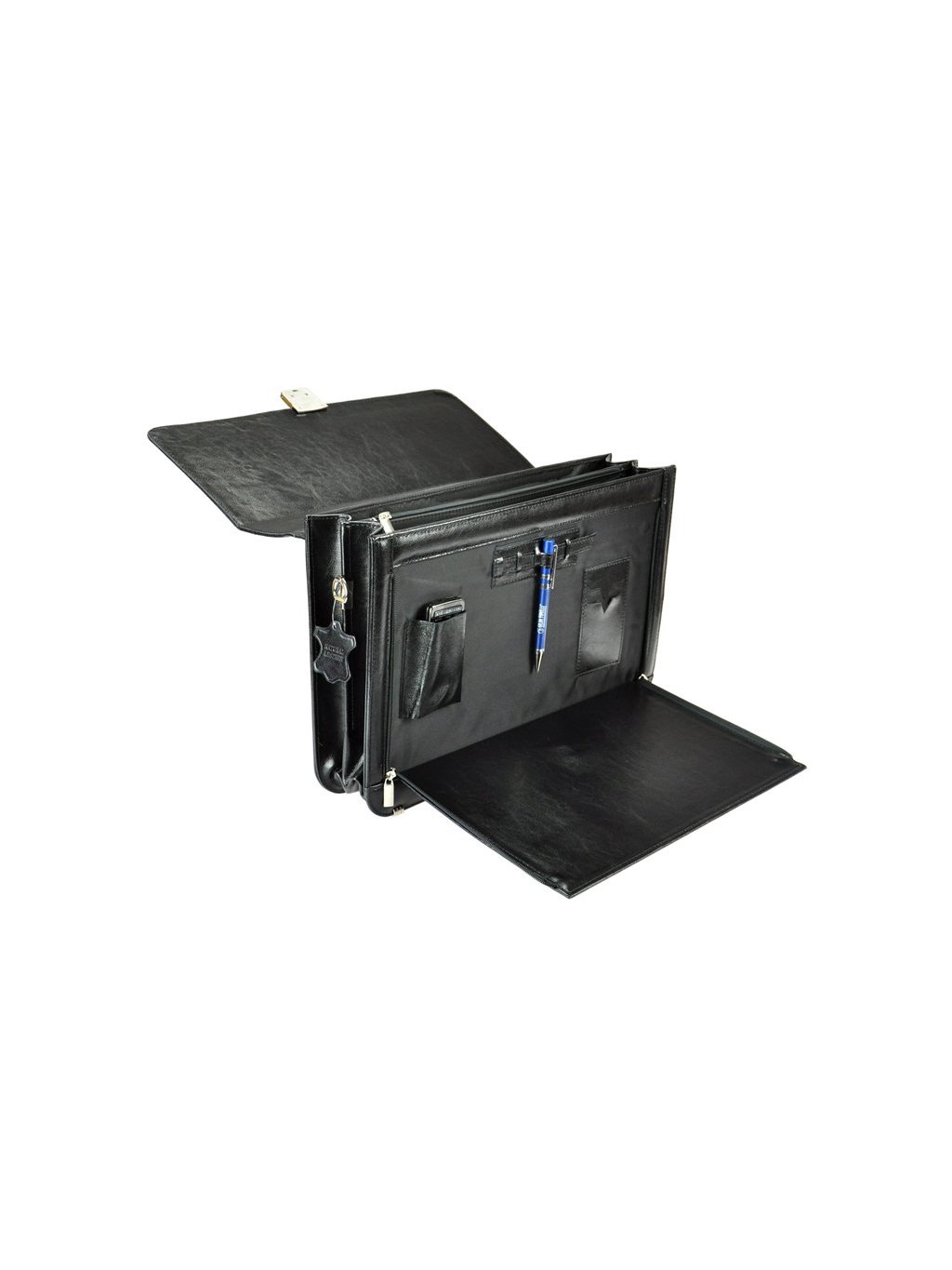 Klasická pánská business aktovka Stefania ušitá z pravé kůže v klasické v černé barvě. Aktovka se uzavírá klopou s klasickým kovovým kovovým zapínáním na zámek. Uvnitř je aktovka rozdělena zipovou separací na dvě části, jedna část obsahuje poutka na pohodlné uchycení notebooku. Druhá část obsahuje kapsičku na vizitky a mobilní telefon, i praktické poutka na psací potřeby. Přední strana aktovky je vyklápěcí. Kování na aktovce je stříbrné barvy. Logo firmy Stefania naleznete vyražené na klopně.