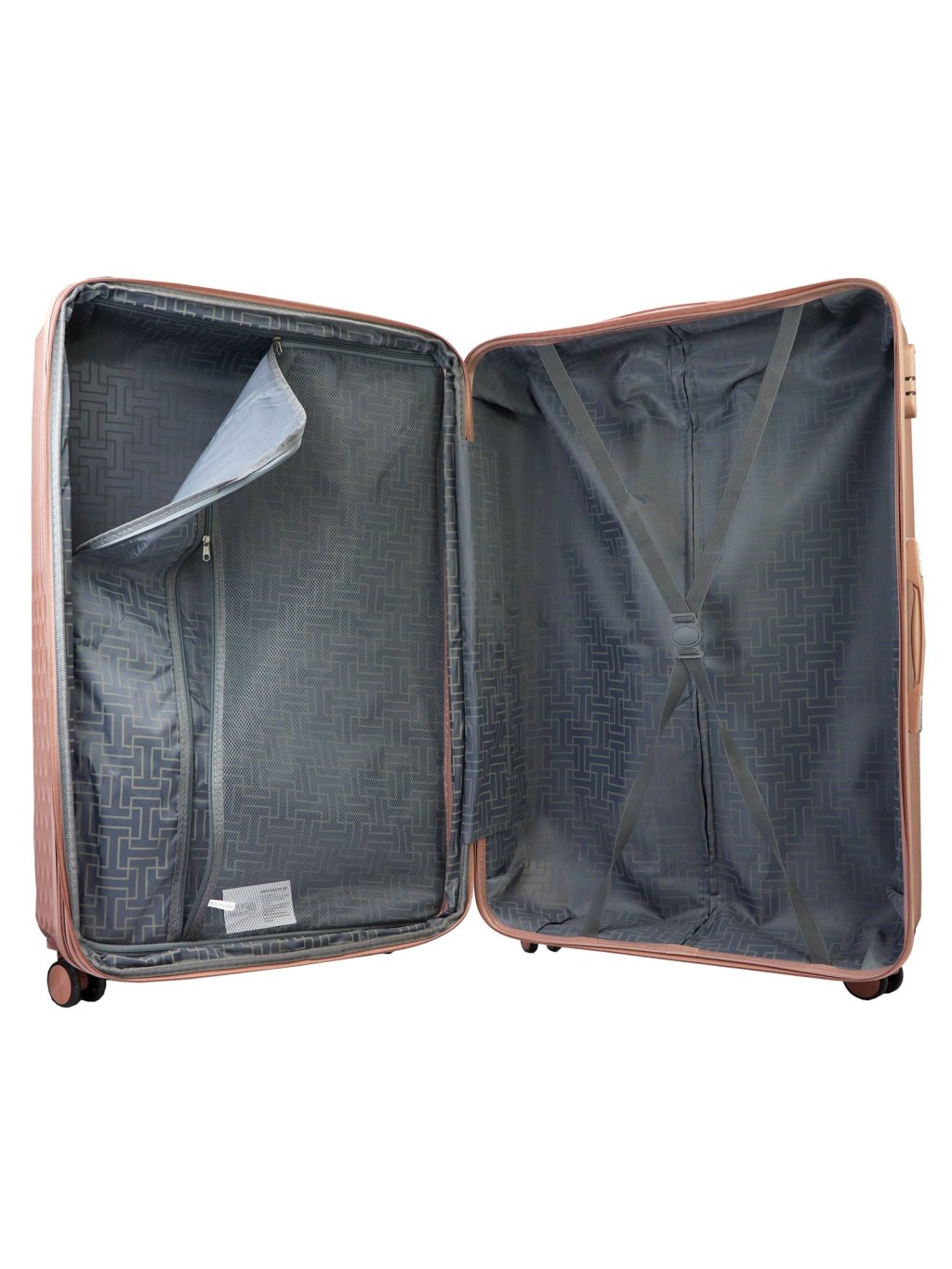 Prostorný kufr navržený pro maximální ochranu a pohodlí při cestování. Vyroben z pevného ABS materiálu, který zajišťuje vysokou odolnost vůči nárazům a mechanickému poškození. Kufr je vybaven čtyřmi dvojitými otočnými kolečky, teleskopickou rukojetí pro snadnou manipulaci a pogumovanými madly pro pohodlné zvedání. Bezpečnost zajišťuje integrovaný číselný zámek, který chrání obsah před nepovolaným přístupem. Přední stranu zdobí smaltované logo značky Leonardo da Vinci. Vnitřní prostor je podšitý odolnou textilií a členěný na hlavní komoru s elastickými popruhy pro zajištění oděvů a samostatnou přihrádku uzavíratelnou na zip.