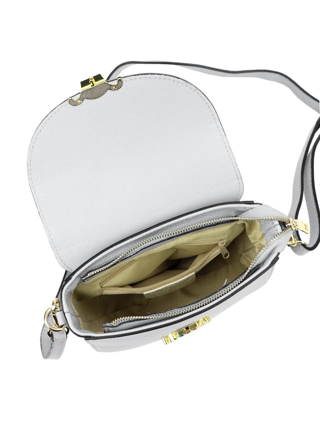 Menší kožená kabelka přes rameno ušitá z přírodní kůže potěší svým nadčasovým vzhledem a praktičností. Vnitřek tvoří jedna hlavní kapsa podšitá látkou, doplněná zipově uzavíratelnou kapsičkou na drobnosti. Bezpečné uzavření zajišťuje kombinace zipu a klopy s ozdobným kovovým zapínáním. Nastavitelný dlouhý popruh umožňuje pohodlné nošení jak na rameni, tak křížem přes tělo.