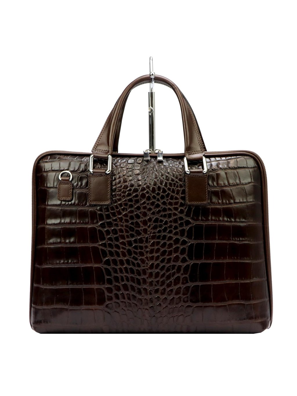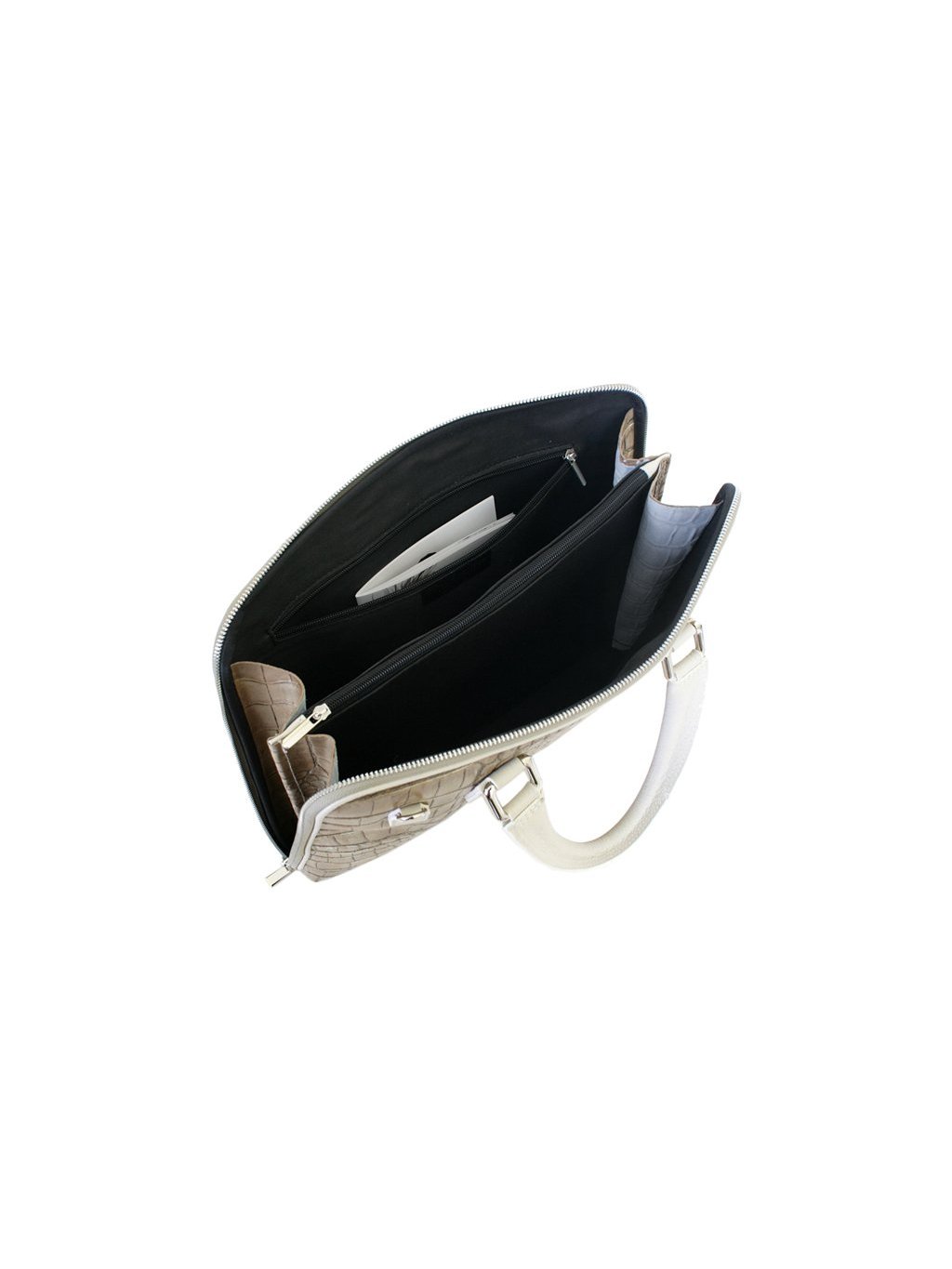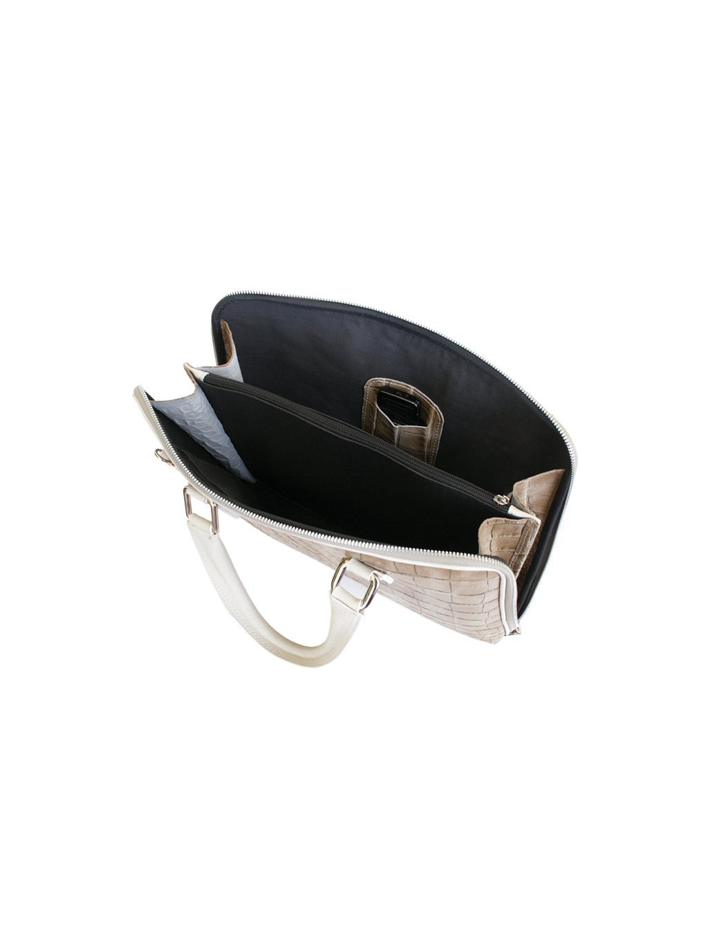 Tato dámská kožená aktovka ušitá z hladké hovězí kůže ve které je vyražený moderní krokodýlí vzor. Výhodou této aktovky je zip, který je po celém obvodu aktovky, proto jde doširoka rozevřít a je velmi přehledná. Aktovka je rozdělena zipovou separací na dvě části. V první části je kapsička na mobilní telefon, ve druhé je praktická kapsička na zip. Aktovka se dá nosit v ruce, na předloktí a díky širokému řemínku se dá nosit pohodlně i přes rameno.