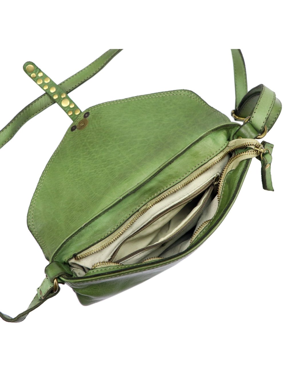 Klasická kabelka typu crossbody. Taška je ručně šitá a barvená podle nejnovějších trendů v nejlepších italských koželužnách, díky čemuž je každý kus výjimečný a jedinečný. Proměnlivá struktura usně je součástí designu výrobku a svědčí o jeho originalitě. Taška vintage vzhledu se vyznačuje tím, že je velmi jemná a příjemná na dotek. Přístup do vnitřní části tašky je zajištěn dvojitou klopou s magnetickou sponou a zipem. Vnitřek je podšitý. Uvnitř dvě kapsy: otevřená a uzavíratelná na zip. Další praktická kapsa je na zadní straně.