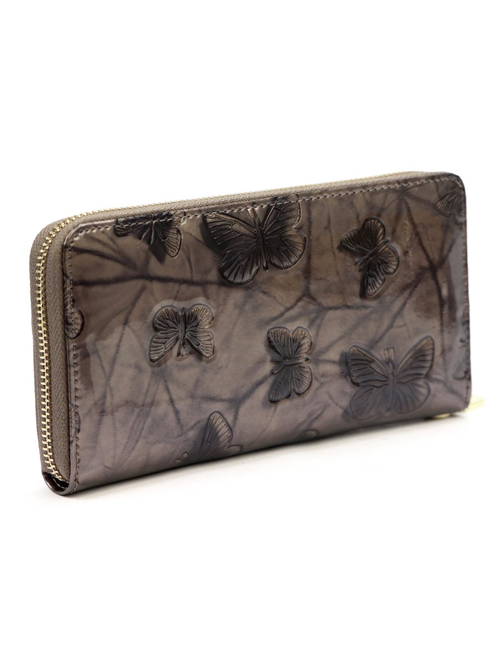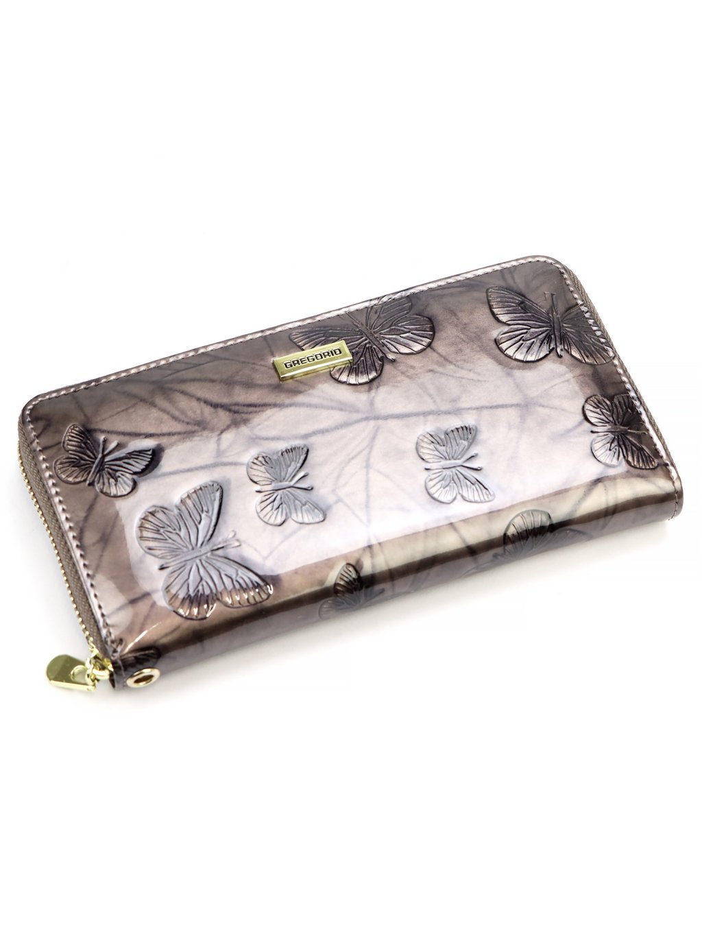 Tato dámská kožená peněženka penálového typu je ušitá přírodní lakované kůže. Celkový vzhled peněženky působí velmi luxusně a elegantně. Peněženka se uzavírá zipem, uvnitř obsahuje fochy na papírové bankovky, přihrádky na karty, doklady a zipově uzavíratelný mincovník na drobné. Na přední straně je zlaté logo výrobce.