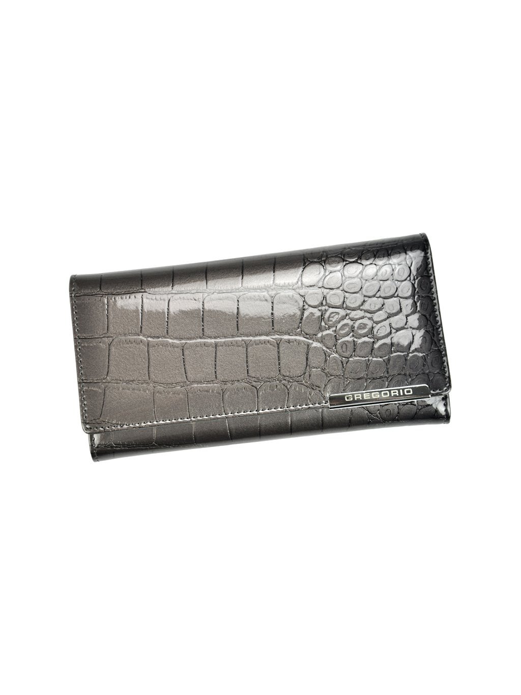 Tato dámská kožená peněženka značky Gregorio je ušitá z přírodní lakované kůže, ve které je vyražený krokodýlí vzor. Celkový vzhled peněženky působí velmi vkusně a elegantně. Peněženka se zavírá na druk. Uvnitř nalezneme přihrádky na papírové bankovky, mincovník s kovovým zapínáním, přihrádky na platební karty, věrnostní karty a doklady.