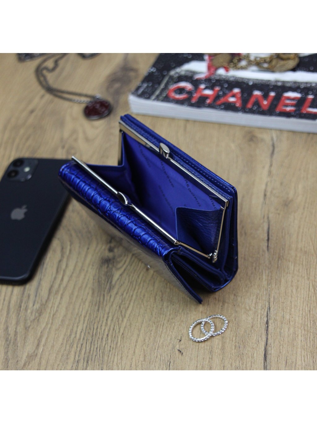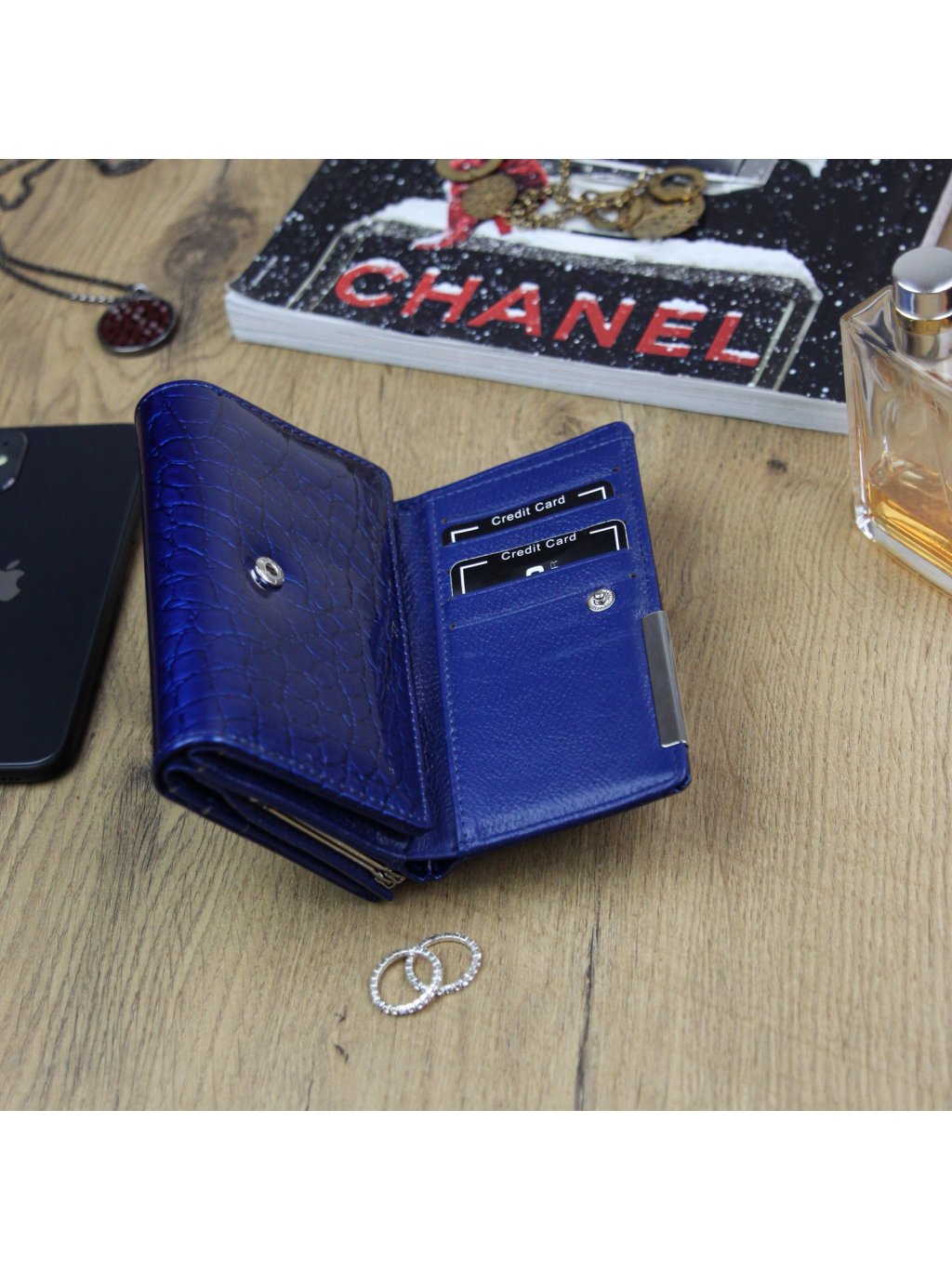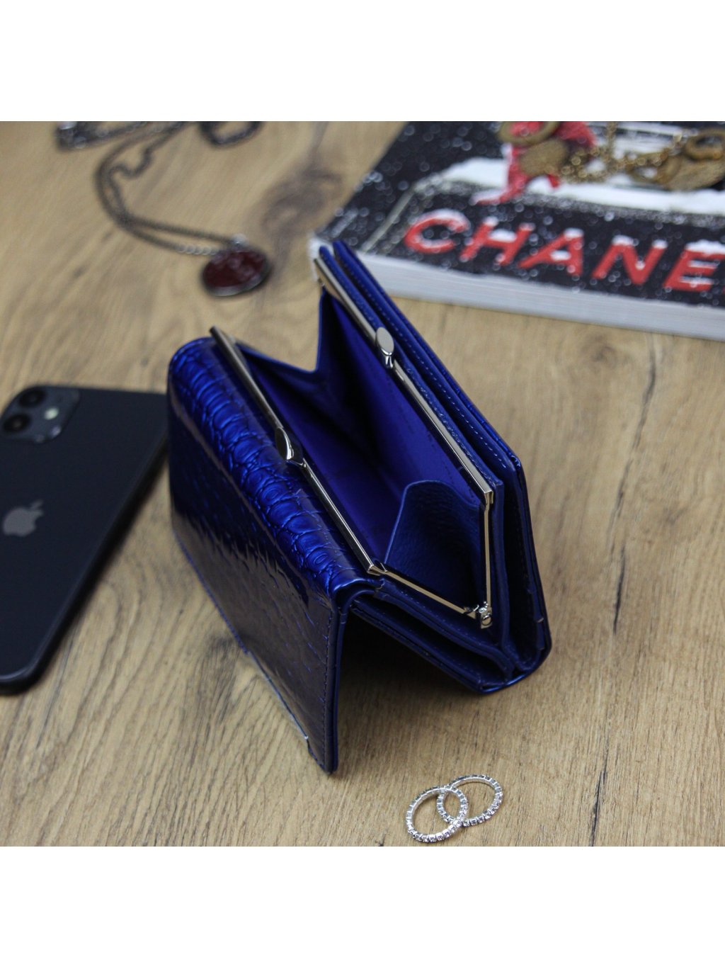 Dámská kožená peněženka, která je ušitá z lakované přírodní kůže, ve které je vyražený moderní krokodýlí vzor. Celá peněženka se uzavírá klopnou na druk, po jejím rozevření nabízí dostatek prostoru pro veškeré doklady, platební karty i věrnostní karty. Na vrchní straně peněženky se nachází foch, který je určený pro papírové bankovky. Na zadní straně je mincovník v kovovém rámu, který se uzavírá klipem. Vedle mincovníku je praktická klopna na druk pro další karty a doklady.