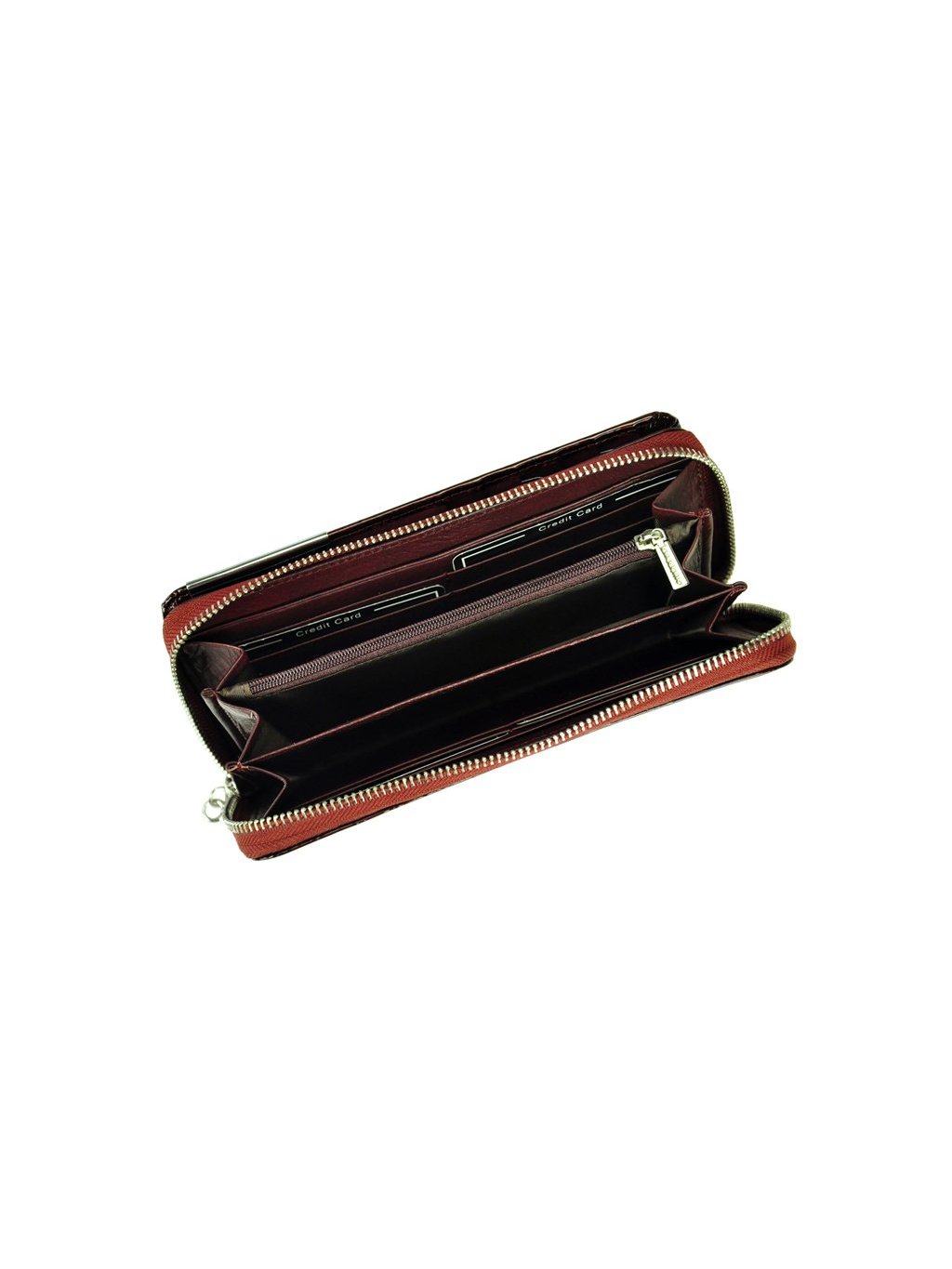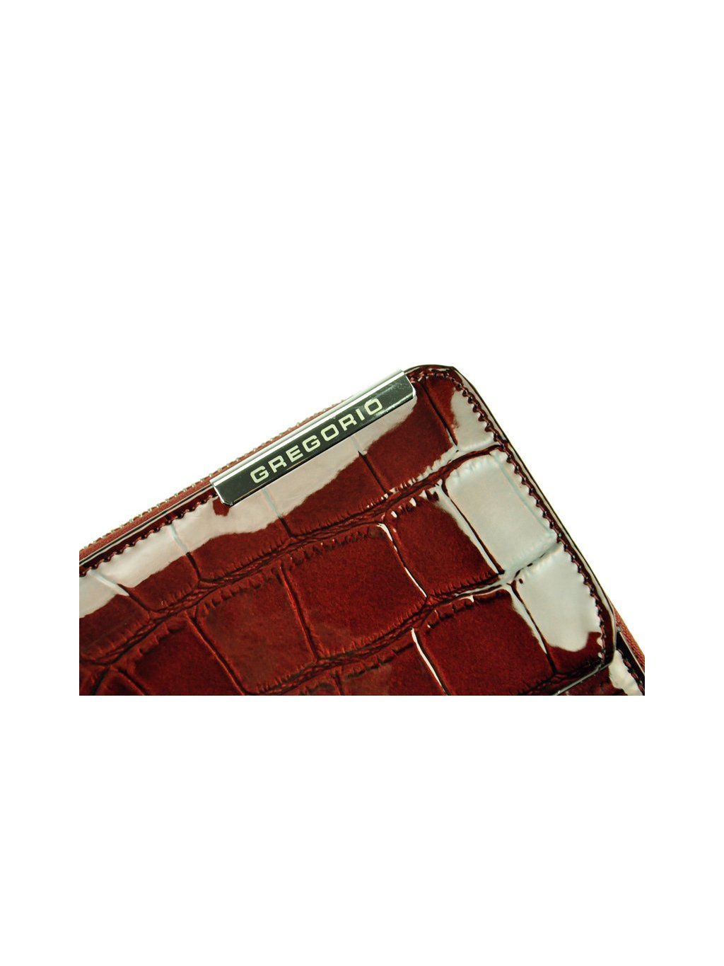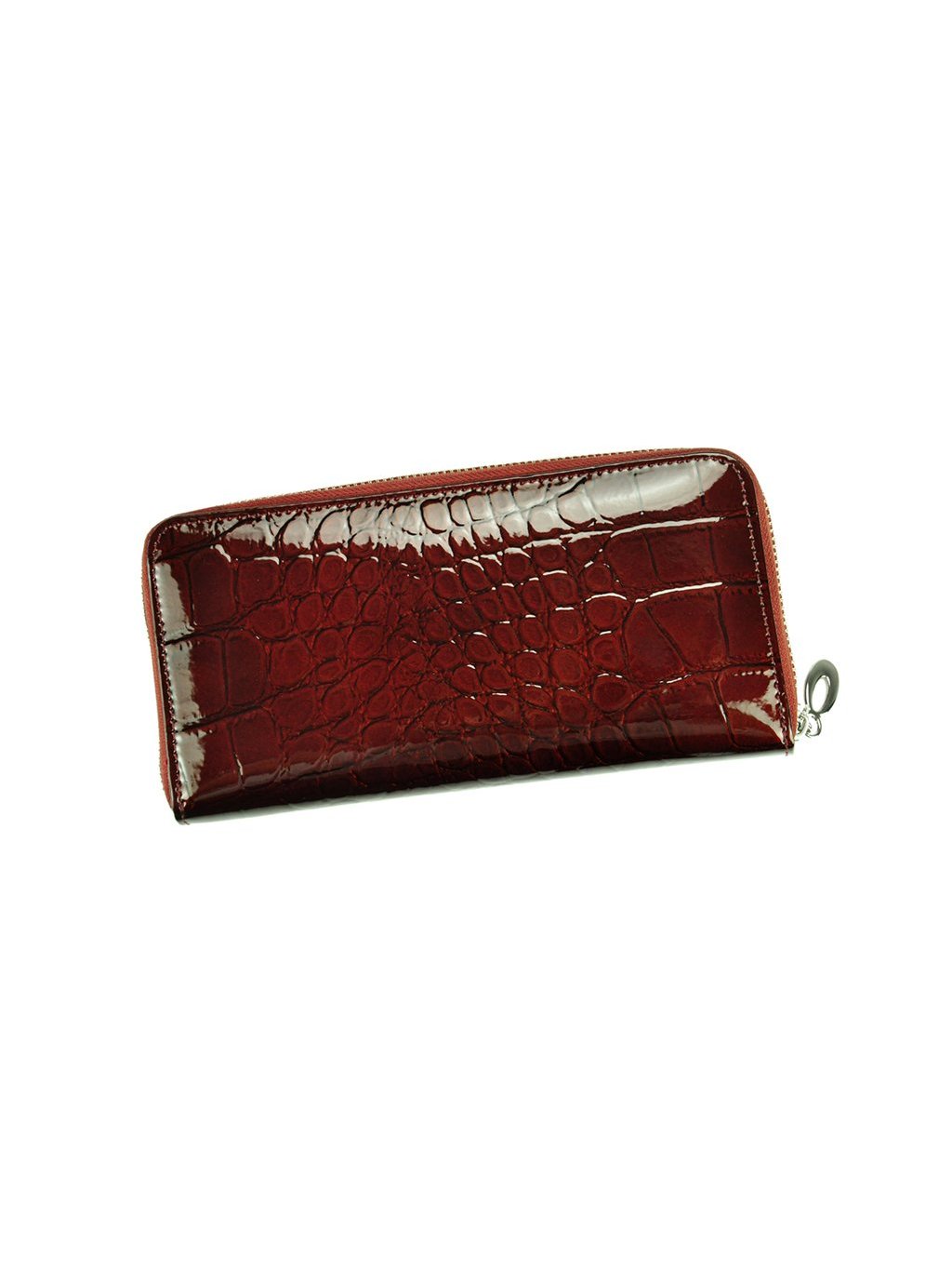 Velká dámská peněženka penálového typu vyrobená z přírodní lakované kůže. Vnitřek peněženky je podšitý látkou a obsahuje tři fochy na papírové bankovky, přihrádky na platební karty, věrnostní karty i doklady. Vše se uzavírá masivním kovovým zipem. Na přední straně peněženky se nachází klopna na druk, která obsahuje další praktické přihrádky na platební karty, věrnostní karty i doklady.