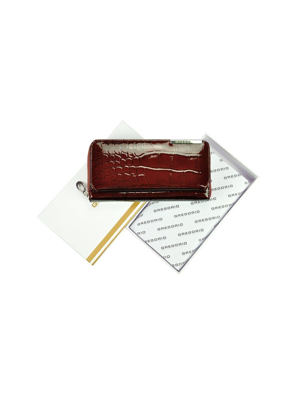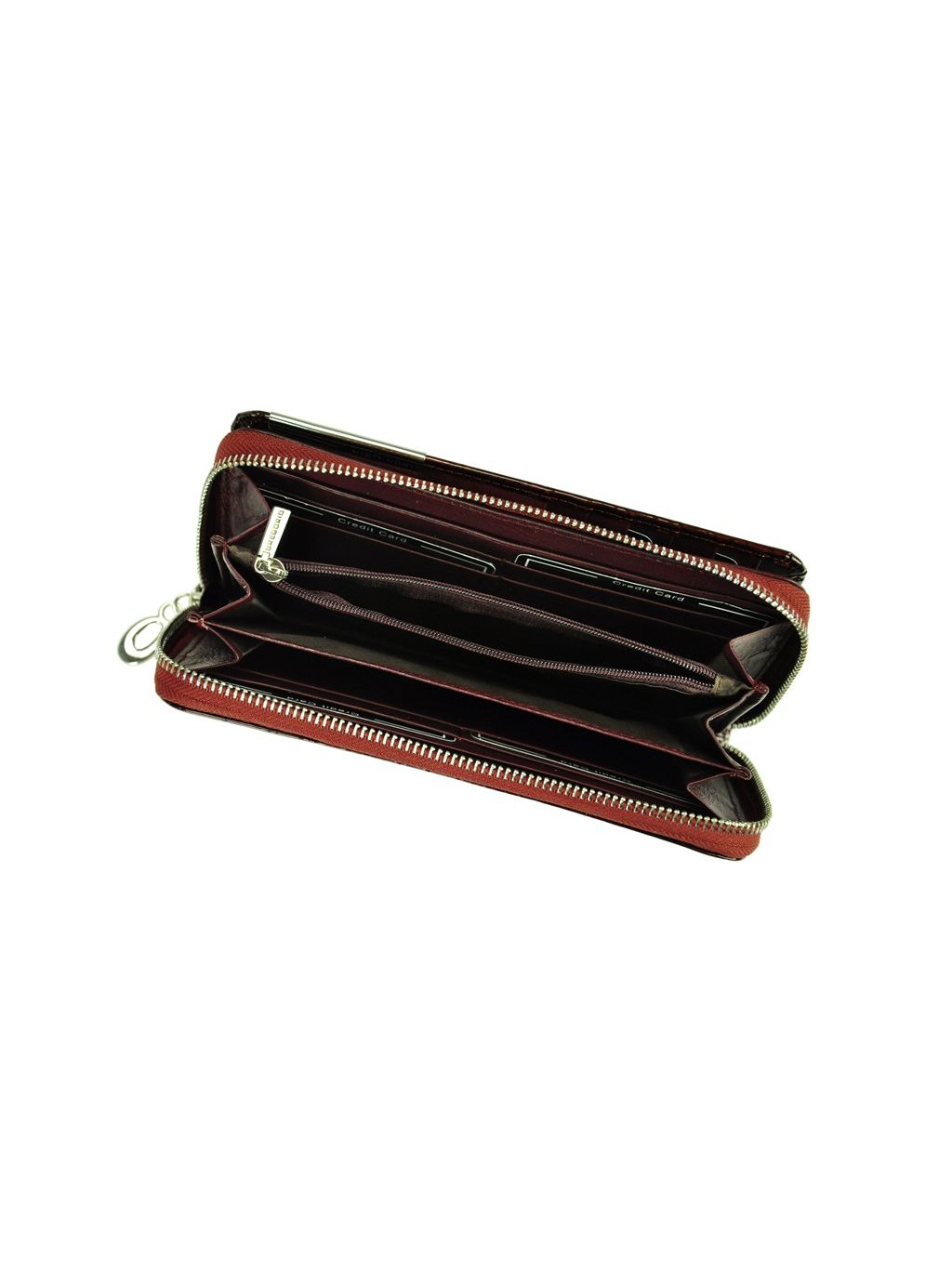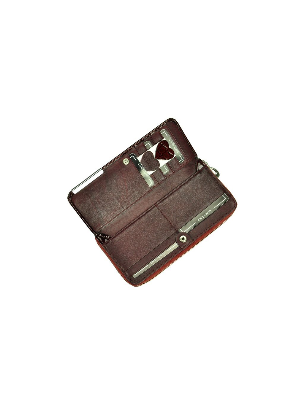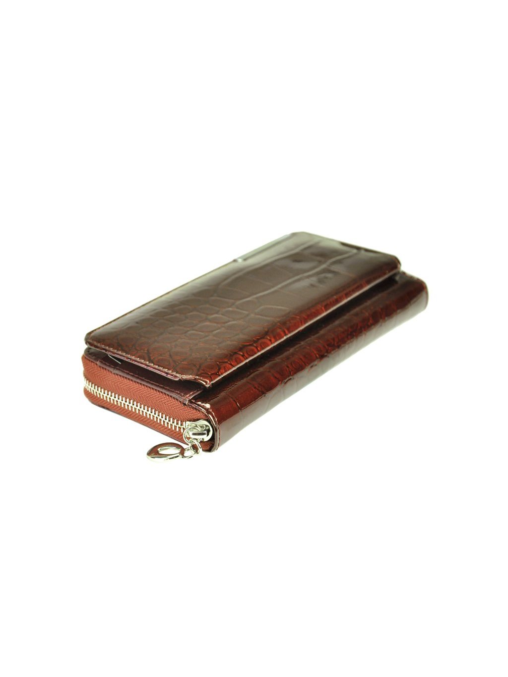 Velká dámská peněženka penálového typu vyrobená z přírodní lakované kůže. Vnitřek peněženky je podšitý látkou a obsahuje tři fochy na papírové bankovky, přihrádky na platební karty, věrnostní karty i doklady. Vše se uzavírá masivním kovovým zipem. Na přední straně peněženky se nachází klopna na druk, která obsahuje další praktické přihrádky na platební karty, věrnostní karty i doklady.