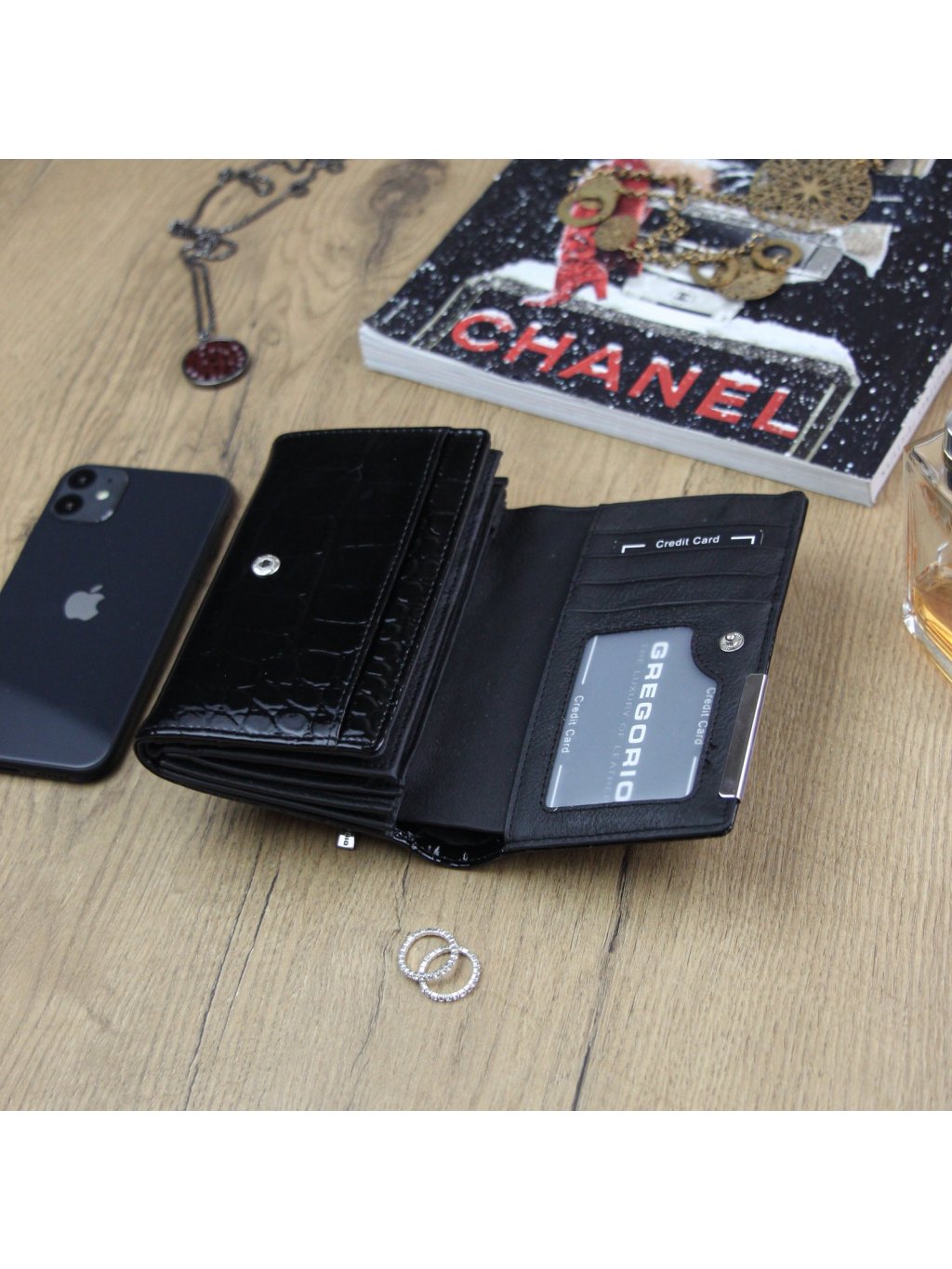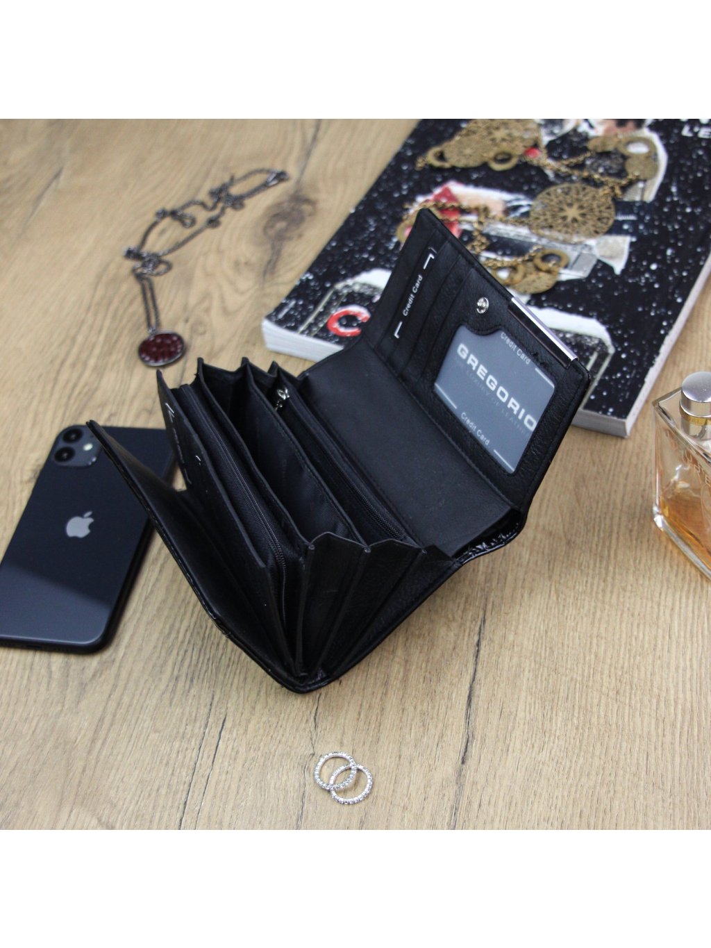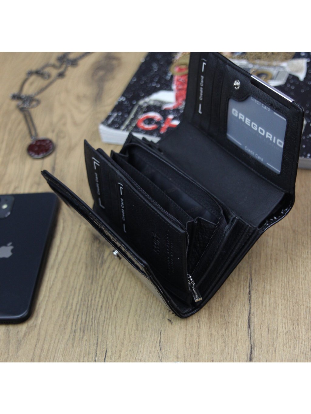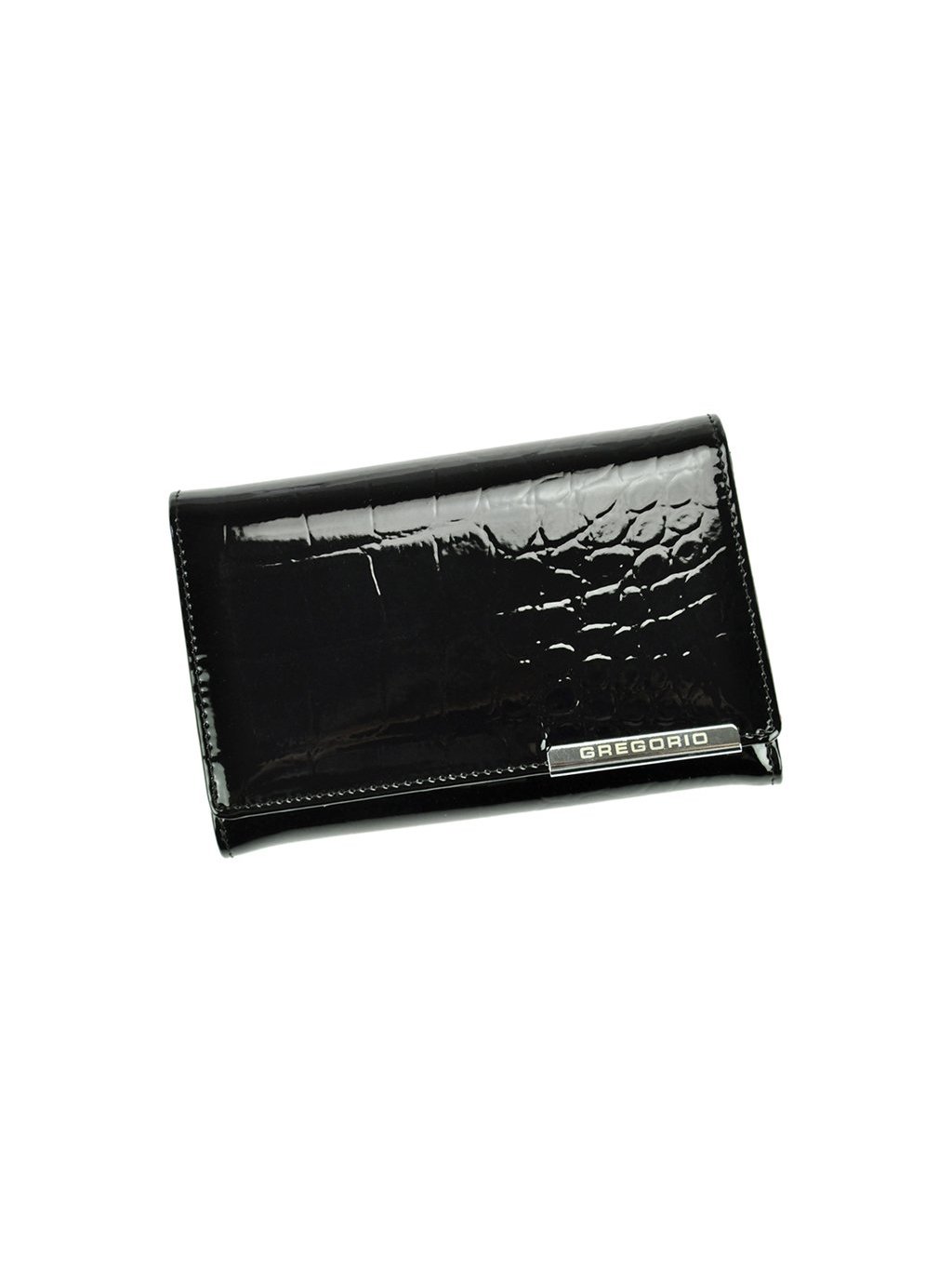 Stylová dámská peněženka ušitá z přírodní lakované kůže, ve které je vyražený krokodýlí vzor. Na přední straně peněženky se nachází logo značky Gregorio výrobce. Celá peněženka je uzavíratelná klopou s drukem, uvnitř nalezneme fochy na papírové bankovky, zipově uzavíratelný mincovník a praktické přihrádky na kreditní karty, věrnostní karty nebo doklady. Na zadní straně peněženky se nachází zipem uzavíratelná kapsa.
