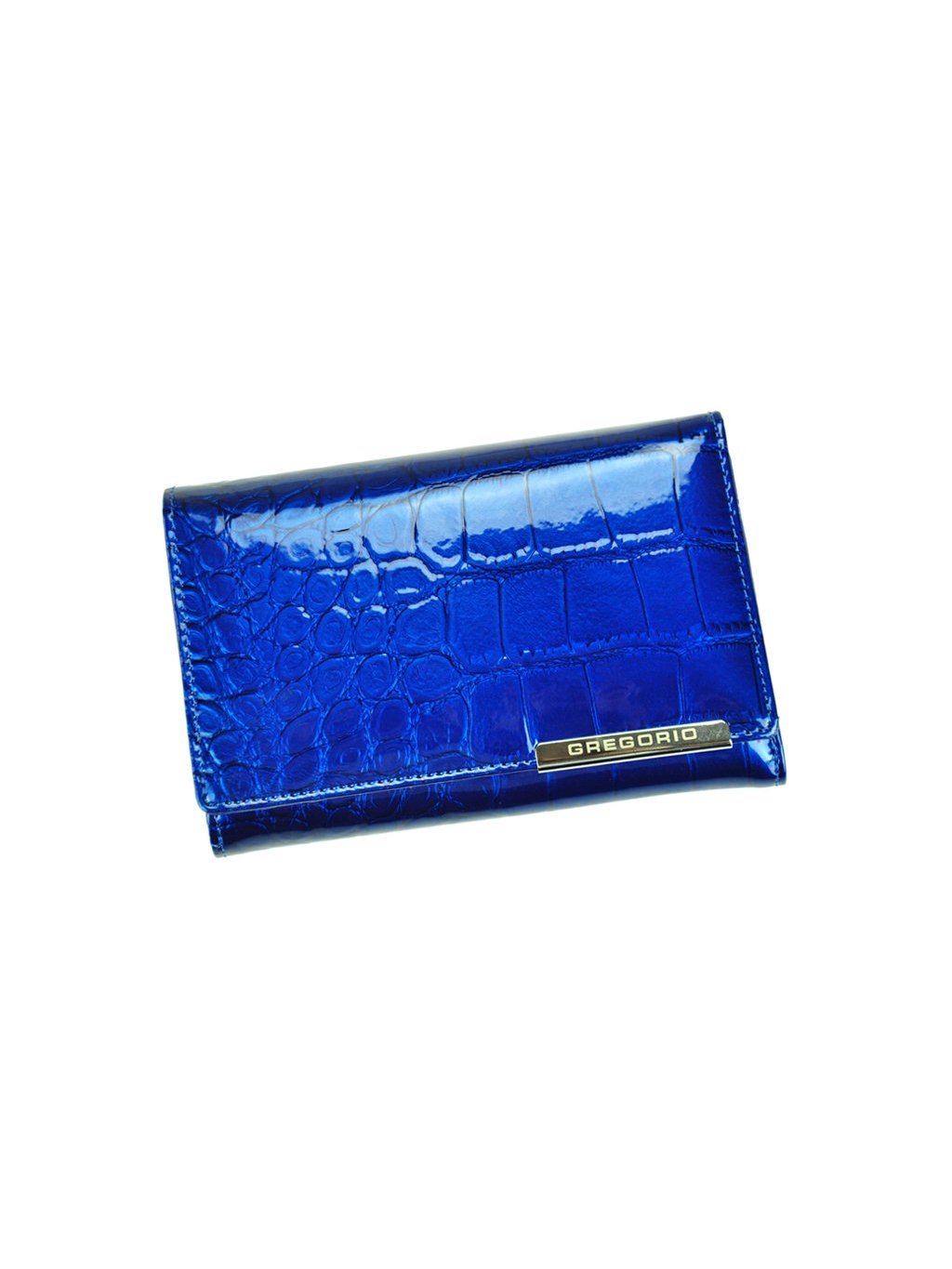 Stylová dámská peněženka ušitá z přírodní lakované kůže, ve které je vyražený krokodýlí vzor. Na přední straně peněženky se nachází logo značky Gregorio výrobce. Celá peněženka je uzavíratelná klopou s drukem, uvnitř nalezneme fochy na papírové bankovky, zipově uzavíratelný mincovník a praktické přihrádky na kreditní karty, věrnostní karty nebo doklady. Na zadní straně peněženky se nachází zipem uzavíratelná kapsa.