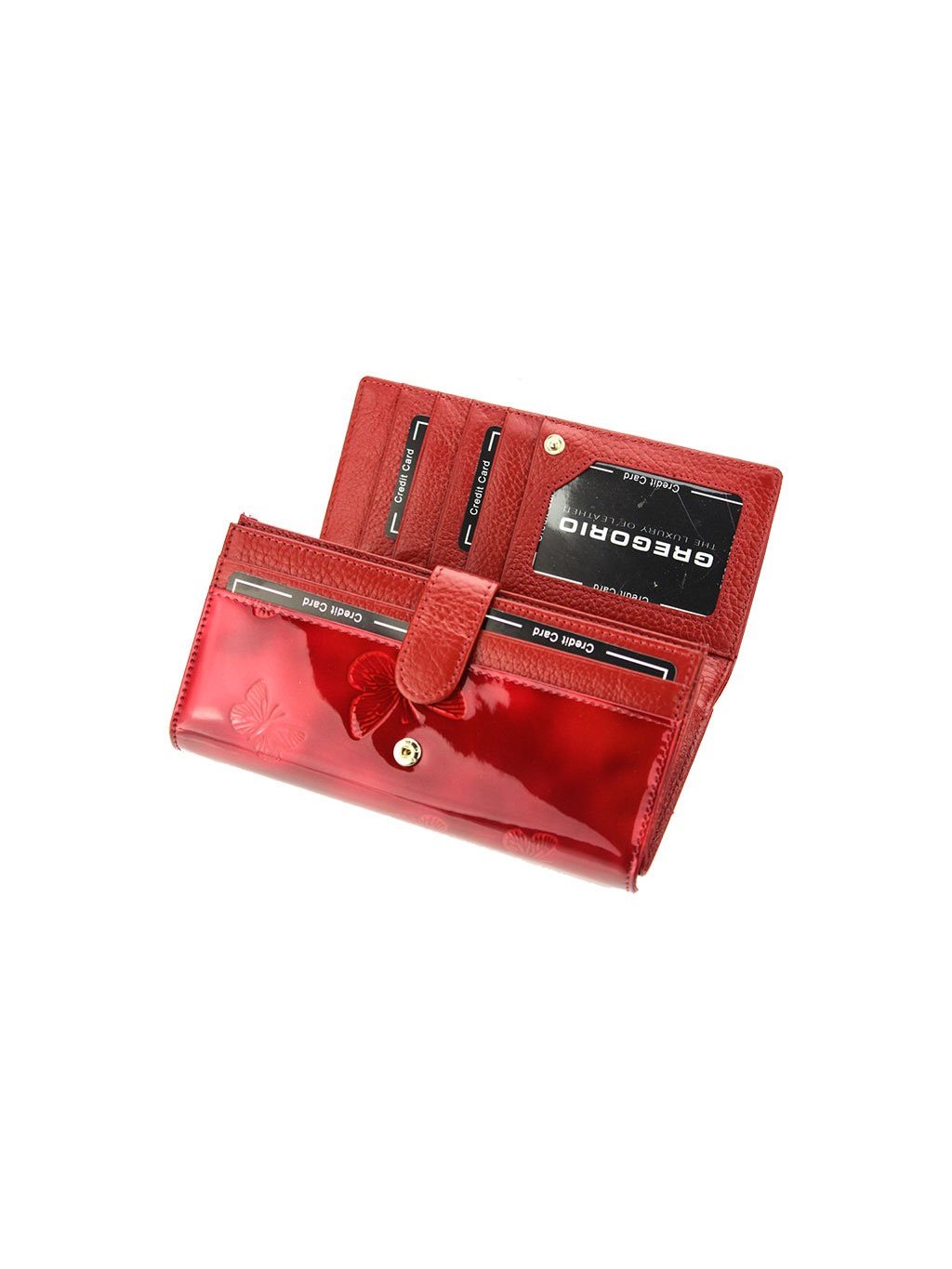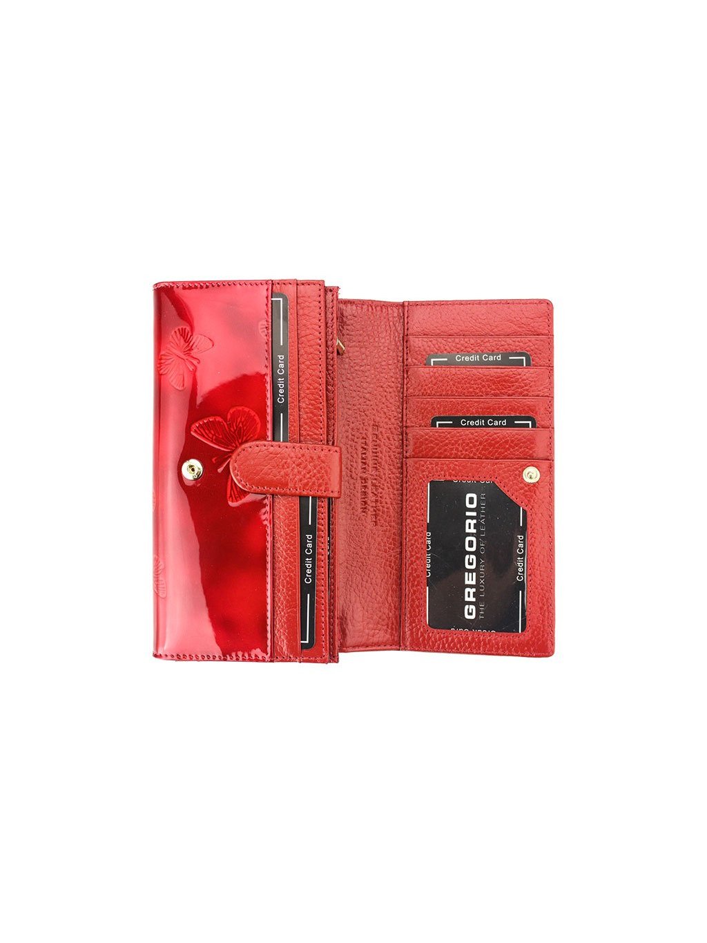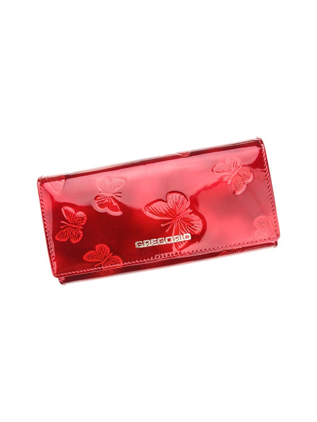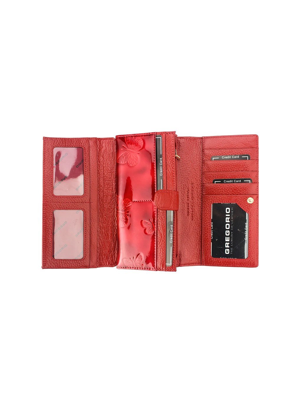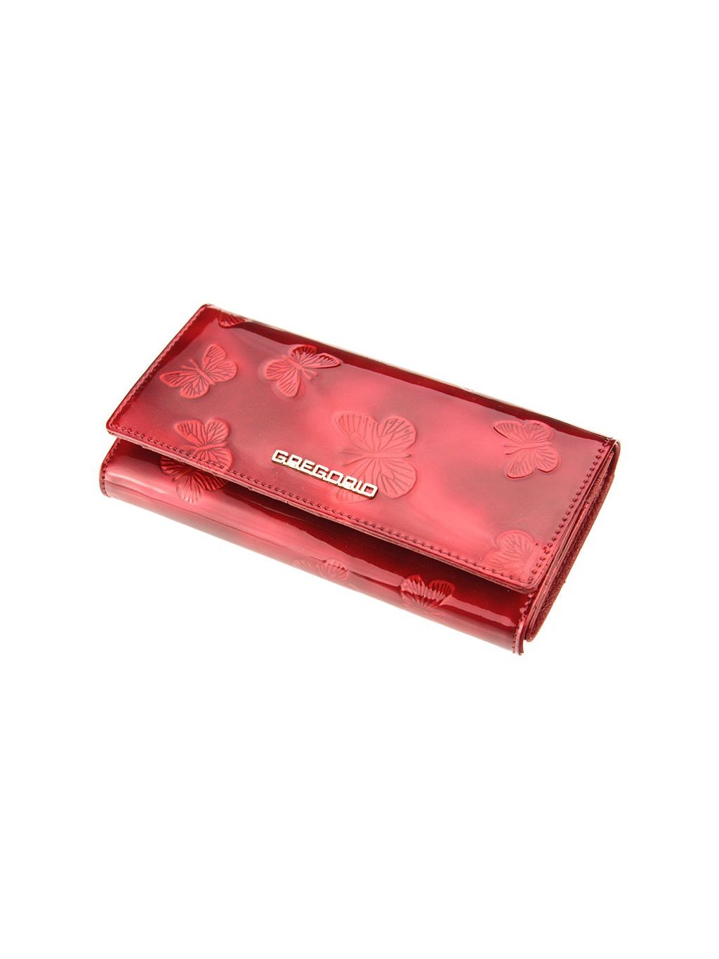 Dámská kožená peněženka značky Gregorio ušitá z hladké lakované kůže šedé barvy s jemným vzorem. Peněženka se se zavírá na klopnou na patentku, uvnitř nalezneme tři samostatné fochy na papírové bankovky předělené separací. Jedna separace je zipově uzavíratelná a je tak vhodná na drobné mince. Velkou výhodou tohoto modelu druhá vnitřní klopna uzavíratelná zápinkou, pod kterou se nachází další praktické přihrádky na karty anebo doklady. Další zipově uzavíratelná kapsička se nachází i na zadní straně peněženky. Hledáte-li prostornou peněženku s dostatkem prostoru na karty, doklady a další nezbytnosti je tento model určen právě vám.