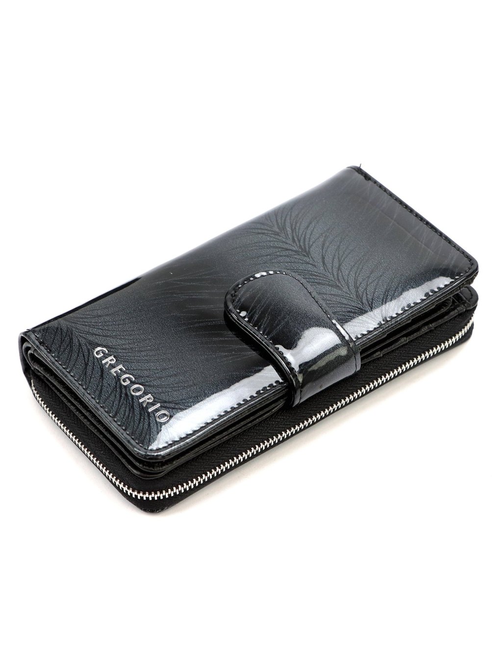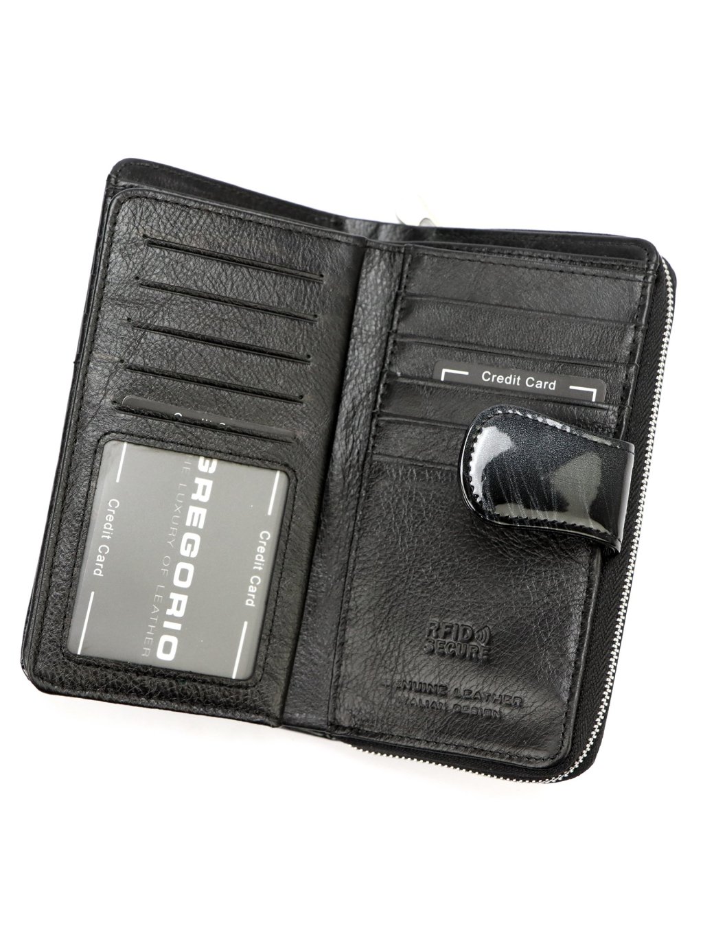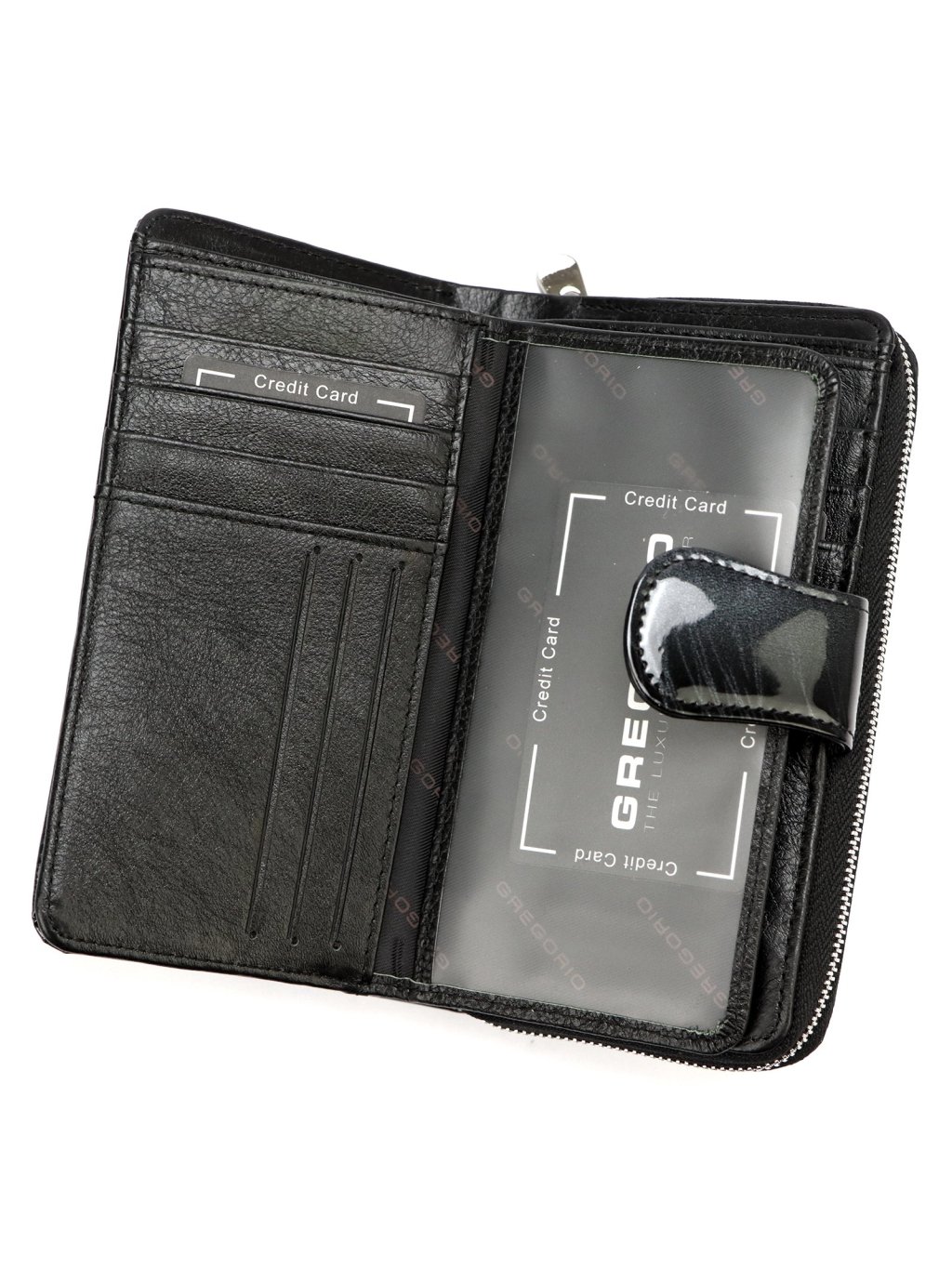 Tato kompaktní dámská kožená peněženka je ušitá z přírodní kůže. Celá peněženka je rozdělena na dvě části. První část obsahuje mincovník, který se uzavírá na zip. Druhá část peněženky obsahuje přihrádky, které jsou určeny na věrnostní či kreditní karty a doklady. Přihrádky na papírové bankovky jsou ve vrchní části peněženky. Peněženka se uzavírá klopnou na druk a je dodávána v papírové krabičce.