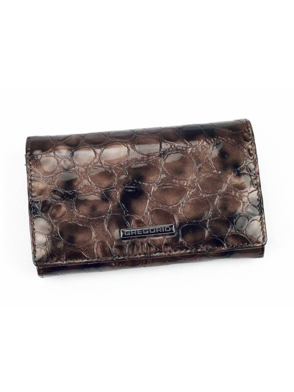 Tato dámská kožená peněženka Gregorio je ušitá z hladké přírodní lakované kůže. Celkový vzhled peněženky působí velmi vkusně a elegantně. Na vnější straně nalezneme decentní stříbrné logo výrobce, uvnitř objevíme mincovník s kovovým zapínáním, kapsu se zipem a fochy na papírové bankovky. Přihrádky na doklady, kreditní karty a vizitky nalezneme na druhé části peněženky.