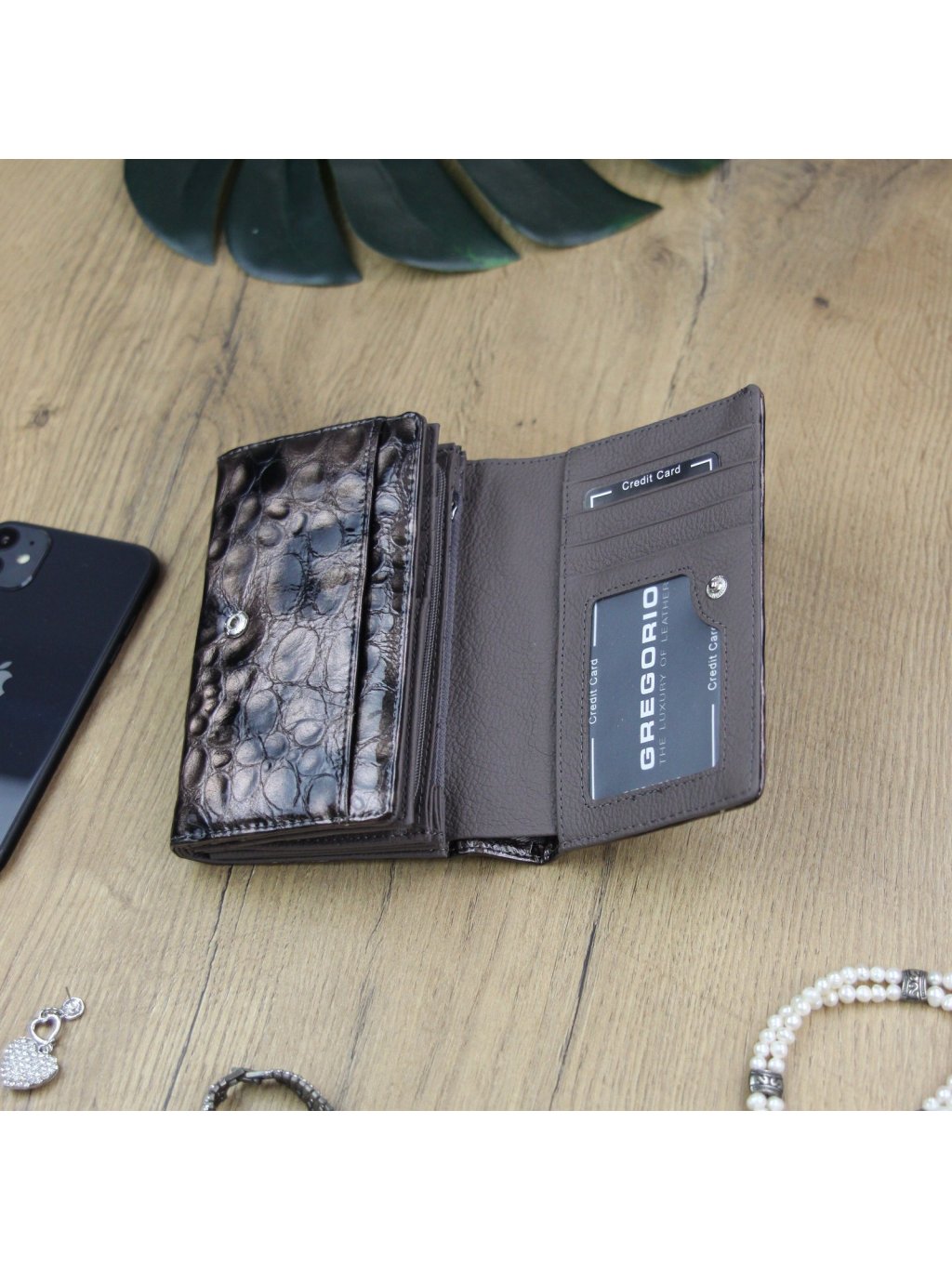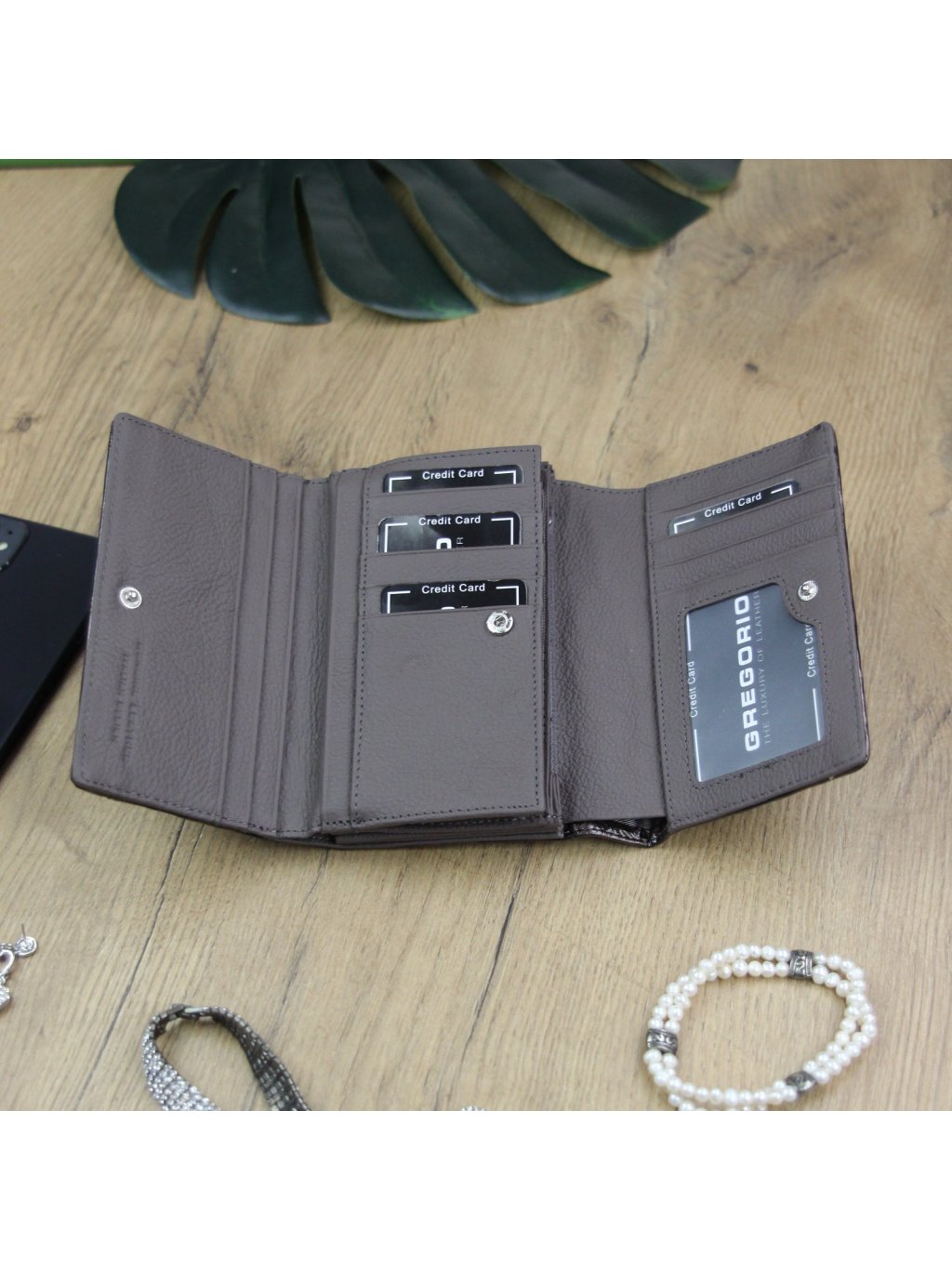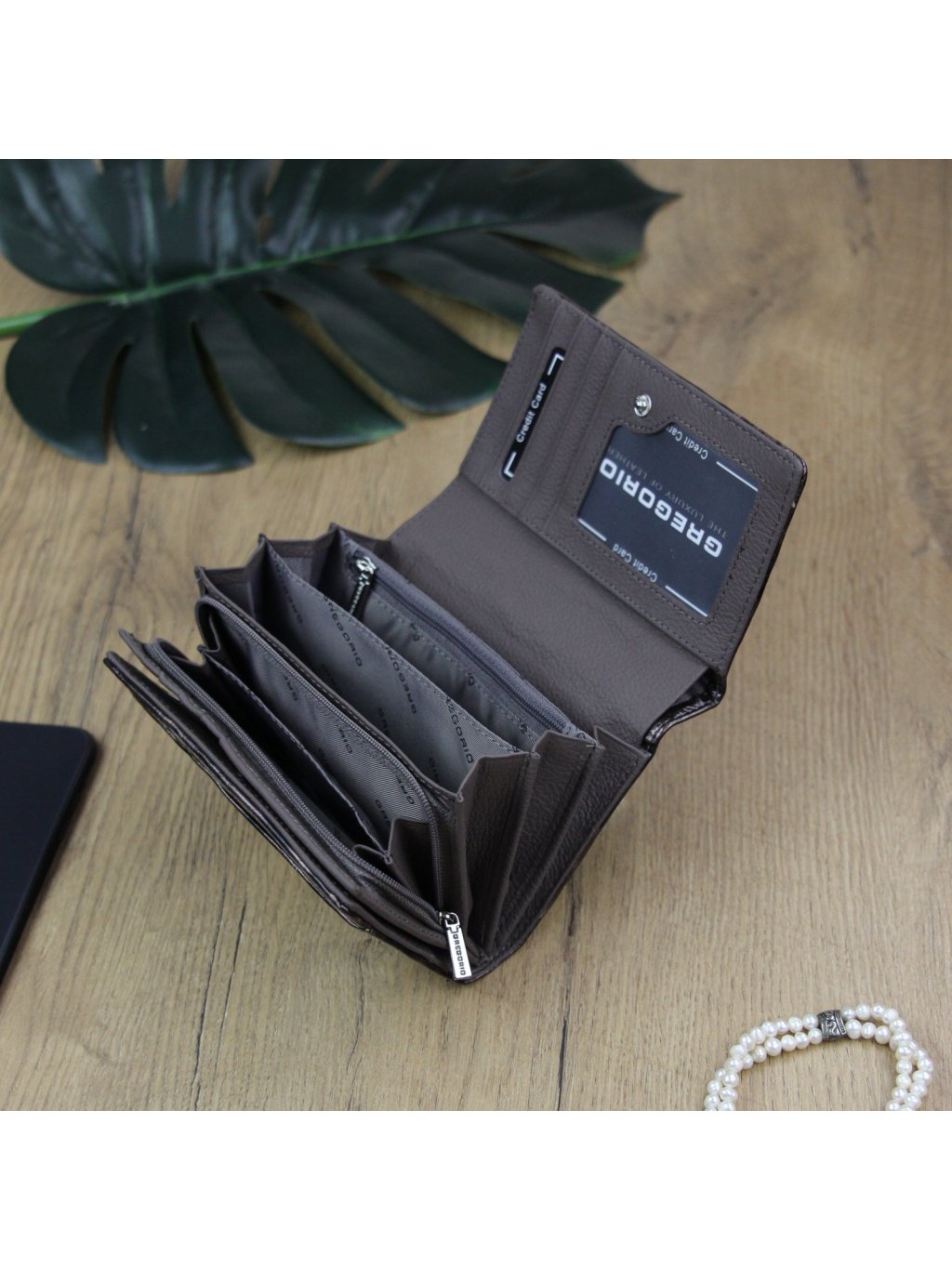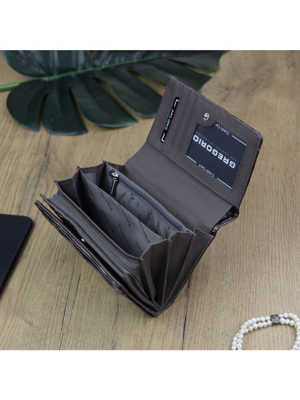 Tato peněženka Gregorio je ušitá z pravé přírodní kůže, ve které se nachází vytlačený vzor, který dává peněžence velmi originální vzhled. Celá peněženka je uzavíratelná klopou s drukem, uvnitř nalezneme fochy na papírové bankovky, zipově uzavíratelný mincovník a praktické přihrádky na kreditní karty nebo doklady. Na zadní straně peněženky se nachází zipem uzavíratelná kapsa.