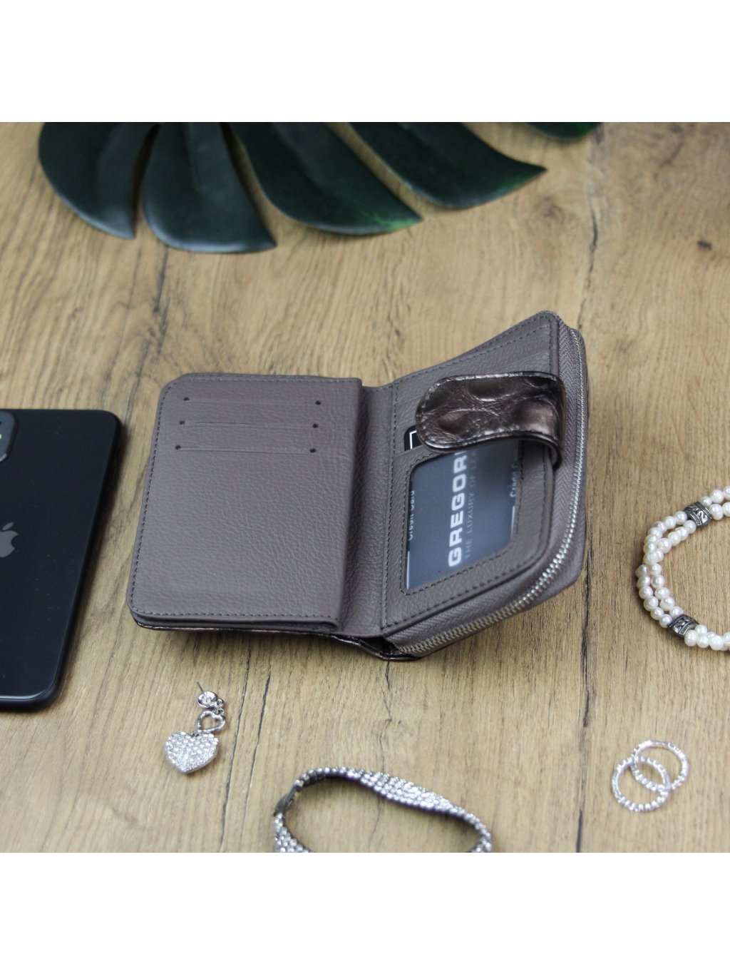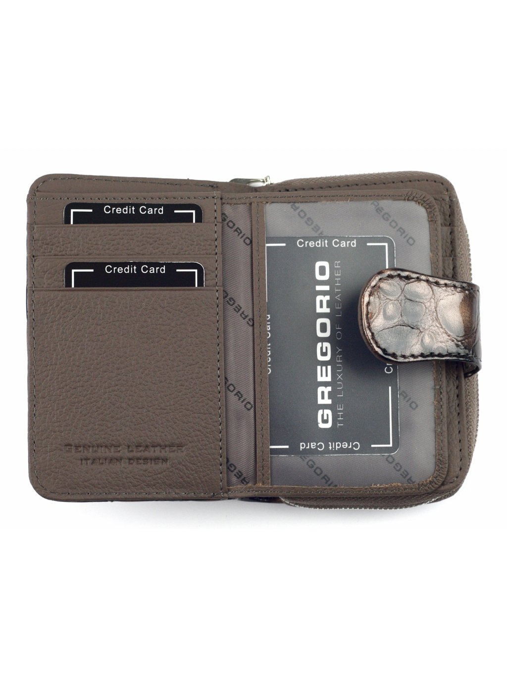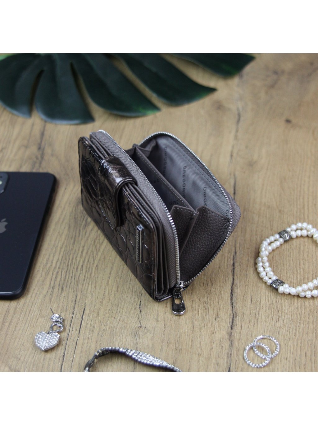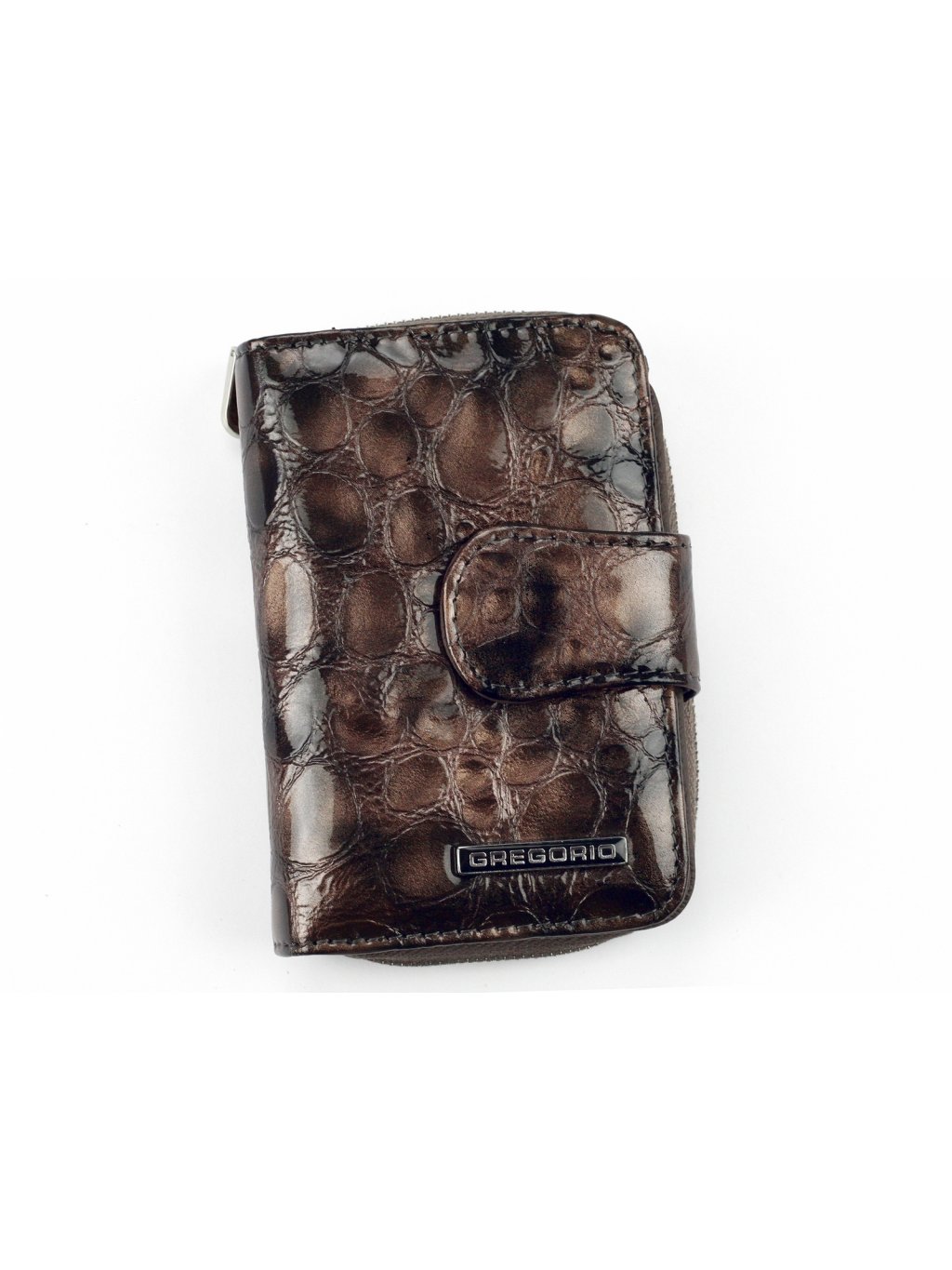 Tato moderní dámská peněženka Gregorio je ušitá z pravé přírodní kůže, ve které se nachází vytlačený vzor, který dává peněžence velmi originální vzhled. Celá peněženka je rozdělena na dvě části, mincovník, který se uzavírá zipem a zipovou separací je rozdělený na dvě části. Zip peněženky jde doširoka rozepnout a ulehčuje tak manipulaci s drobnými mincemi. Druhá část je na karty a se zapíná úzkou pinetkou na patentku. Kromě množství přihrádek na klasické karty, obsahuje i prostor pro doklady. Fochy pro papírové bankovky jsou na vrchní straně peněženky.