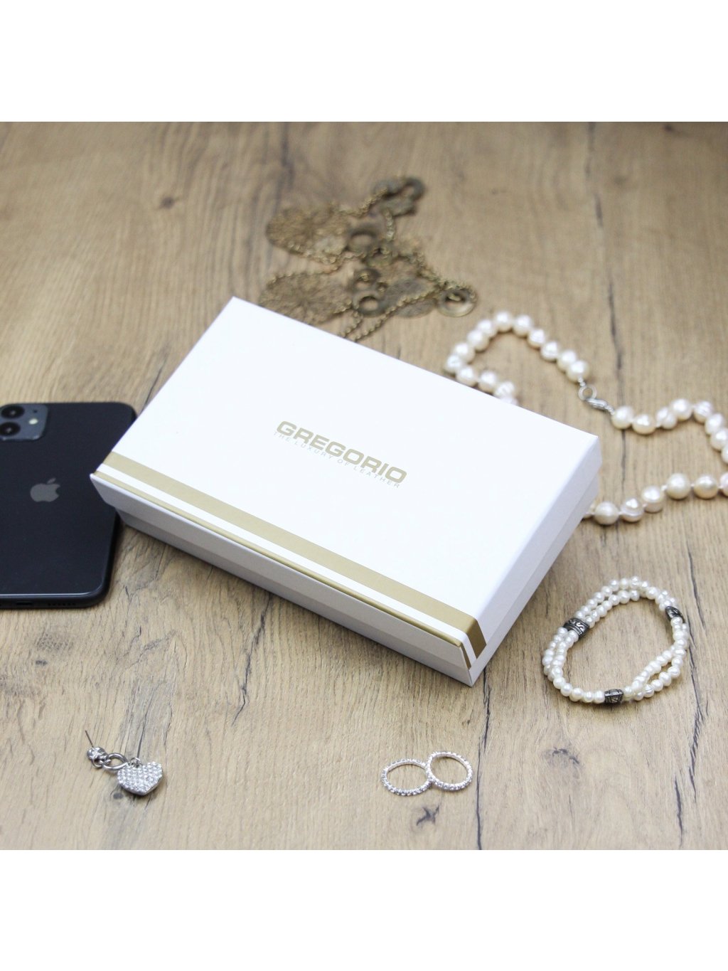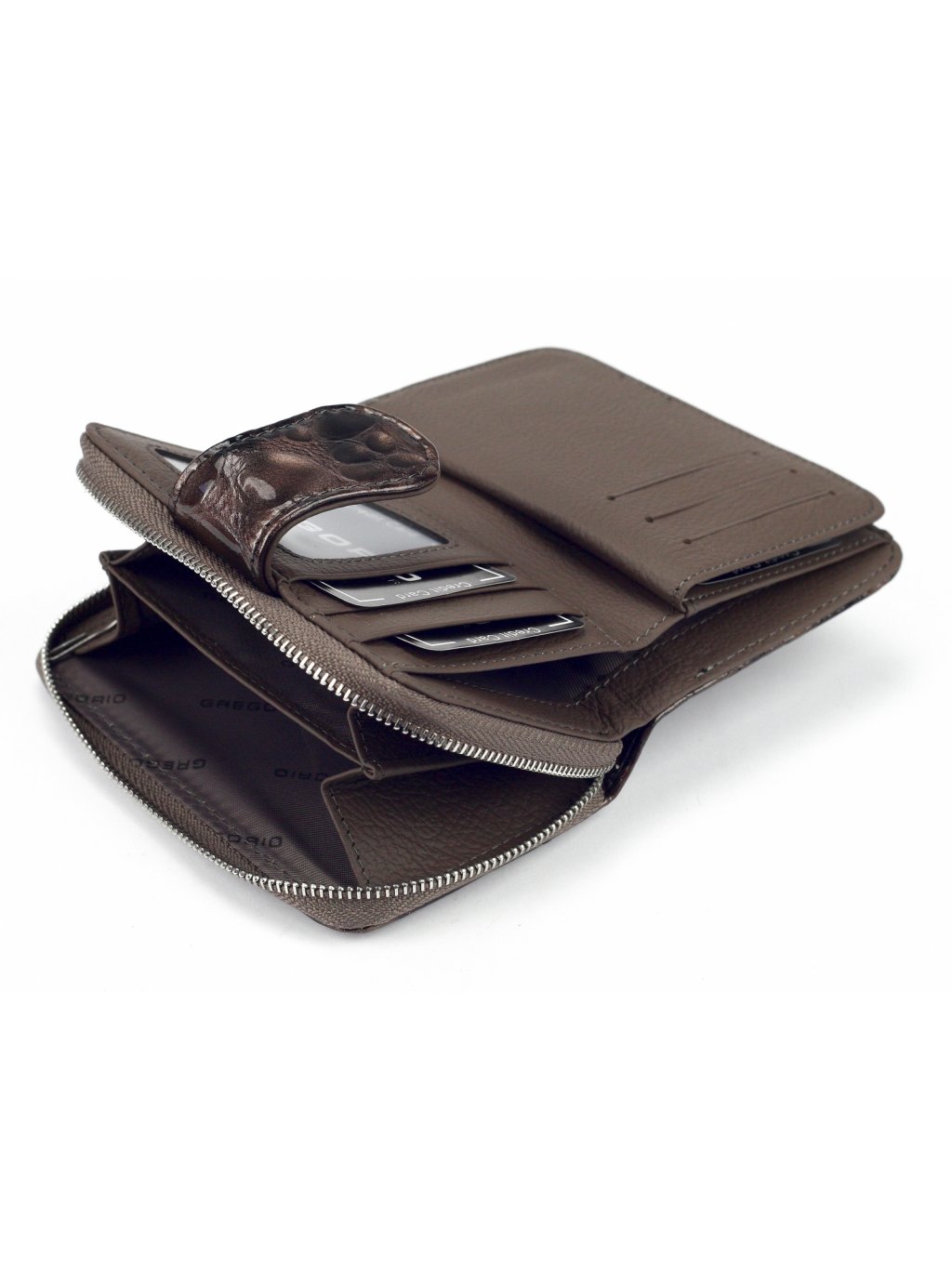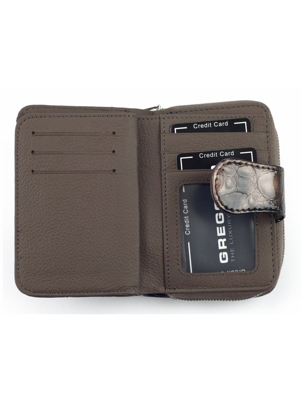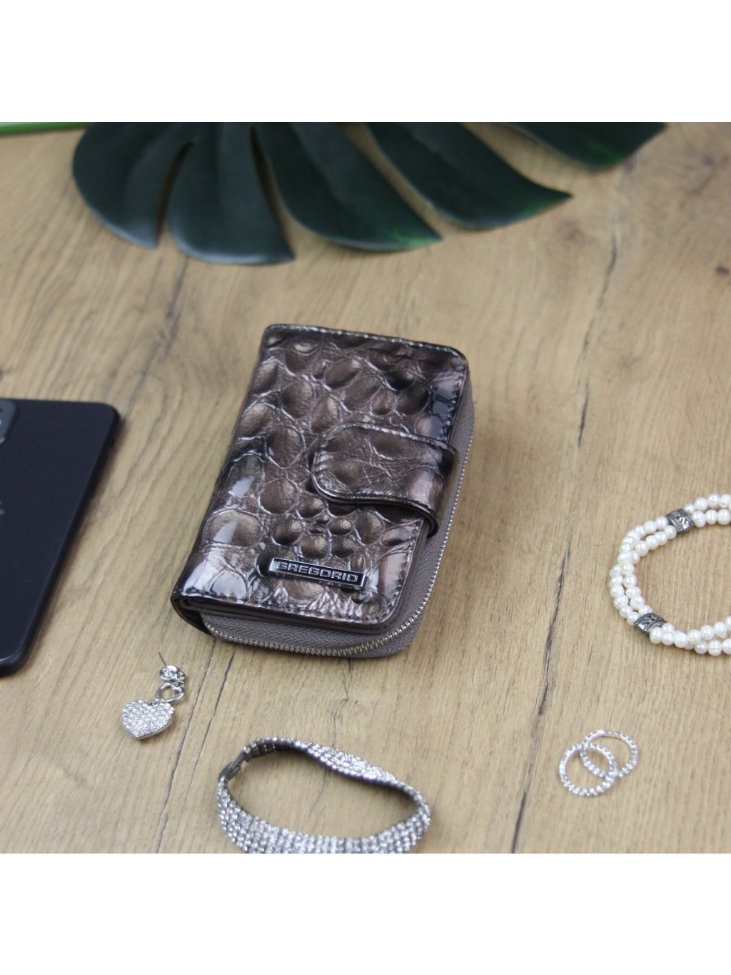 Tato moderní dámská peněženka Gregorio je ušitá z pravé přírodní kůže, ve které se nachází vytlačený vzor, který dává peněžence velmi originální vzhled. Celá peněženka je rozdělena na dvě části, mincovník, který se uzavírá zipem a zipovou separací je rozdělený na dvě části. Zip peněženky jde doširoka rozepnout a ulehčuje tak manipulaci s drobnými mincemi. Druhá část je na karty a se zapíná úzkou pinetkou na patentku. Kromě množství přihrádek na klasické karty, obsahuje i prostor pro doklady. Fochy pro papírové bankovky jsou na vrchní straně peněženky.