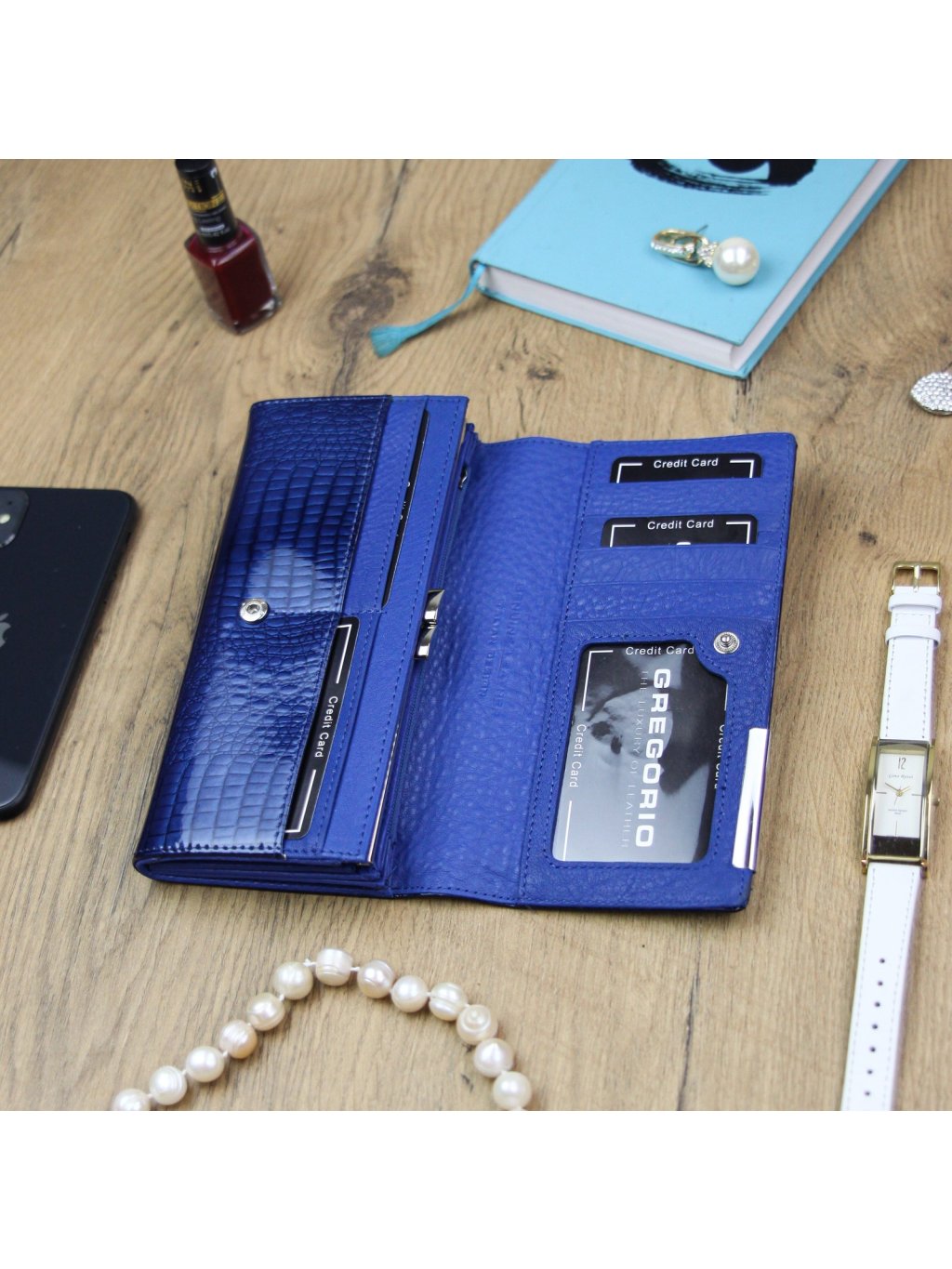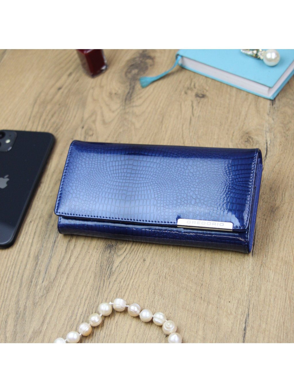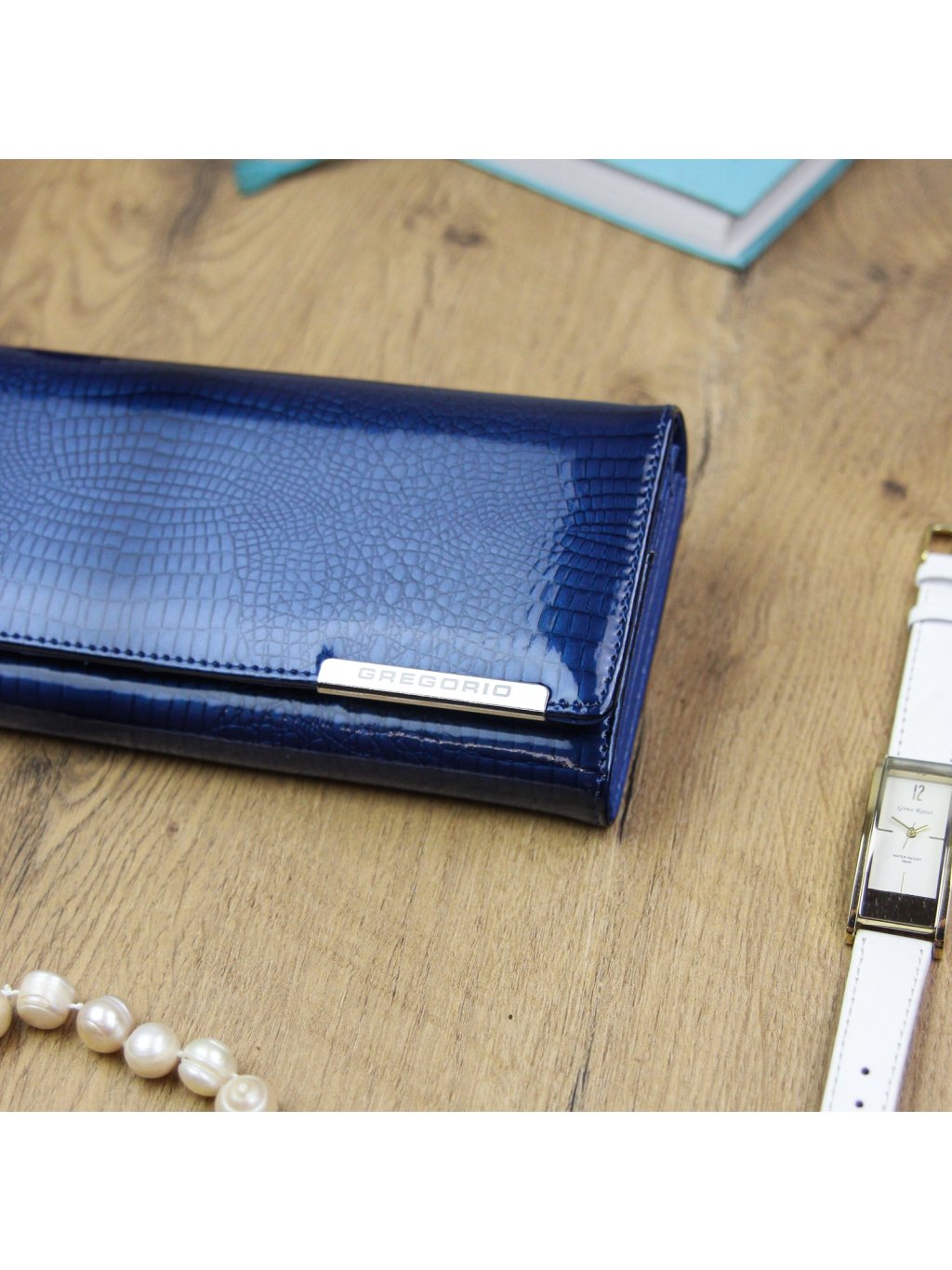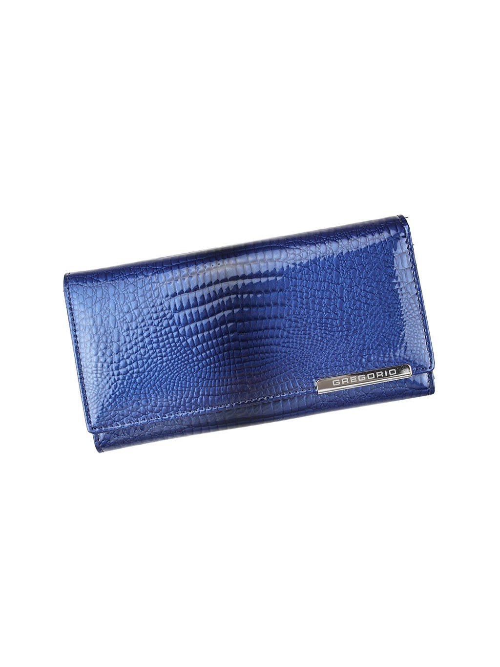 Tato dámská kožená peněženka Gregorio je ušitá z přírodní lakované kůže. Celkový vzhled peněženky se stříbrnými detaily působí velmi vkusně a elegantně. Peněženka se zavírá na druk. Uvnitř nalezneme přihrádky na platební karty a doklady, mincovník s kovovým zapínáním a fochy na papírové bankovky. Logo na přední straně je stříbrné barvy, peněženka je dodávána v papírové krabičce.