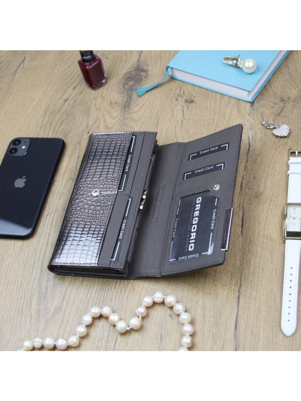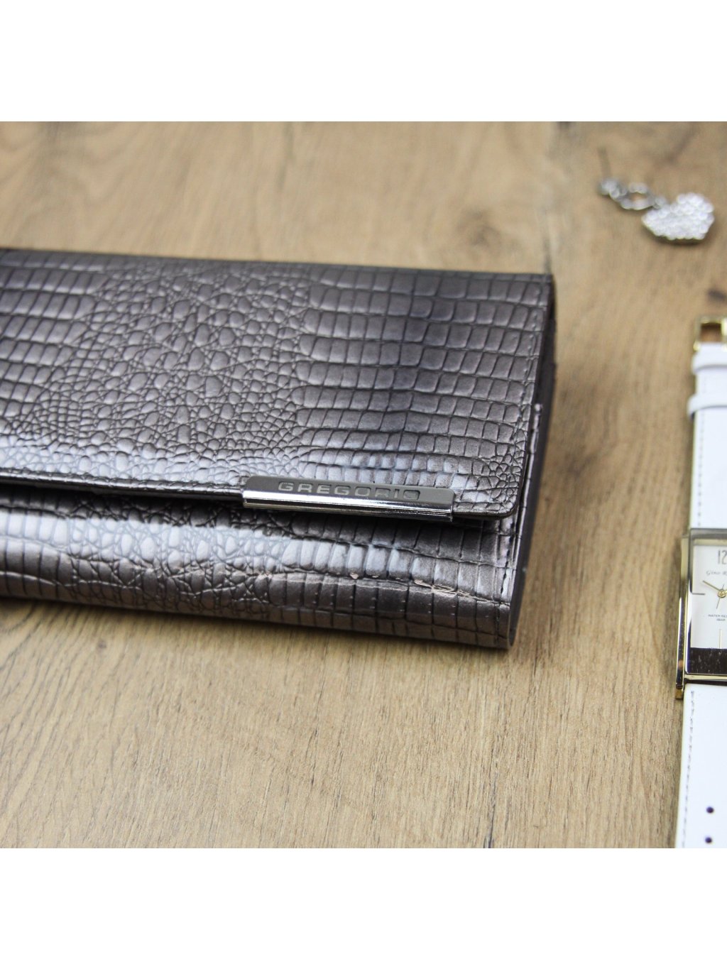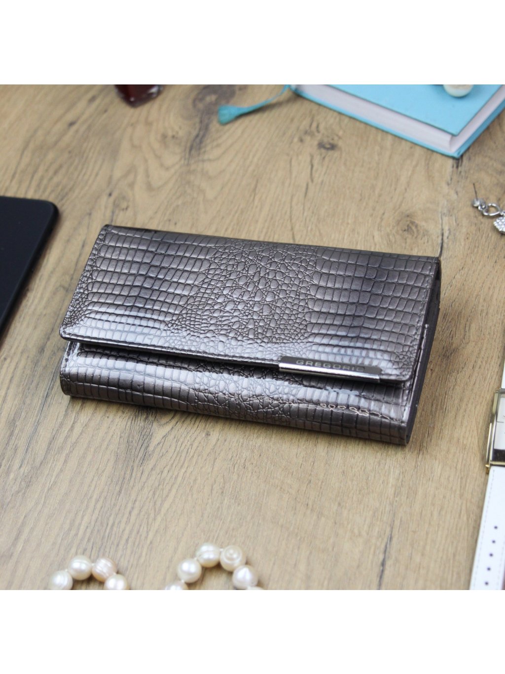 Tato dámská kožená peněženka Gregorio je ušitá z přírodní lakované kůže. Celkový vzhled peněženky se stříbrnými detaily působí velmi vkusně a elegantně. Peněženka se zavírá na druk. Uvnitř nalezneme přihrádky na platební karty a doklady, mincovník s kovovým zapínáním a fochy na papírové bankovky. Logo na přední straně je stříbrné barvy, peněženka je dodávána v papírové krabičce.