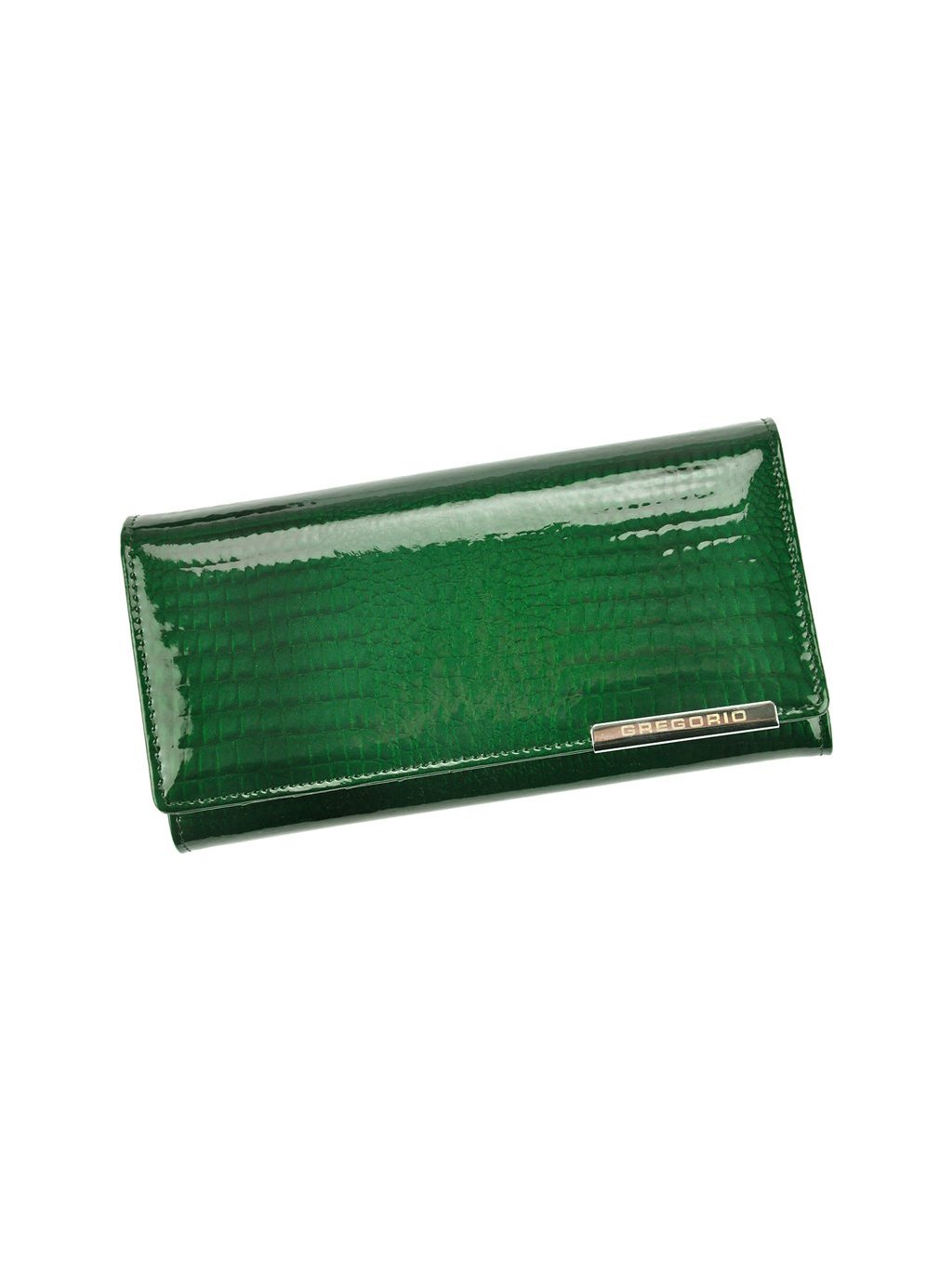 Tato dámská kožená peněženka Gregorio je ušitá z přírodní lakované kůže. Celkový vzhled peněženky se stříbrnými detaily působí velmi vkusně a elegantně. Peněženka se zavírá na druk. Uvnitř nalezneme přihrádky na platební karty a doklady, mincovník s kovovým zapínáním a fochy na papírové bankovky. Logo na přední straně je stříbrné barvy, peněženka je dodávána v papírové krabičce.