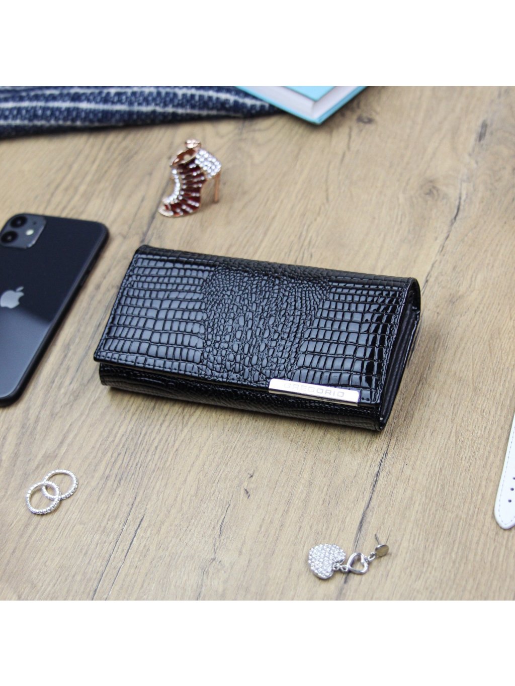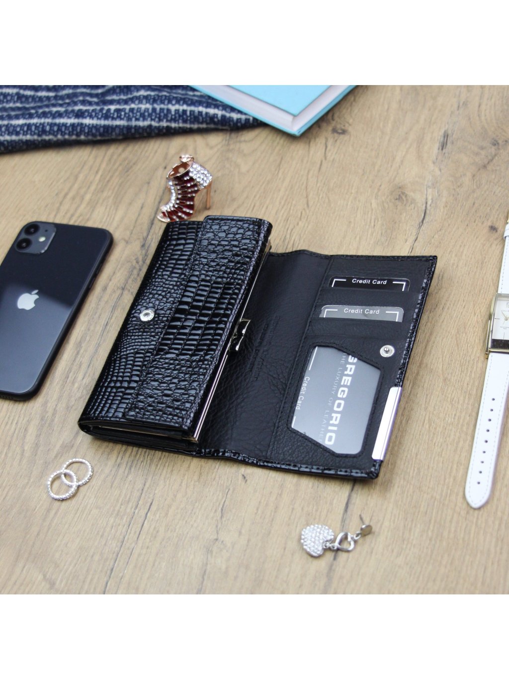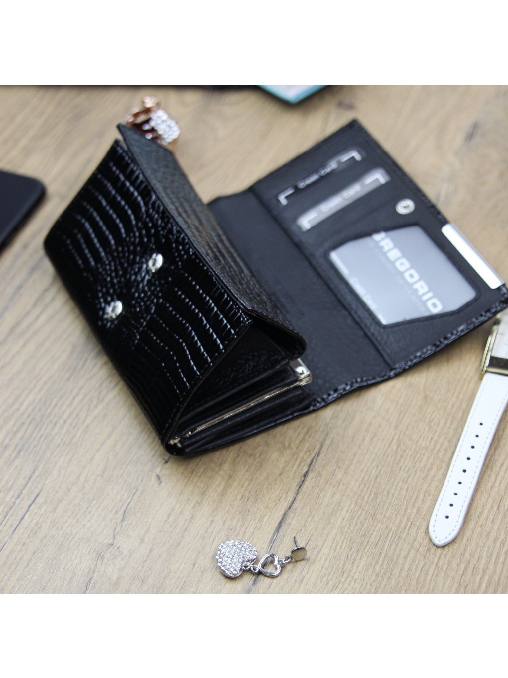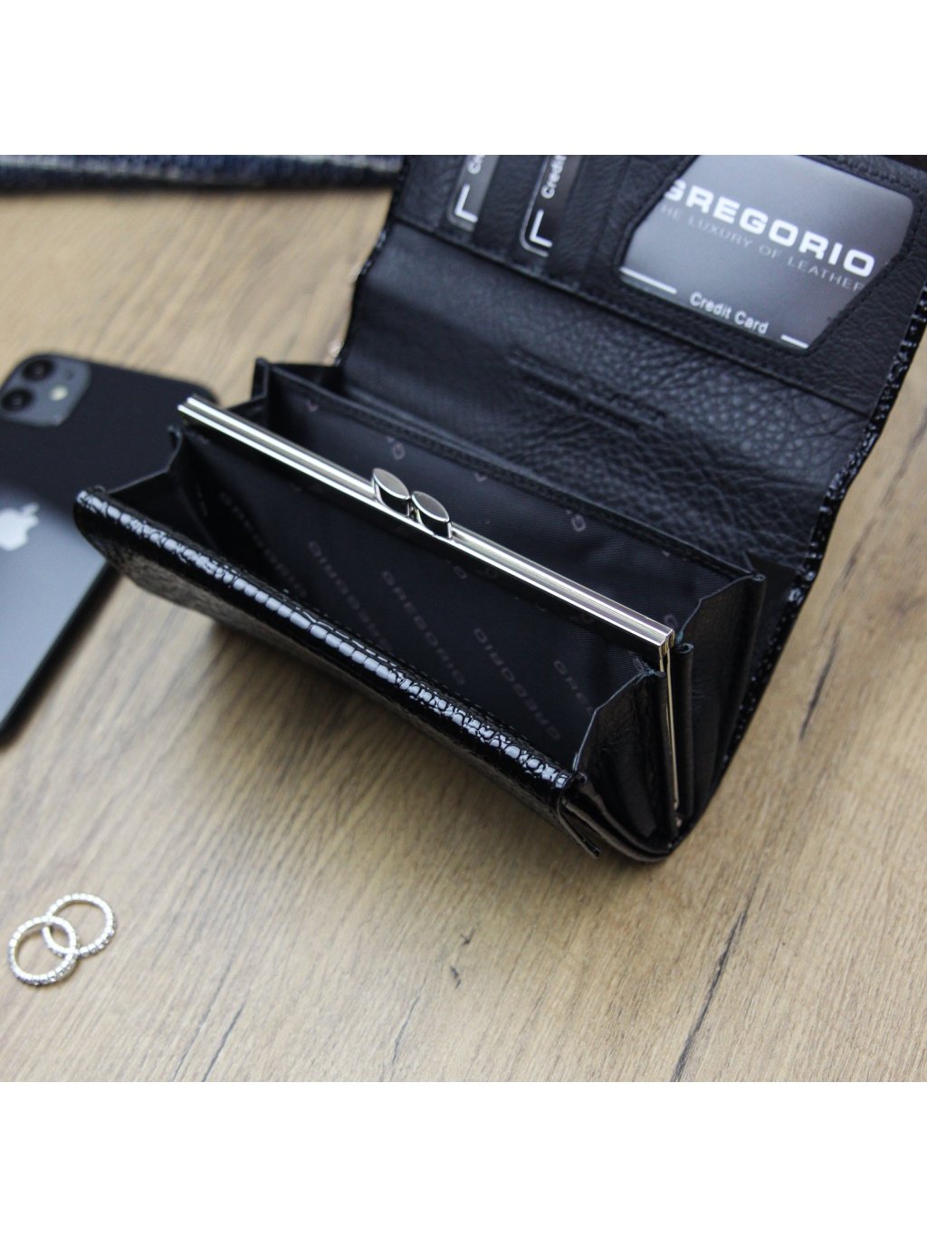 Dámská peněženka ušitá z pravé přírodní hovězí kůže. Zapínání peněženky je řešeno klopou na druk. Vnitřní prostor obsahuje několik praktických přihrádek na doklady, věrnostní karty, kreditní karty a oddíly na papírové bankovky. Mincovník na drobné mince se uzavírá klipem v kovovém rámu. Elegantní a zároveň praktický doplněk pro každodenní použití, který udělá radost i jako vkusný dárek.