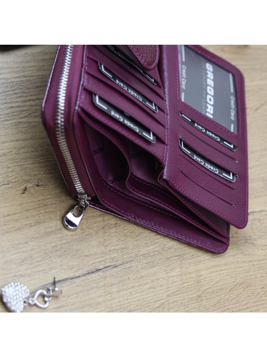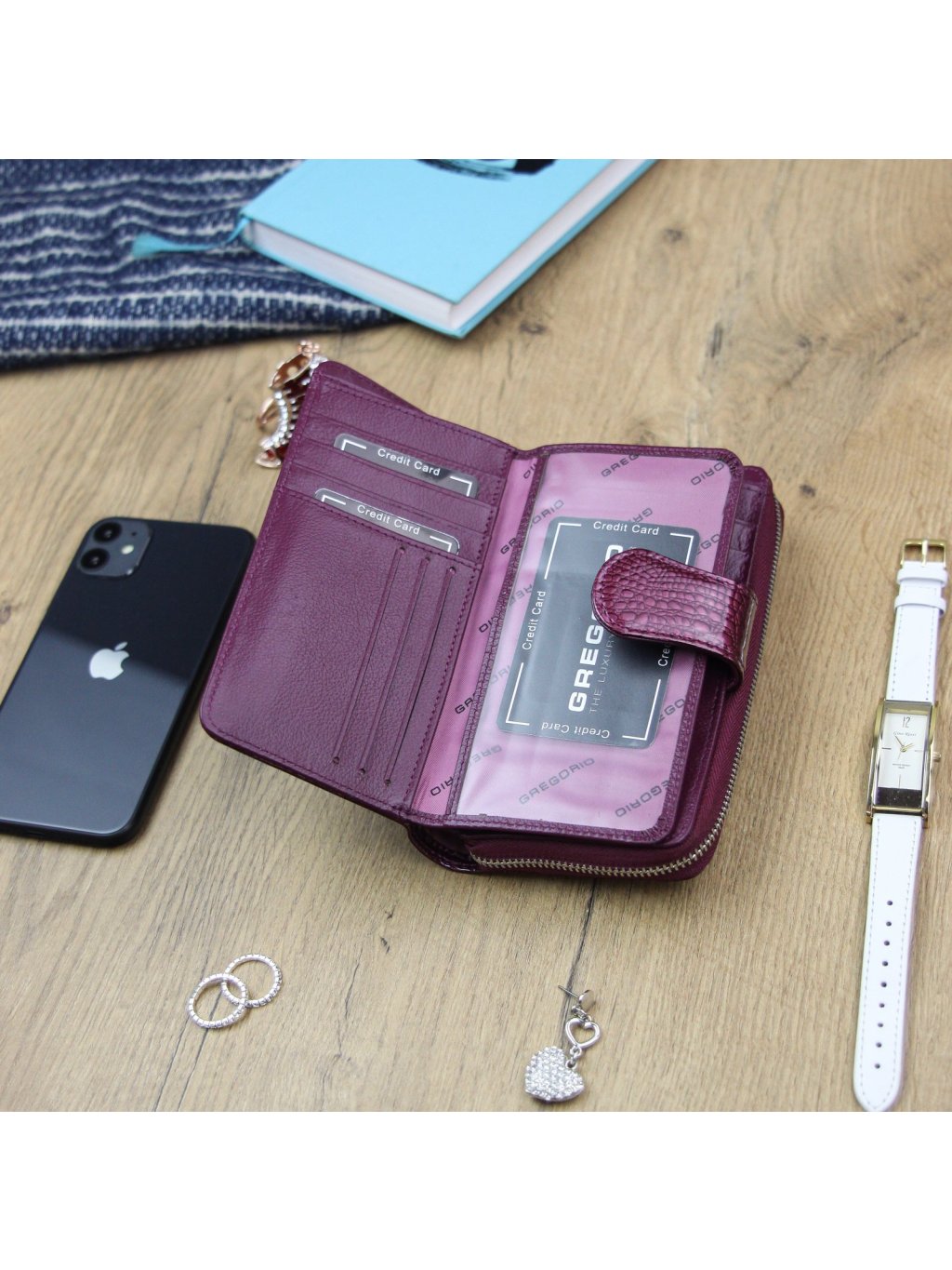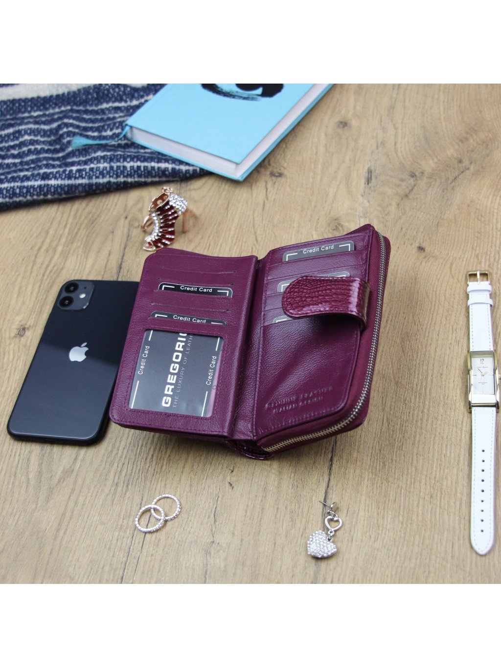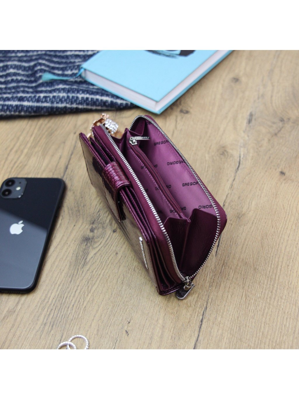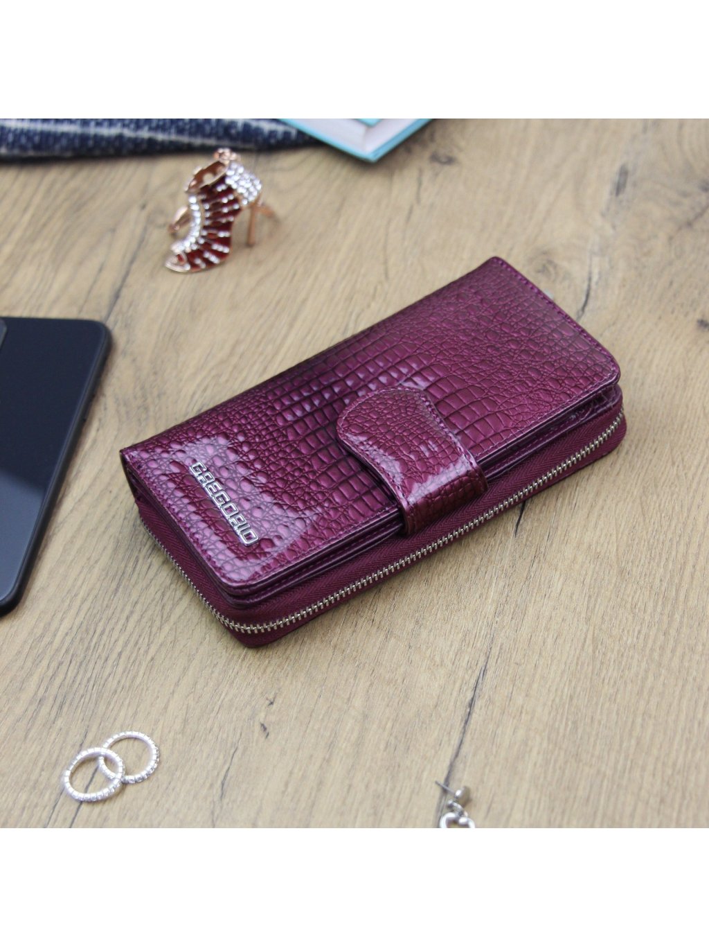 Tato menší dámská kožená peněženka značky Gregorio je ušitá z přírodní lakované kůže, ve které je vyražený krokodýlí vzor. Celá peněženka je rozdělena na dvě části. První část obsahuje mincovník, který se uzavírá na zip. Druhá část peněženky obsahuje přihrádky, které jsou určeny na věrnostní či kreditní karty a doklady. Přihrádky na papírové bankovky jsou ve vrchní části peněženky. Peněženka se uzavírá klopnou na druk a je dodávána v papírové krabičce.