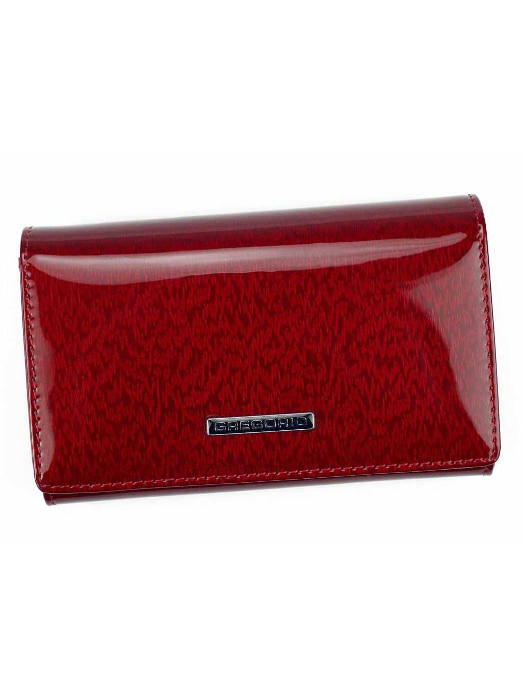 Dámská kožená peněženka značky Gregorio ušitá z hladké lakované kůže s jemným vzorem. Celá peněženka se uzavírá drukem. Na vnější straně nalezneme decentní logo výrobce, uvnitř objevíme mincovník s kovovým zapínáním, kapsu se zipem a fochy na papírové bankovky. Přihrádky na doklady, kreditní karty a věrnostní karty na druhé části peněženky.