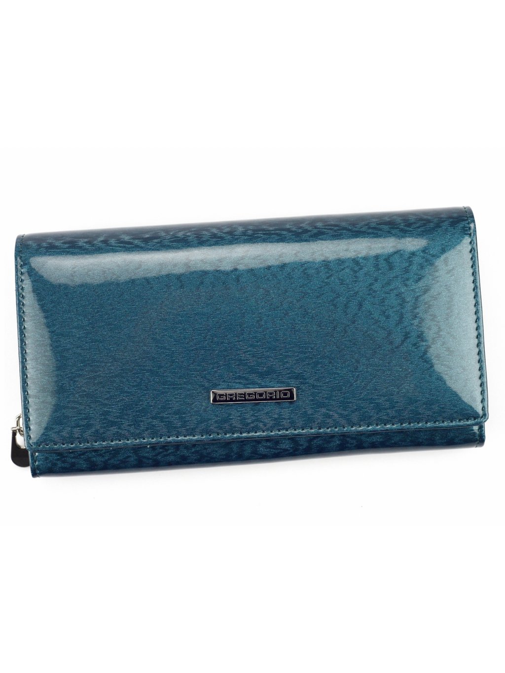 Dámská kožená peněženka značky Gregorio ušitá z hladké lakované kůže s jemným vzorem. Celkový vzhled peněženky působí velmi vkusně a elegantně. Peněženka se zavírá na druk. Uvnitř nalezneme přihrádky na platební karty a doklady, mincovník na zip a fochy na papírové bankovky. Logo na přední straně je stříbrné barvy, peněženka je dodávána v papírové krabičce.