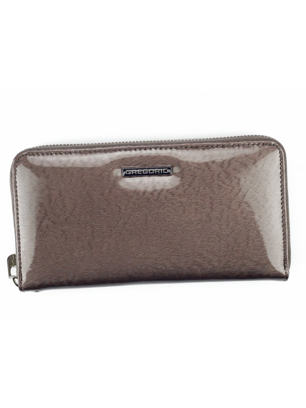 Dámská kožená peněženka značky Gregorio ušitá z hladké lakované kůže modré barvy s jemným vzorem. Peněženka je penálového typu a uzavírá se zipem. Uvnitř obsahuje fochy na papírové bankovky, přihrádky na karty, doklady a zipově uzavíratelný mincovník na drobné. Na přední straně je stříbrné logo výrobce.