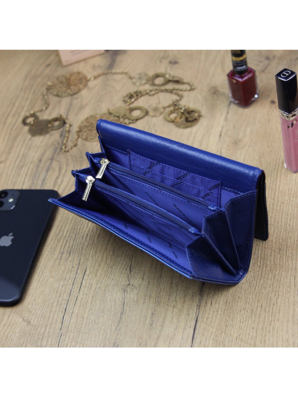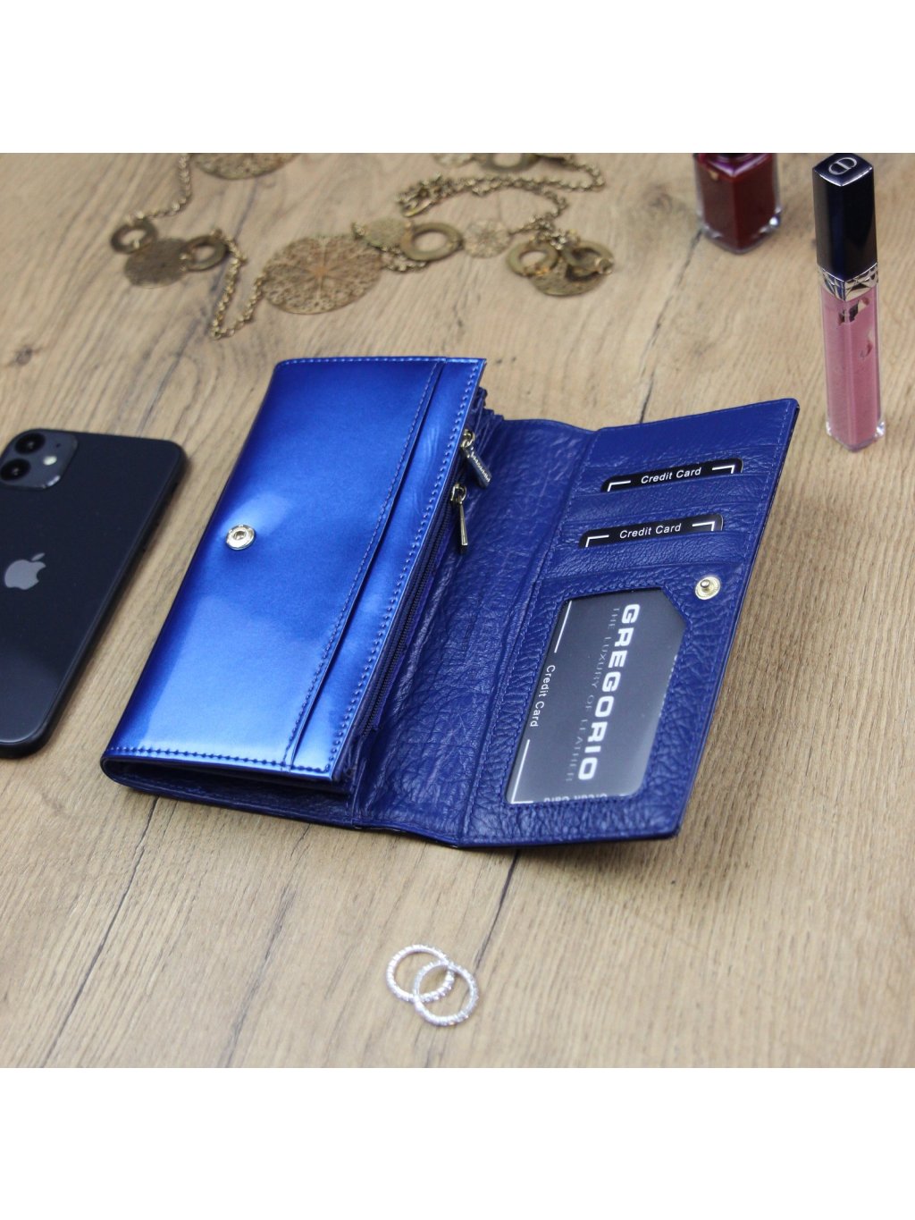 Dámská peněženka, která je ušitá z hladké lakované kůže. Luxusní vzhled peněženky potrhává zlaté logo Gregorio na přední straně klopny. Peněženka se se zavírá na klopnou na patentku, uvnitř nalezneme tři samostatné fochy na papírové bankovky předělené zipovou separací a jsou tedy vhodné na drobné mince. Přihrádky na doklady a kreditní karty nalezneme z vnitřní strany klopnu. Peněženka je dodávána v papírové krabičce.