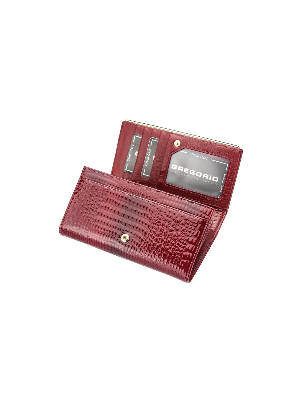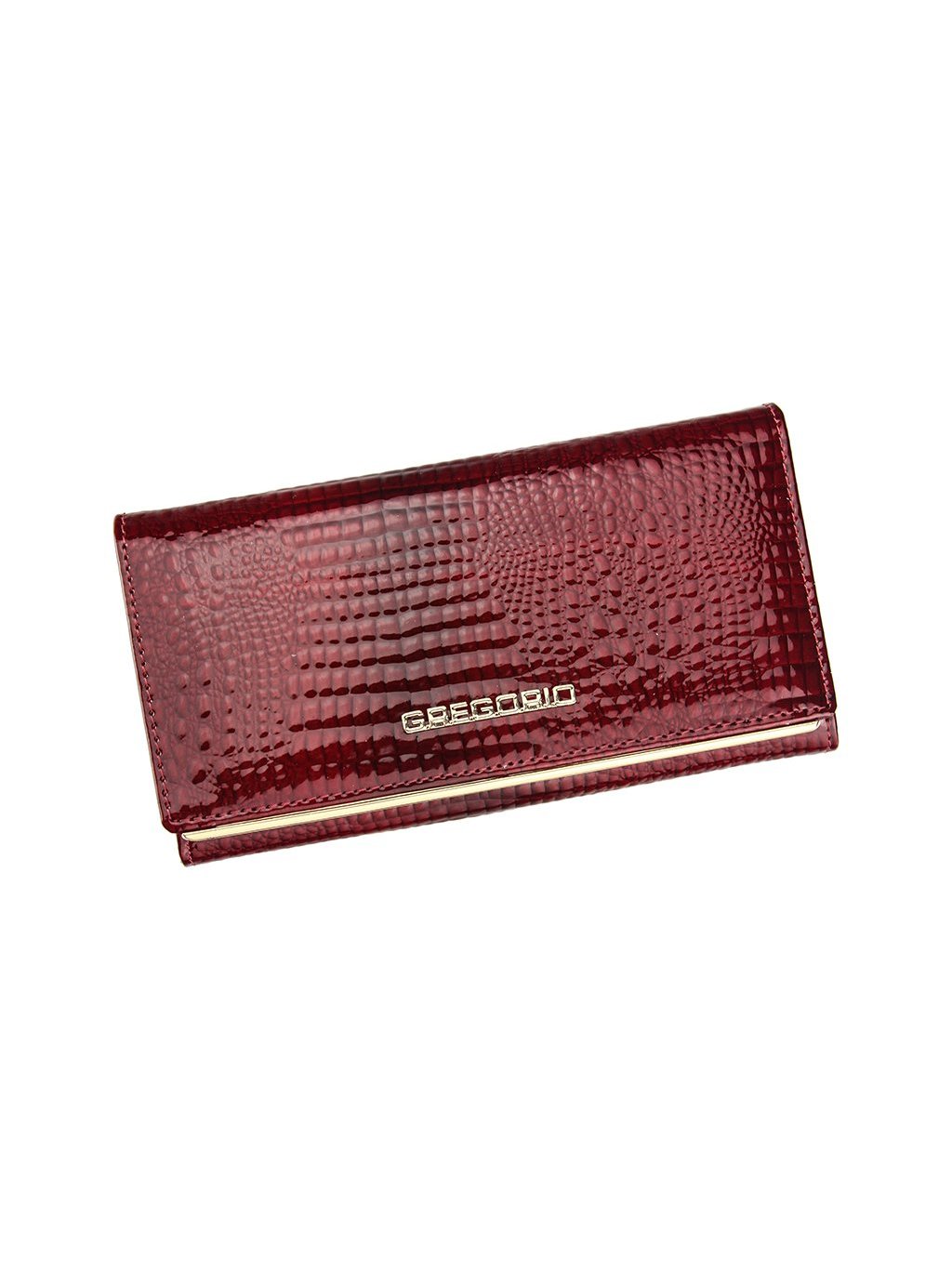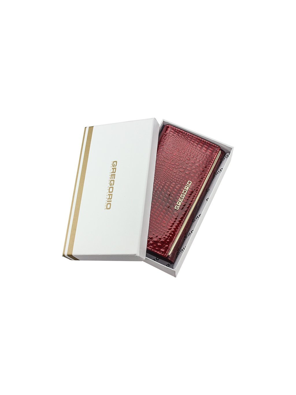 Tato kožená peněženka je vyrobena z pravé přírodní lakované kůže s vyraženým moderním „croko" vzorem. Luxusní vzhled peněženky potrhává zlaté logo Gregorio na přední straně klopny. Peněženka se se zavírá na klopnou na patentku, uvnitř nalezneme tři samostatné fochy na papírové bankovky předělené zipovou separací a jsou tedy vhodné na drobné mince. Přihrádky na doklady a kreditní karty nalezneme z vnitřní strany klopnu. Peněženka je dodávána v papírové krabičce.