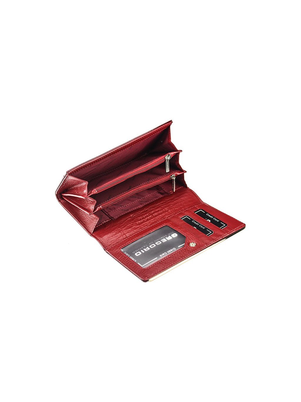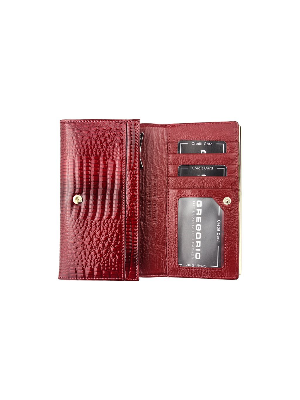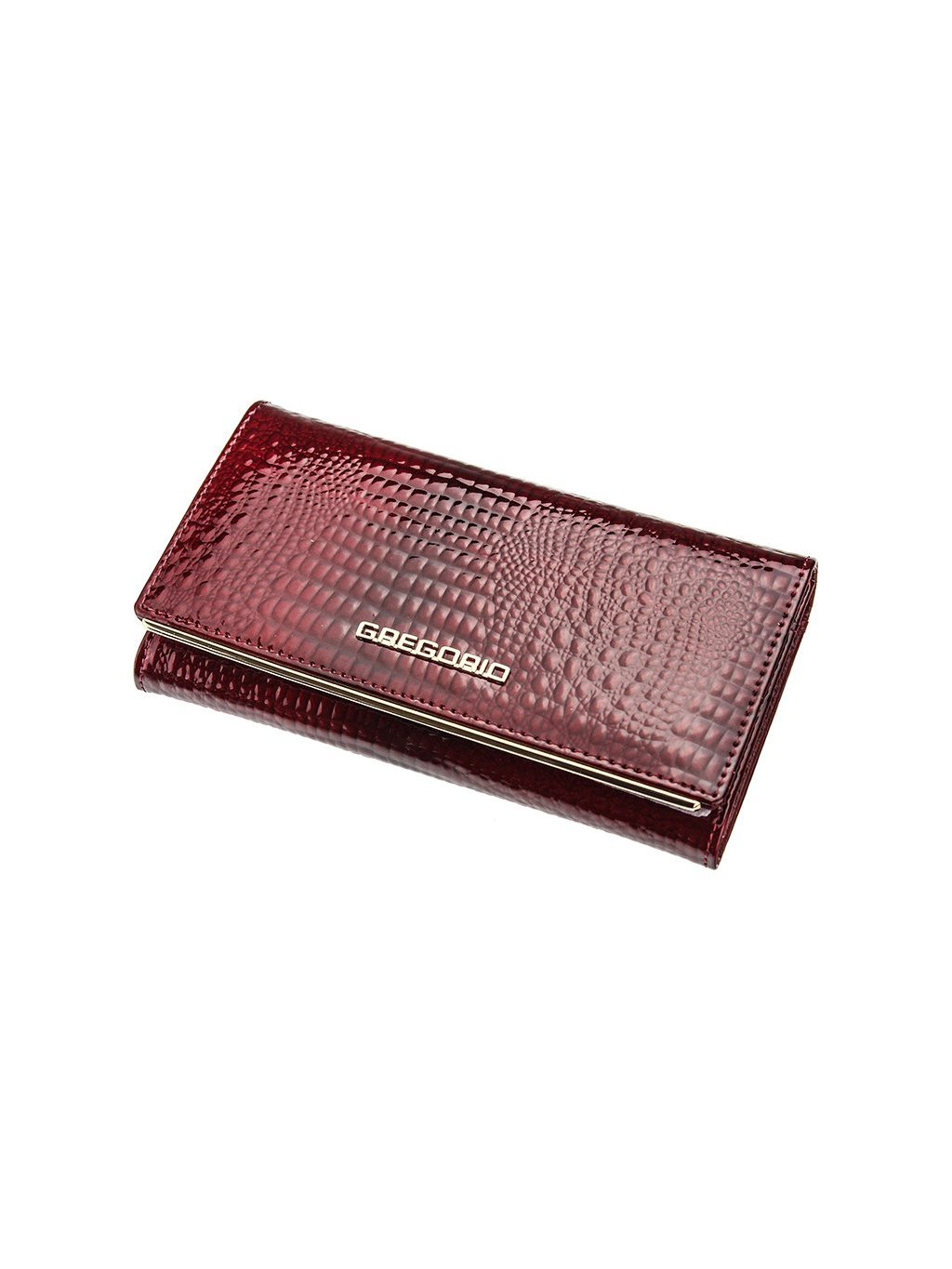 Tato kožená peněženka je vyrobena z pravé přírodní lakované kůže s vyraženým moderním „croko" vzorem. Luxusní vzhled peněženky potrhává zlaté logo Gregorio na přední straně klopny. Peněženka se se zavírá na klopnou na patentku, uvnitř nalezneme tři samostatné fochy na papírové bankovky předělené zipovou separací a jsou tedy vhodné na drobné mince. Přihrádky na doklady a kreditní karty nalezneme z vnitřní strany klopnu. Peněženka je dodávána v papírové krabičce.