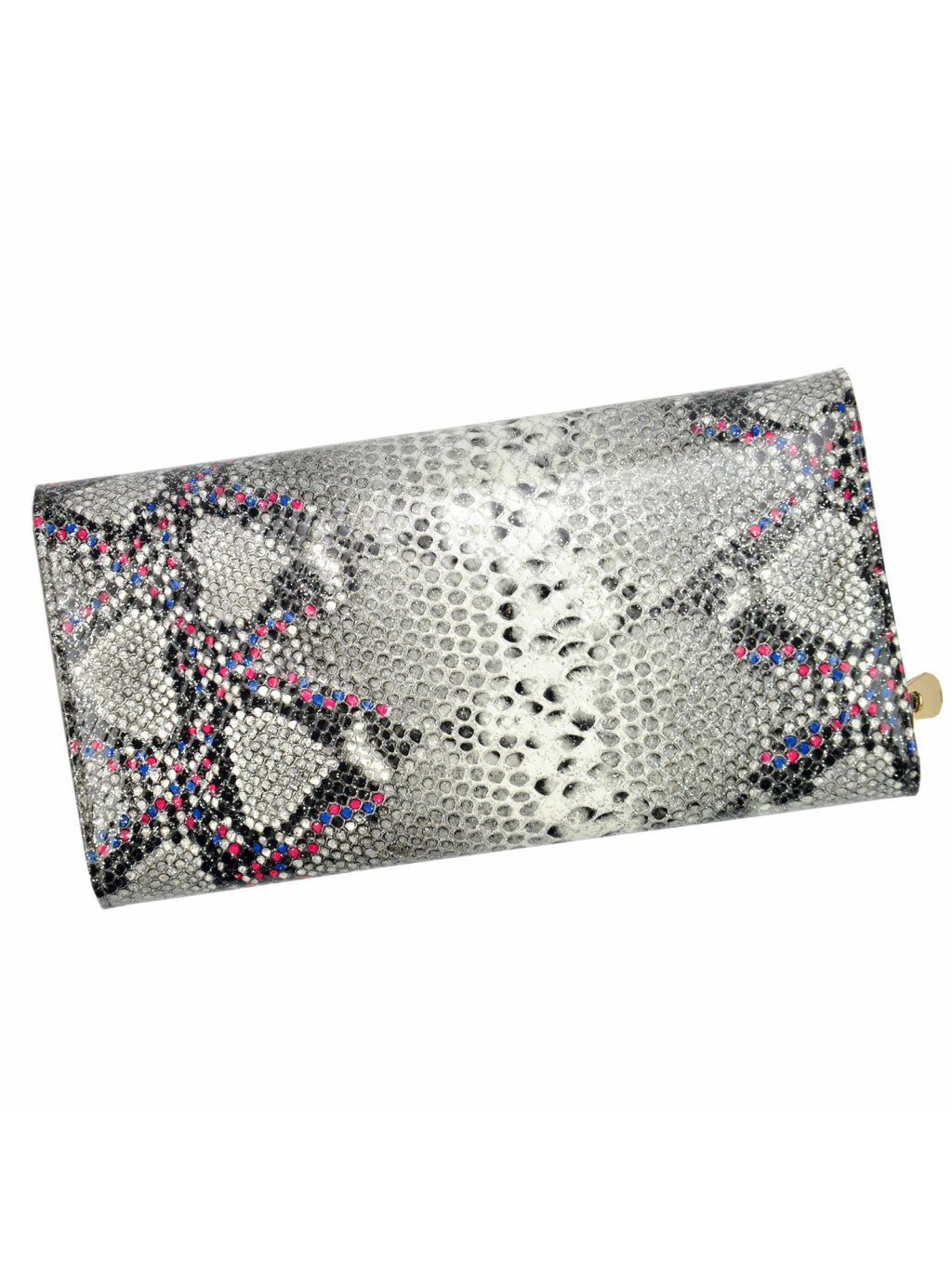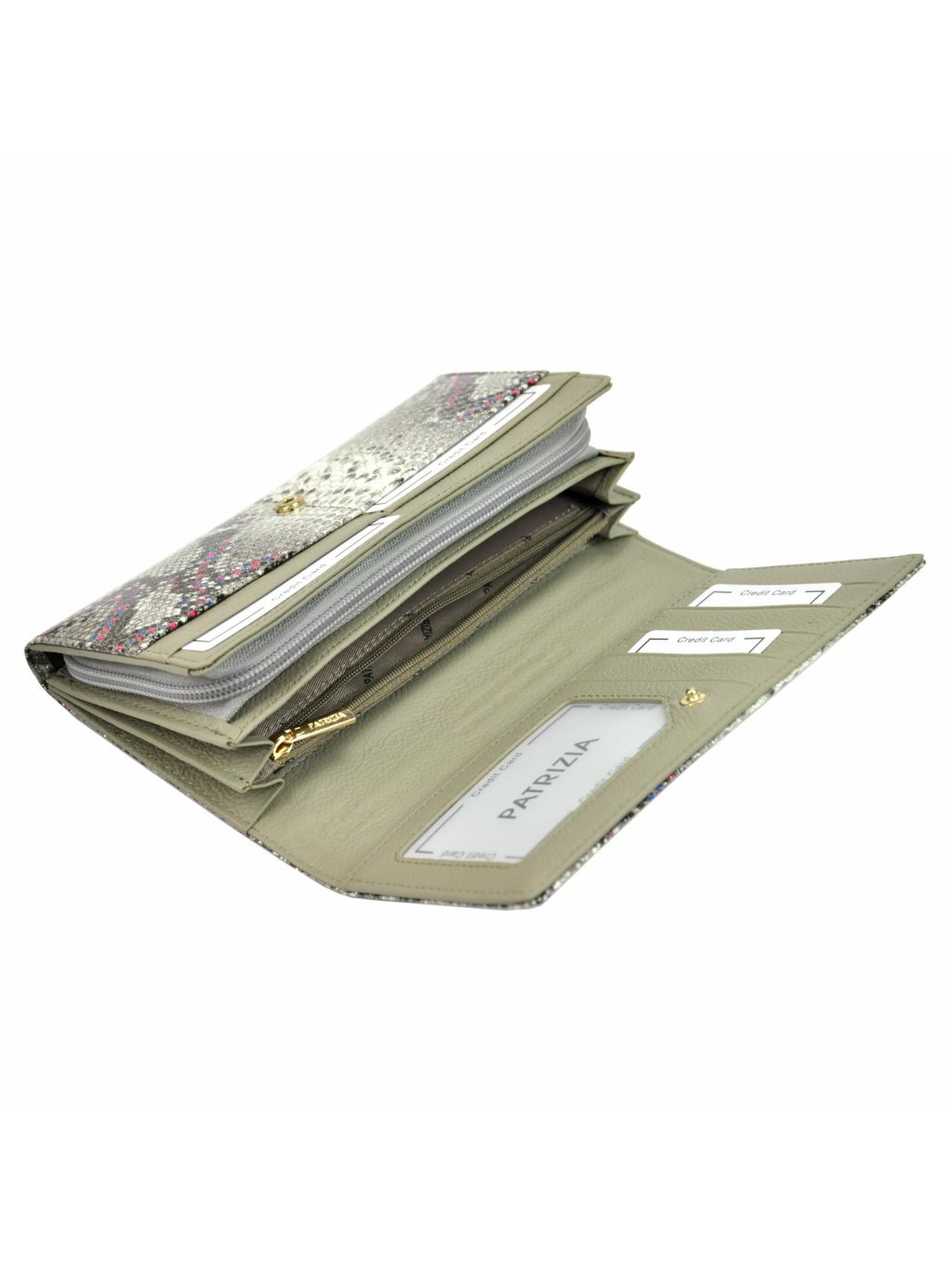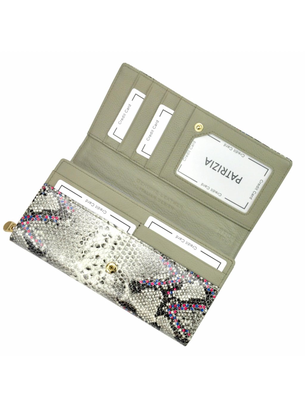 Tato dámská kožená peněženka Gregorio je ušitá z přírodní lakované kůže. Celkový vzhled peněženky se zlatými detaily a imitací hadí kůže působí velmi luxusně a elegantně. Peněženka se zavírá na druk. Uvnitř nalezneme přihrádky na platební karty, věrnostní karty a doklady, mincovník se zipovým zapínáním a fochy na papírové bankovky. Logo na přední straně je zlaté barvy, peněženka je dodávána v papírové krabičce.