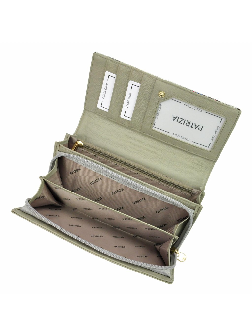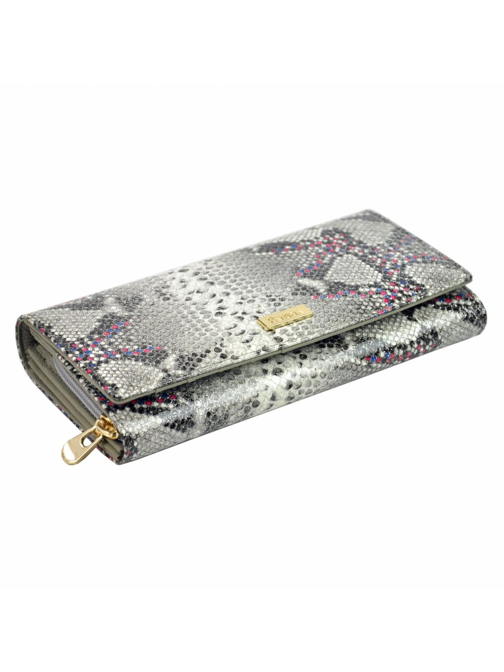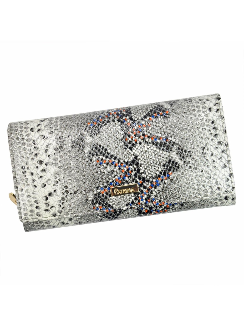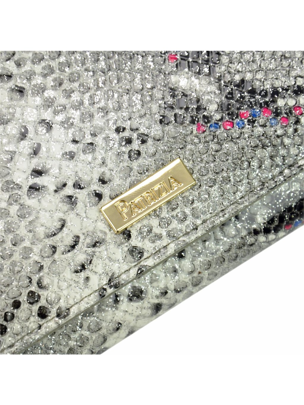 Tato dámská kožená peněženka Gregorio je ušitá z přírodní lakované kůže. Celkový vzhled peněženky se zlatými detaily a imitací hadí kůže působí velmi luxusně a elegantně. Peněženka se zavírá na druk. Uvnitř nalezneme přihrádky na platební karty, věrnostní karty a doklady, mincovník se zipovým zapínáním a fochy na papírové bankovky. Logo na přední straně je zlaté barvy, peněženka je dodávána v papírové krabičce.