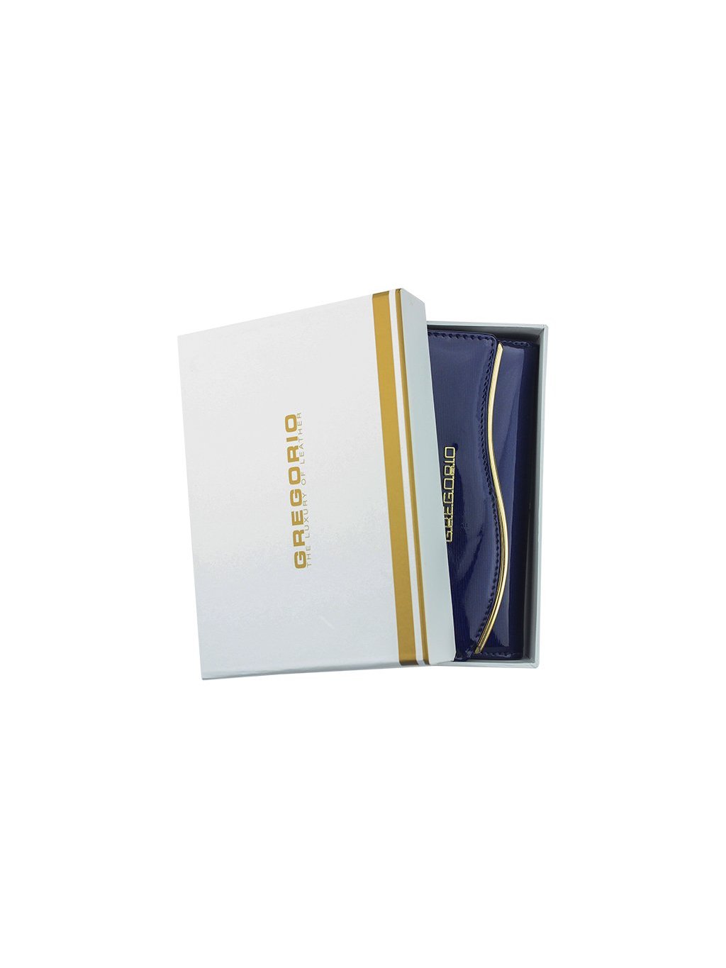 Tato dámská kožená peněženka Gregorio je ušitá z hladké přírodní lakované kůže. Celkový vzhled peněženky působí velmi vkusně a elegantně. Na vnější straně nalezneme decentní zlaté logo výrobce, uvnitř objevíme mincovník s kovovým zapínáním, kapsu se zipem a fochy na papírové bankovky. Přihrádky na doklady, kreditní karty a vizitky nalezneme na druhé části peněženky.