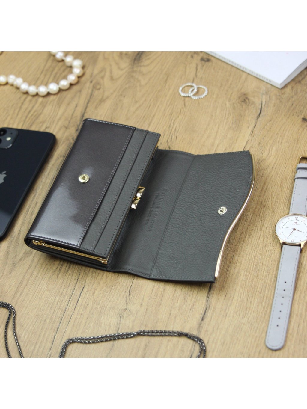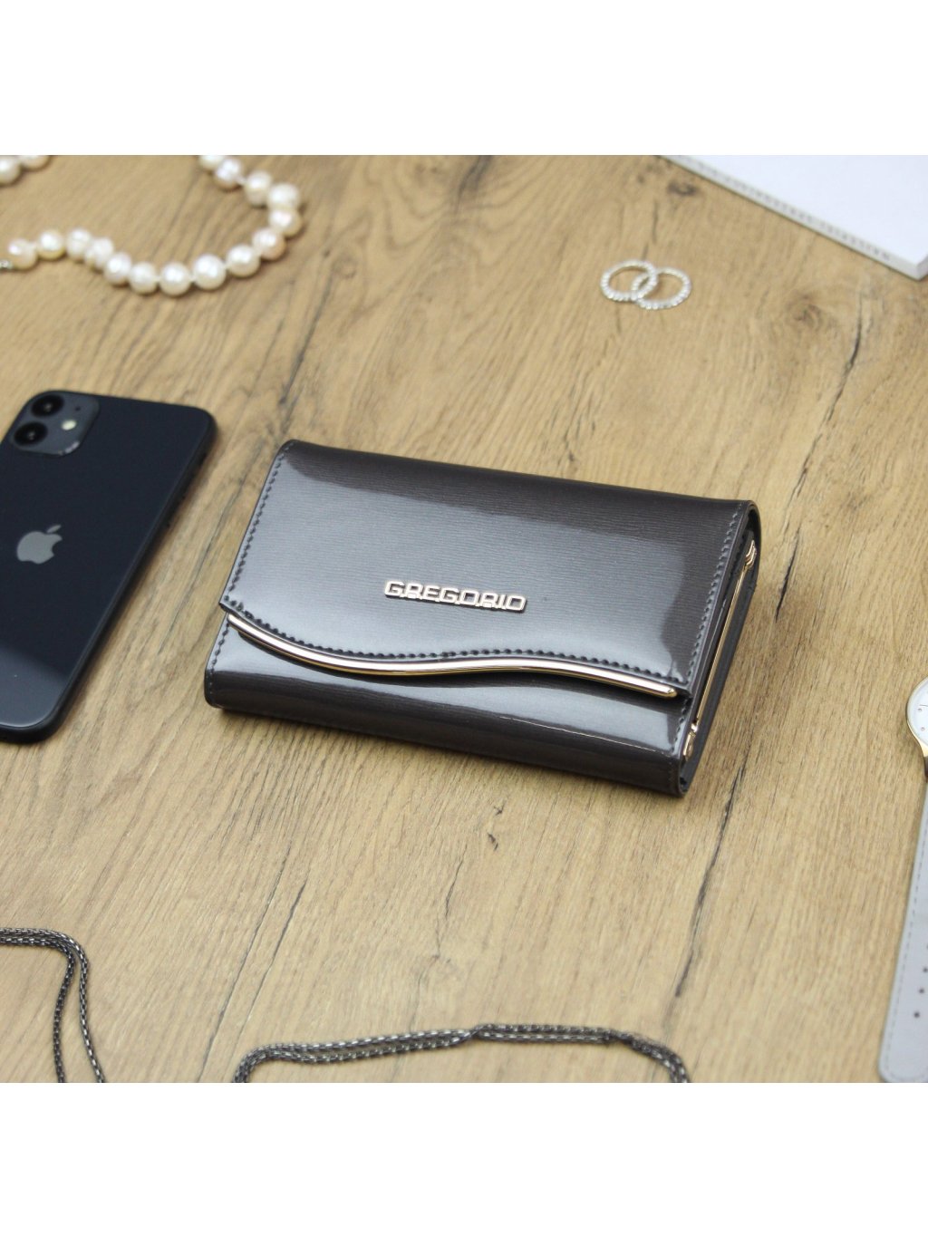 Tato dámská kožená peněženka Gregorio je ušitá z hladké přírodní lakované kůže. Celkový vzhled peněženky působí velmi vkusně a elegantně. Na vnější straně nalezneme decentní zlaté logo výrobce, uvnitř objevíme mincovník s kovovým zapínáním, kapsu se zipem a fochy na papírové bankovky. Přihrádky na doklady, kreditní karty a vizitky nalezneme na druhé části peněženky.