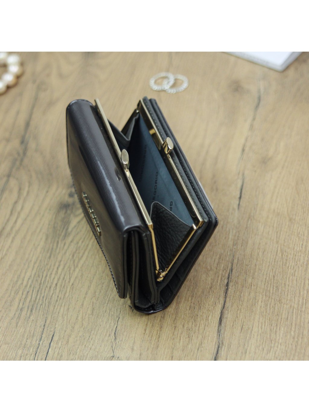 Tato peněženka bude slušet dámám které mají smysl pro eleganci. Peněženka je ušitá z hladké lakované kůže. Po jejím rozevření nalezneme dostatek prostoru pro veškeré doklady a platební karty. Na horní straně peněženky se nachází fochy pro papírové bankovky. Zezadu je všitý mincovník v kovovém rámu zlaté barvy, který se zavírá na klip. Vedle mincovníku se nachází druhá klopna na druk s přihrádkou pro další karty a doklady.