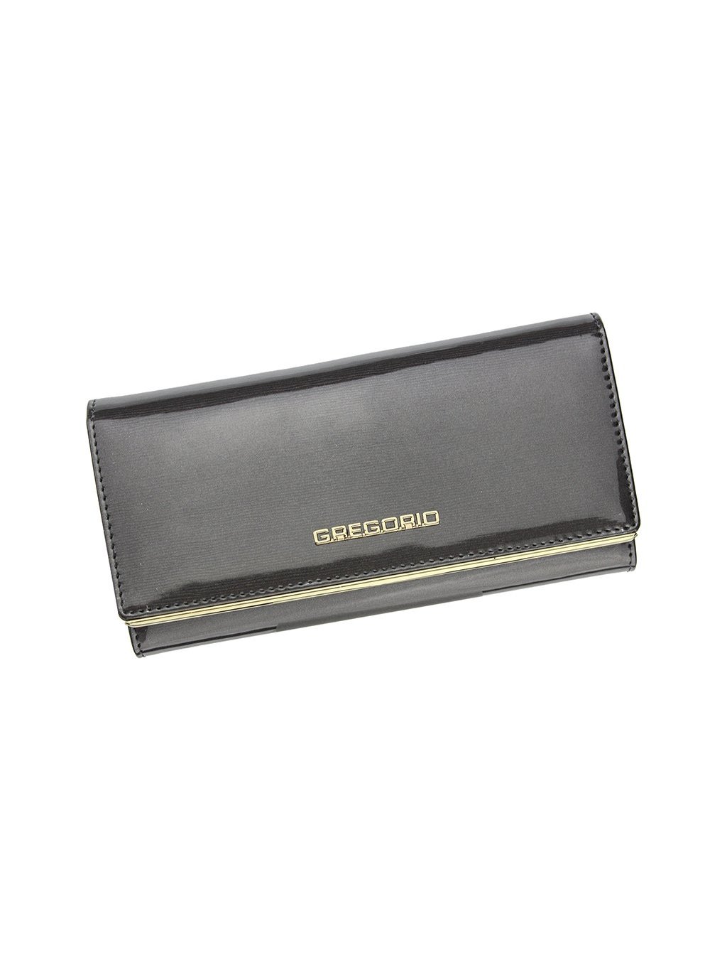 Tato dámská kožená peněženka Gregorio je ušitá z hladké přírodní lakované kůže. Celkový vzhled peněženky působí velmi vkusně a elegantně. Peněženka se zavírá na druk. Uvnitř nalezneme přihrádky na platební karty a doklady, mincovník s kovovým zapínáním a fochy na papírové bankovky. Logo na přední straně je zlaté barvy, peněženka je dodávána v papírové krabičce.