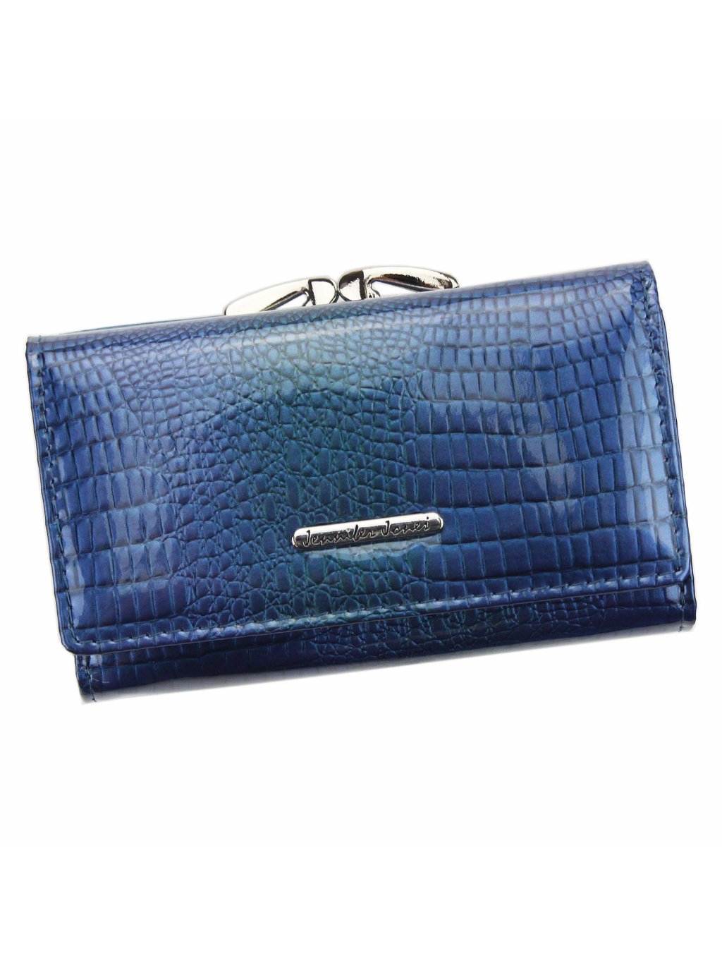 Menší dámská kožená peněženka Jennifer Jones ušitá z lakované přírodní kůže. Celkový vzhled peněženky působí velmi vkusně a elegantně. Peněženka má na jedné straně rámečkovou komoru na mince, která je rozdělena na dvě části. Na druhé straně je prostor uzavíratelný drukem, kde se nachází přihrádky na kreditní karty, věrnostní karty a doklady. Dva fochy na papírové bankovky jsou z vrchní strany peněženky.