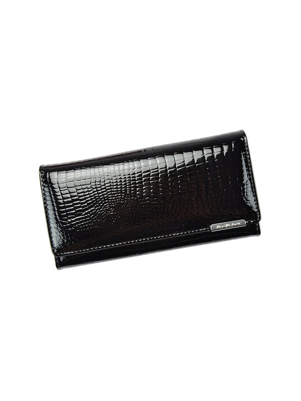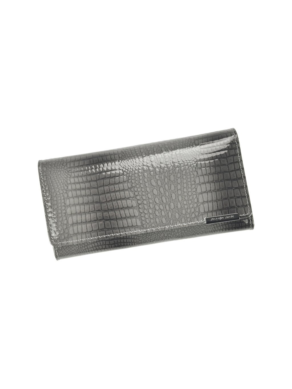 Dámská kožená peněženka ušitá z pravé lakované kůže značky Jennifer Jones. Čelní stranu peněženky zdobí stříbrné logo výrobce. Zapínání peněženky je na druk. Vnitřní prostor obsahuje několik praktických přihrádek na doklady a kreditní karty. Fochy na papírové bankovky jsou vedle mincovníku, který je opatřen klipem. Peněženka je dodávána v luxusní dárkové krabičce.