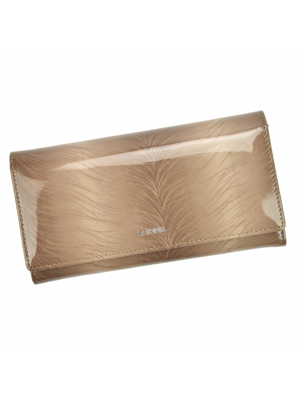 Dámská kožená peněženka z provenience módní značky Patrizia. Peněženka je ušitá z lakované kůže, která má decentní barevný podkres. Čelní stranu peněženky zdobí logo výrobce. Peněženka se zapíná na druk. Uvnitř nalezneme přihrádky na platební karty a doklady, mincovník s kovovým zapínáním a fochy na papírové bankovky.