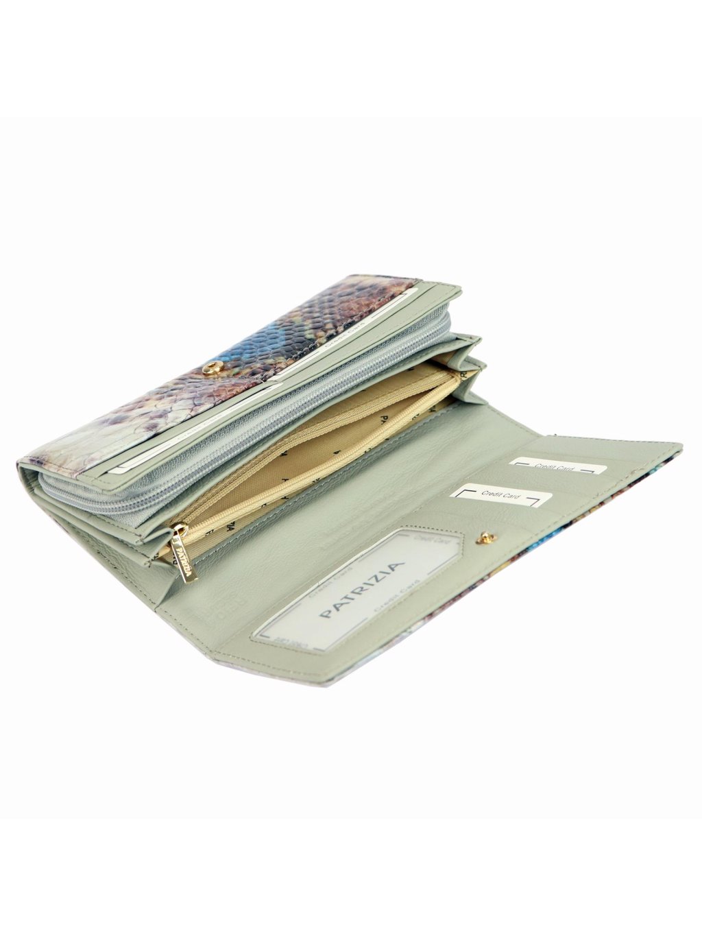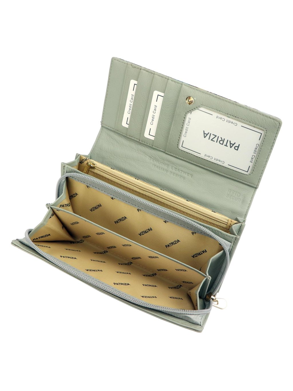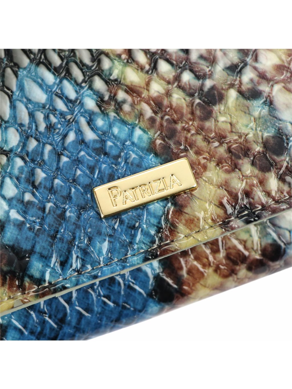 Tato dámská kožená peněženka značky PATRIZIA je ušitá z přírodní lakované kůže, ve které je vyražený krokodýlí vzor. Celkový vzhled peněženky působí velmi vkusně a elegantně. Peněženka se zavírá na druk. Uvnitř nalezneme přihrádky na papírové bankovky, mincovník na zip, přihrádky na platební karty, věrnostní karty a doklady.