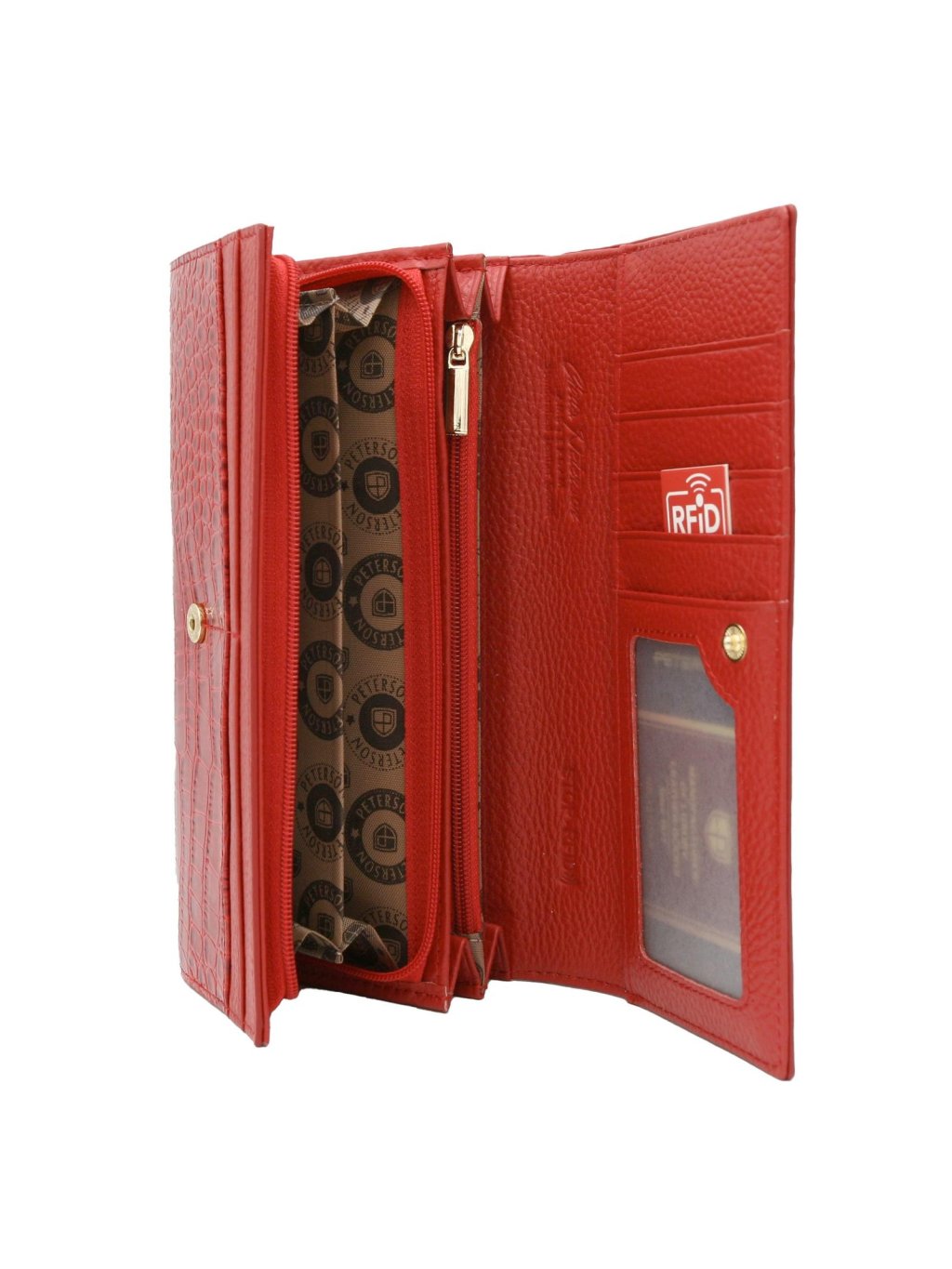 Dámská peněženka ušitá z pravé přírodní hovězí kůže. Zapínání peněženky je řešeno klopou na druk. Vnitřní prostor obsahuje několik praktických přihrádek na doklady, věrnostní karty, kreditní karty a oddíly na papírové bankovky. Mincovník na drobné mince se uzavírá klipem v kovovém rámu. Elegantní a zároveň praktický doplněk pro každodenní použití, který udělá radost i jako vkusný dárek.