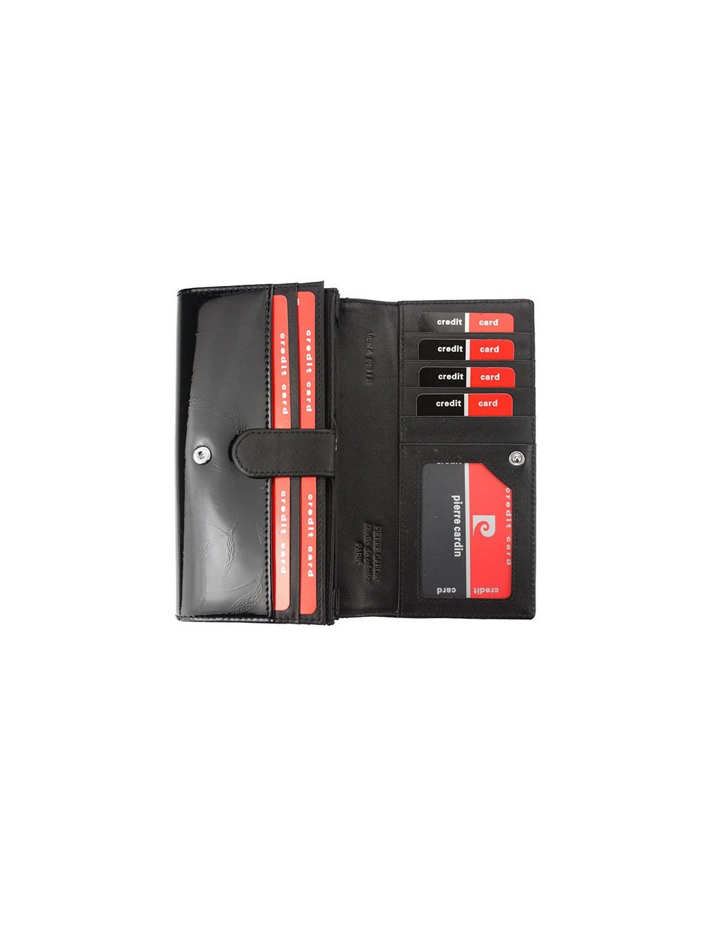 Tato luxusní dámská kožená peněženka francouzské značky Pierre Cardin je ušitá z lakované přírodní usně, která má decentní podkreslení. Čelní stranu peněženky zdobí stříbrné logo výrobce. Peněženka se se zavírá na klopnou na patentku, uvnitř nalezneme tři samostatné fochy na papírové bankovky předělené separací. Jedna separace je zipově uzavíratelná a je tak vhodná na drobné mince. Velkou výhodou tohoto modelu druhá vnitřní klopna uzavíratelná zápinkou, pod kterou se nachází další praktické přihrádky na karty anebo doklady. Další zipově uzavíratelná kapsička se nachází i na zadní straně peněženky. Hledáte-li prostornou peněženku s dostatkem prostoru na karty, doklady a další nezbytnosti je tento model určen právě vám.