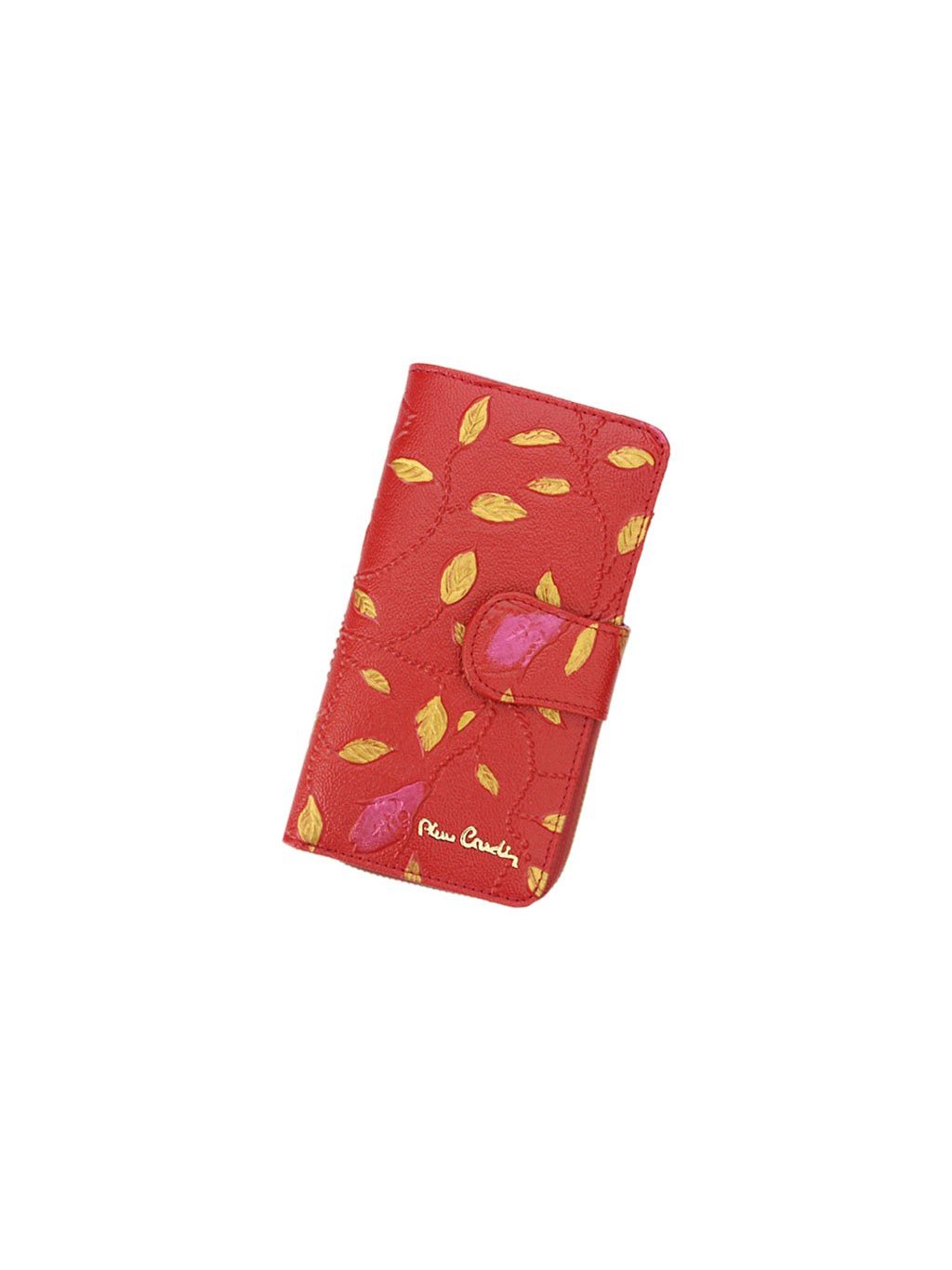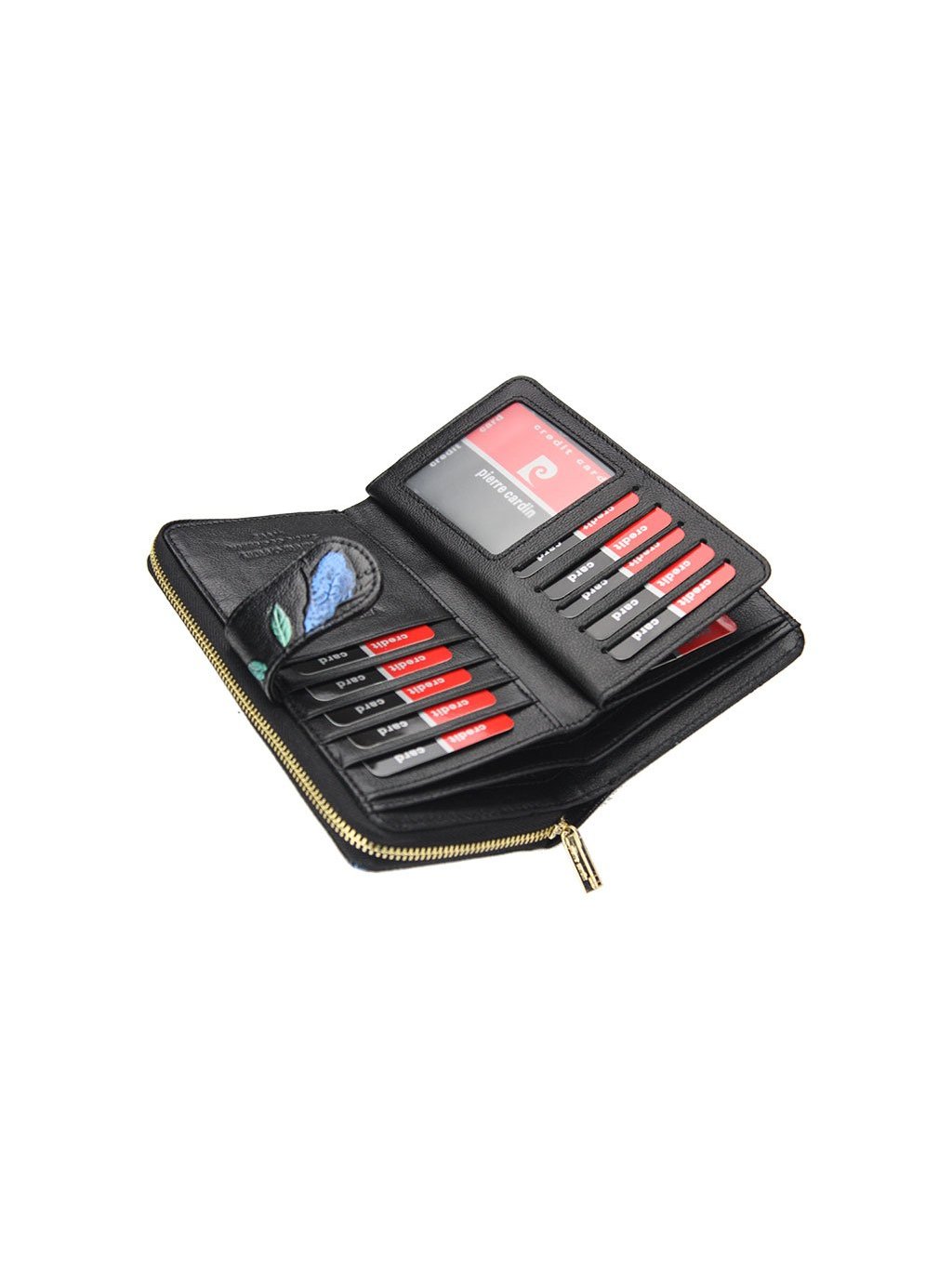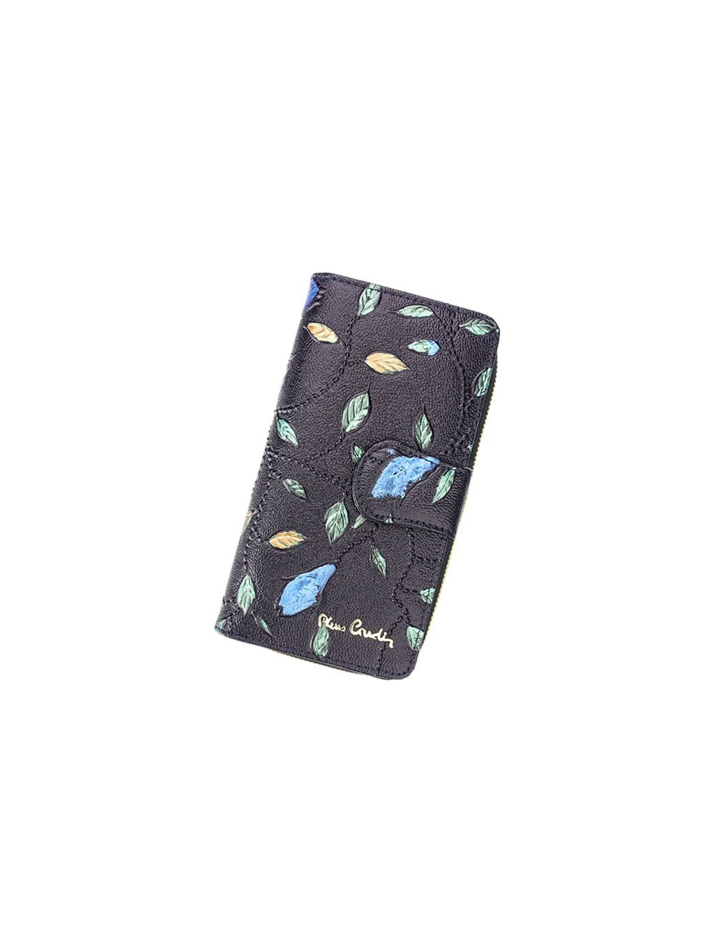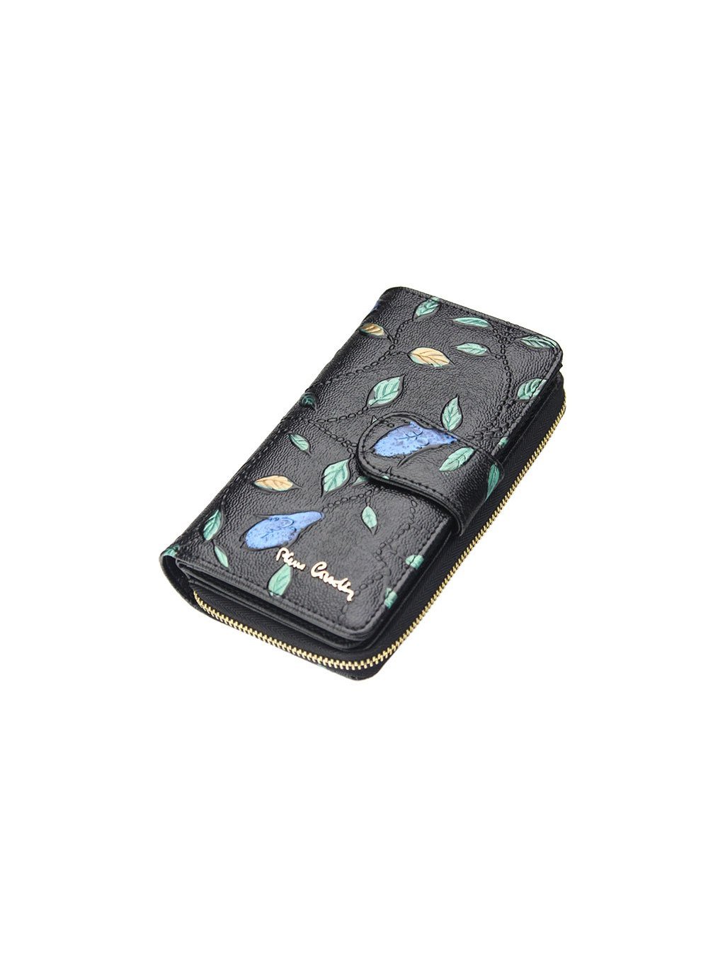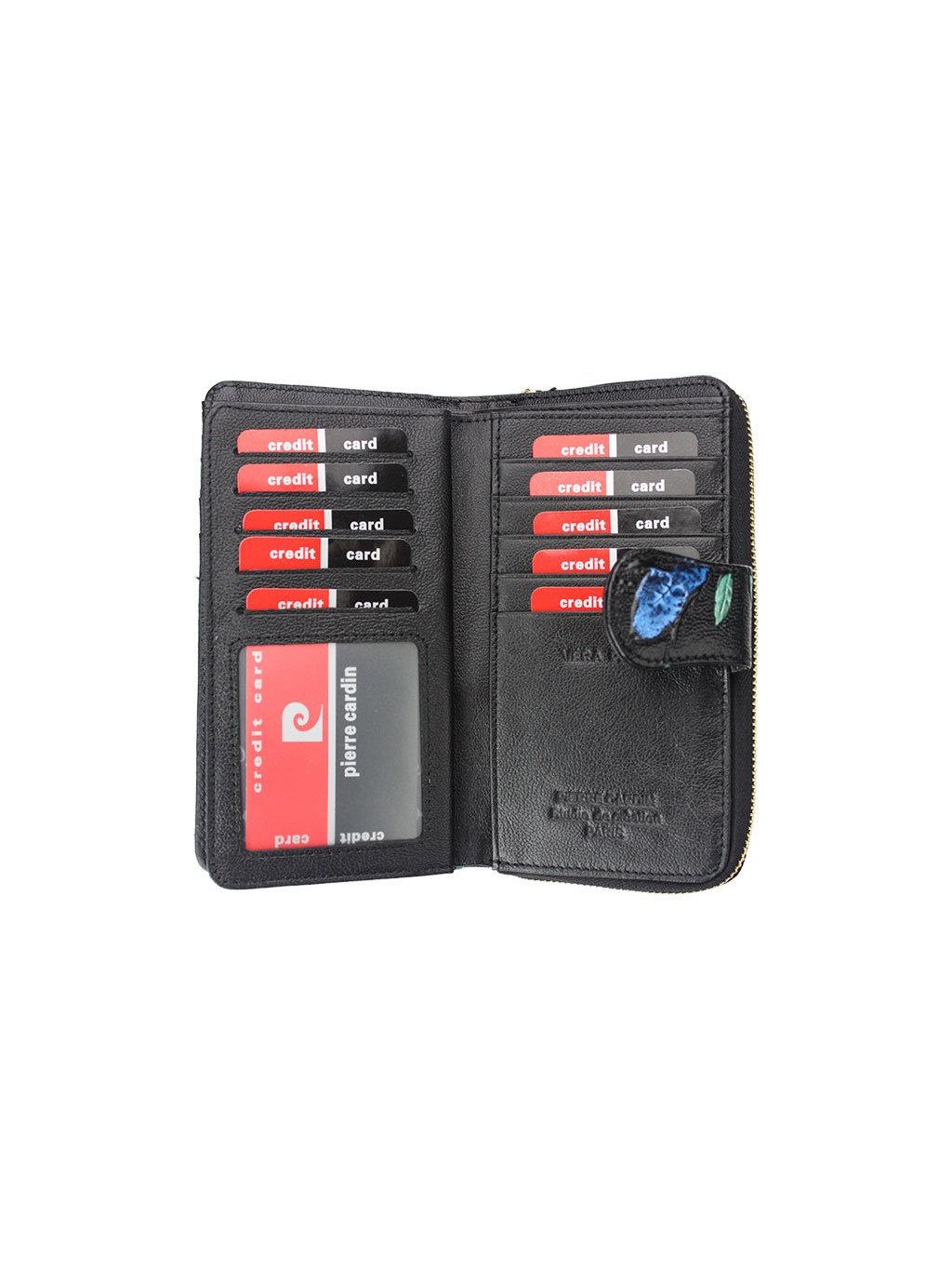 Luxusní dámská kožená peněženka francouzského výrobce Pierre Cardin, která je ušitá z přírodní kůže ve které je vyražený ozdobný vzor. Vyražené logo a komponenty zlaté barvy dávají peněžence luxusní vzhled. Celá peněženka je rozdělena na dvě části, mincovník, který se uzavírá zipem a zipovou separací je rozdělený na dvě části. Zip peněženky jde doširoka rozepnout a ulehčuje tak manipulaci s drobnými mincemi. Druhá část je na karty a se zapíná úzkou pinetkou na patentku. Kromě množství přihrádek na klasické karty, obsahuje i prostor pro doklady. Fochy pro papírové bankovky jsou na svrchní straně peněženky.