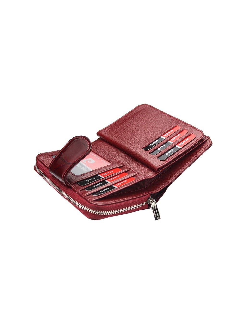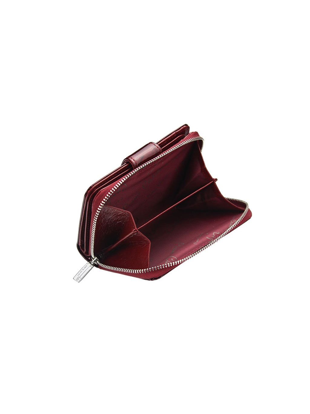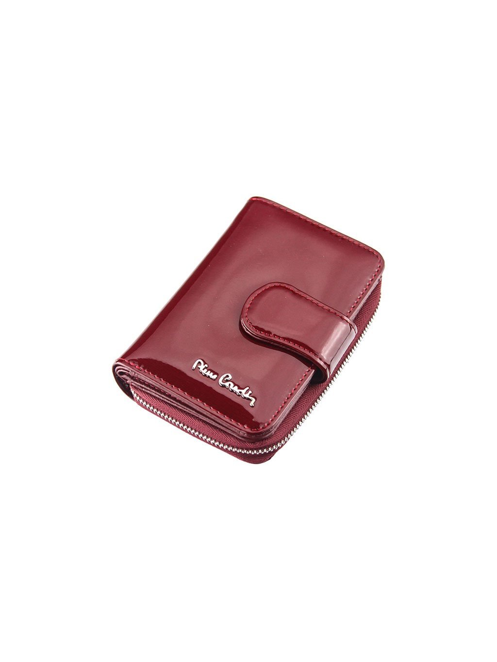 Menší elegantní dámská kožená peněženka z provenience francouzské módní značky Pierre Cardin, která je ušitá z lakované přírodní kůže. Samotná peněženka je rozdělena na dvě části, mincovník, který se uzavírá zipem a zipovou separací je rozdělený na dvě části. Zip peněženky jde doširoka rozepnout a ulehčuje tak manipulaci s drobnými mincemi. Druhá část je na karty a se zapíná úzkou pinetkou na patentku. Kromě množství přihrádek na klasické karty, obsahuje i prostor pro doklady. Fochy pro papírové bankovky jsou na svrchní straně peněženky.