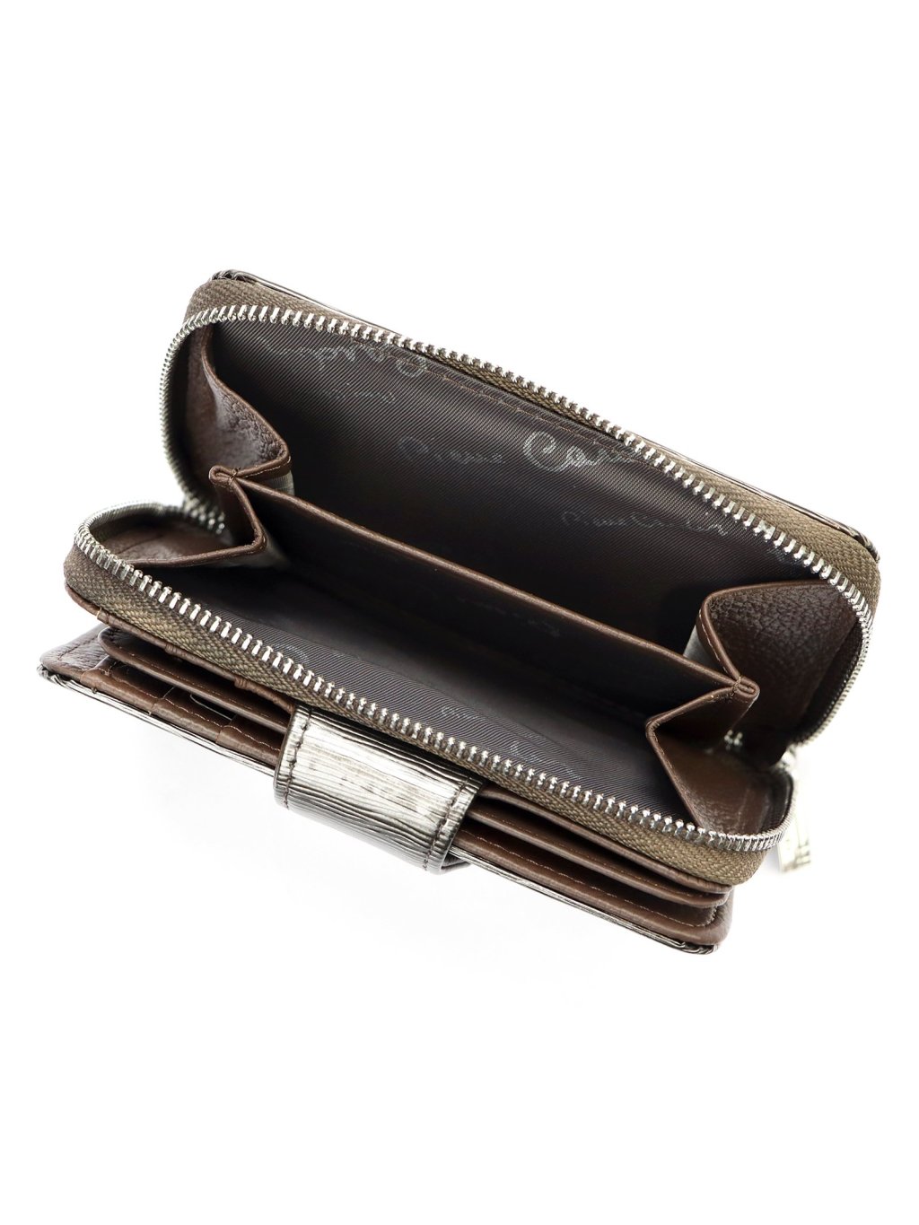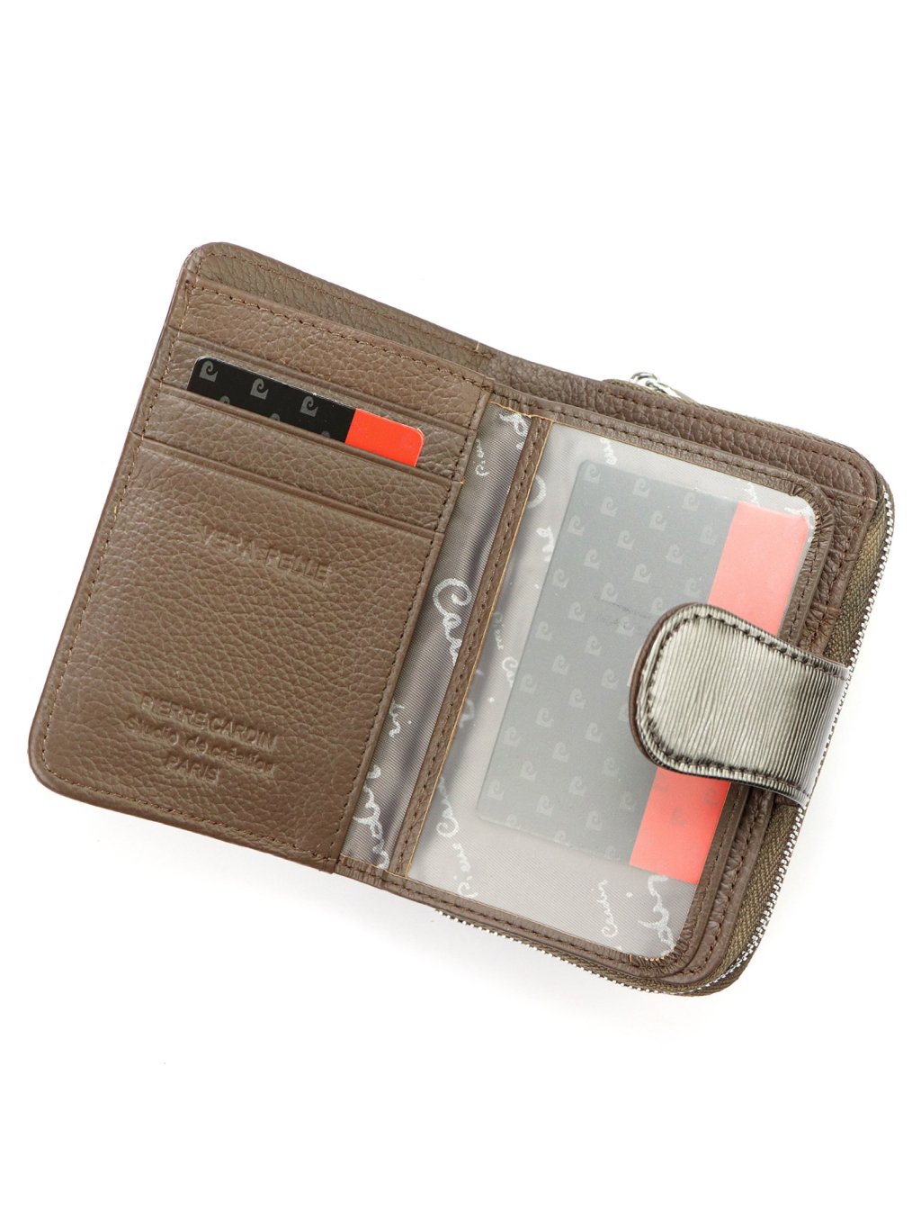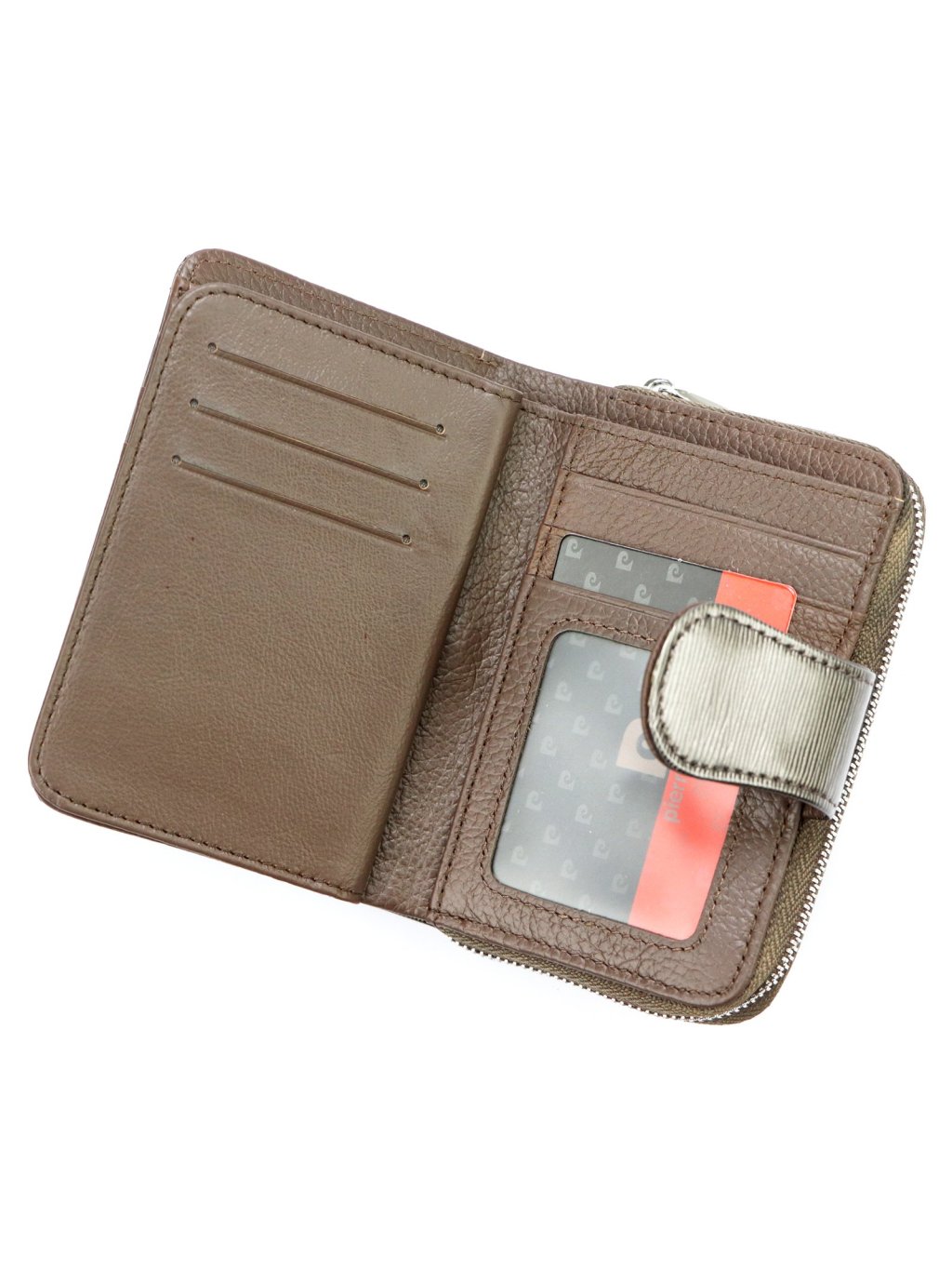 Kompaktní dámská peněženka ušitá z pravé přírodní kůže. Celá peněženka je rozdělena na dvě části: mincovník uzavíratelný zipem, který se dá široce rozevřít a usnadňuje tak manipulaci s drobnými mincemi, a druhou část na platební karty uzavíranou úzkou zápinkou s patentkou. peněženka nabízí dostatek přihrádek na platební, věrnostní i dokladové karty. Fochy na papírové bankovky jsou umístěny v horní části peněženky.