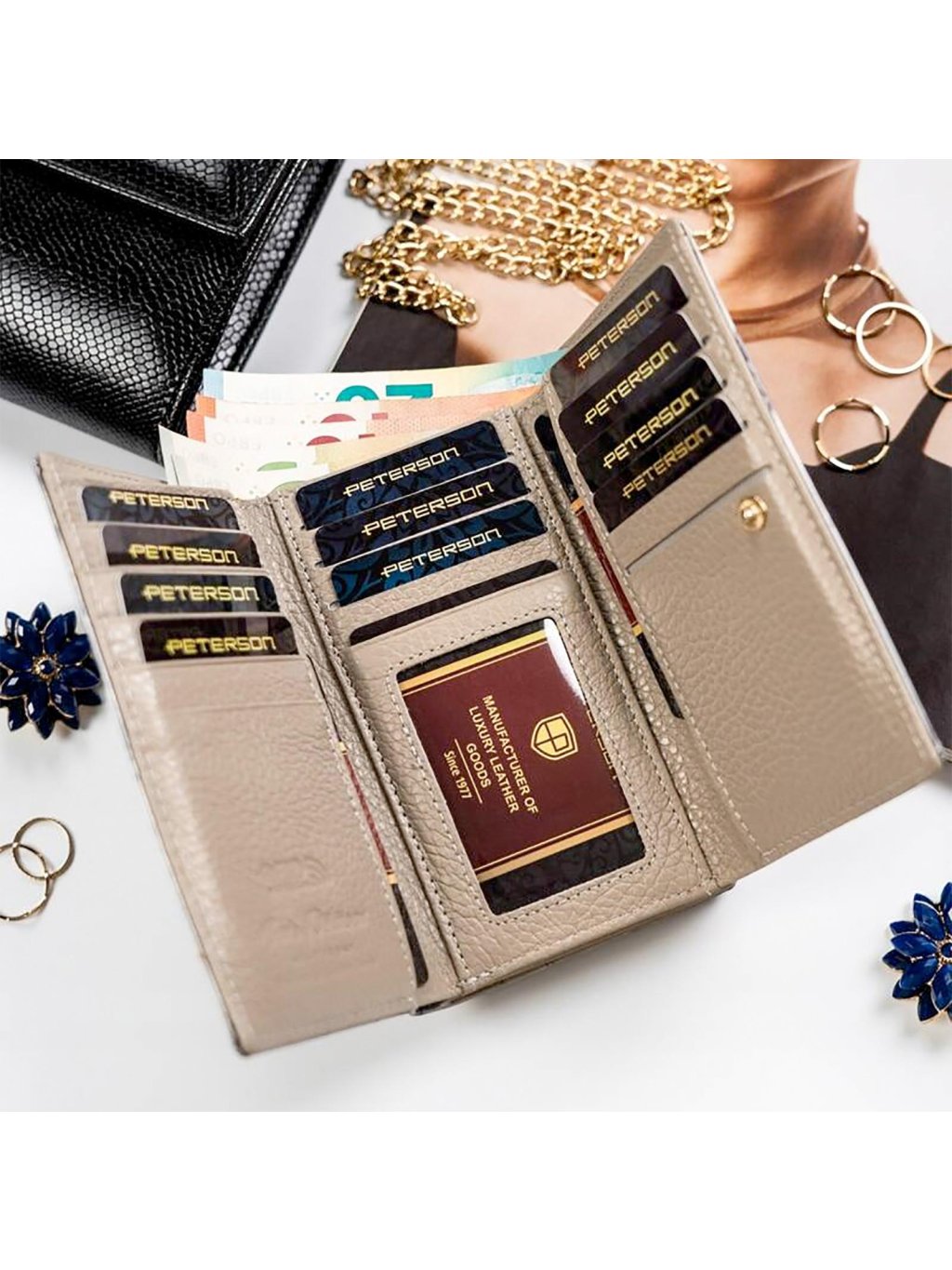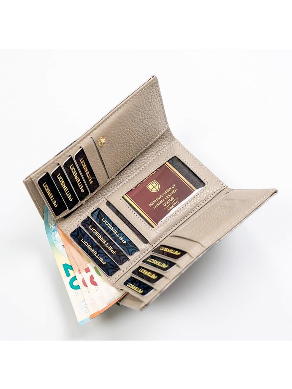 Středně velká dámská peněženka ušitá z přírodní kůže. Peněženka se zapíná drukem a nabízí praktické členění: Fochy na papírové bankovky, sloty platební karty věrnostní karty a doklady a kapsu na drobné mince uzavíratelnou kovovým rámečkem na zadní straně. Celá peněženka se zapíná klopou na patent a je dodávána v originální dárkové krabičce, která ideální jako stylový a praktický dárek.