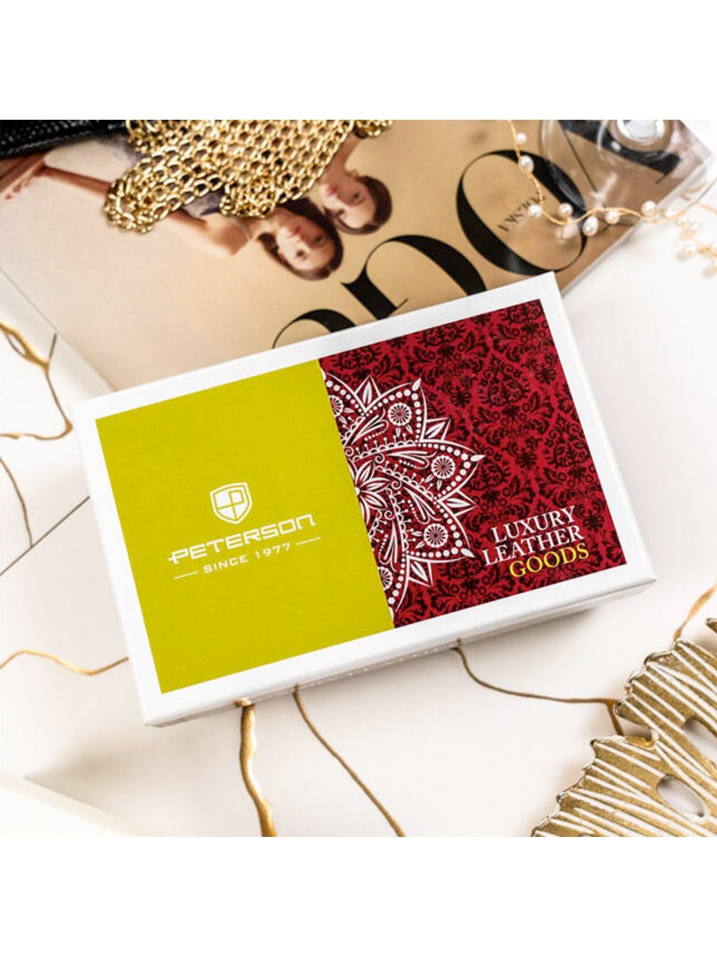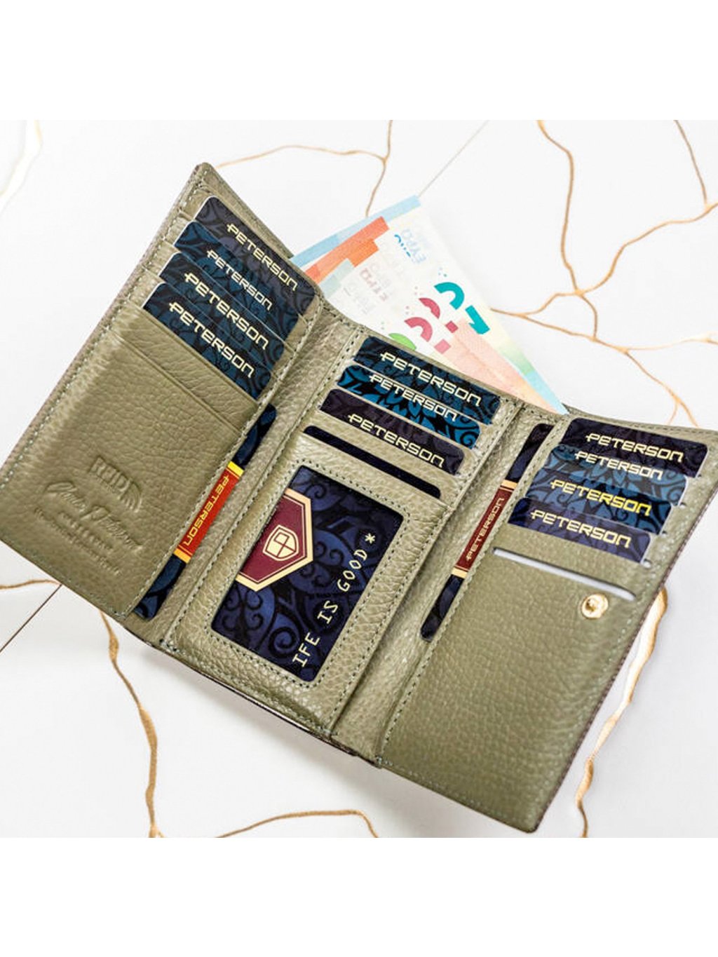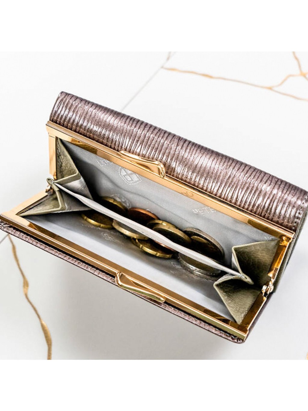 Středně velká dámská peněženka ušitá z přírodní kůže. Peněženka se zapíná drukem a nabízí praktické členění: Fochy na papírové bankovky, sloty platební karty věrnostní karty a doklady a kapsu na drobné mince uzavíratelnou kovovým rámečkem na zadní straně. Celá peněženka se zapíná klopou na patent a je dodávána v originální dárkové krabičce, která ideální jako stylový a praktický dárek.