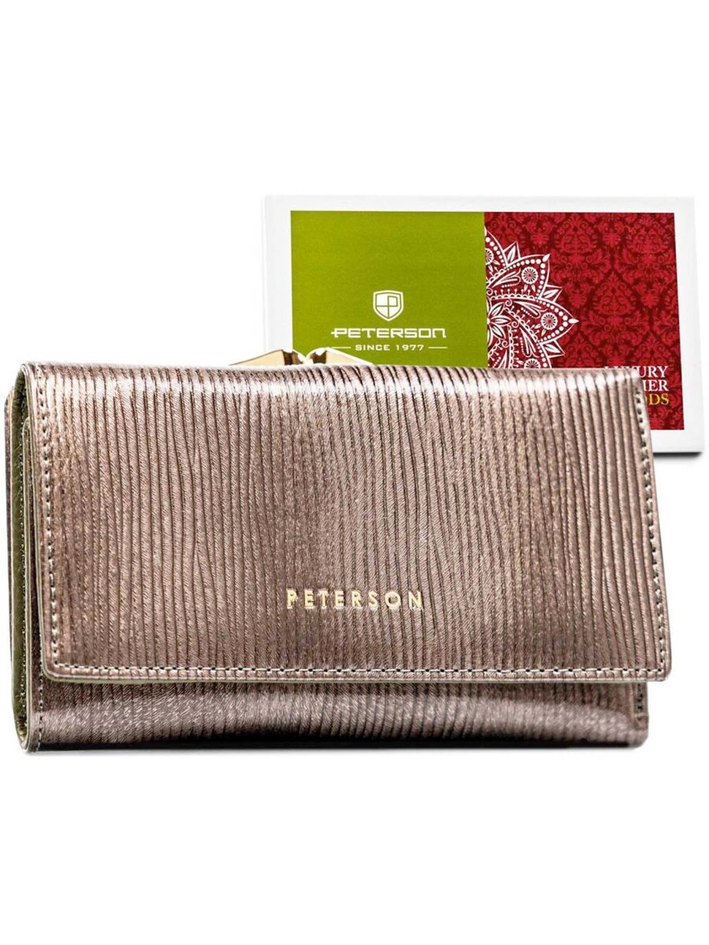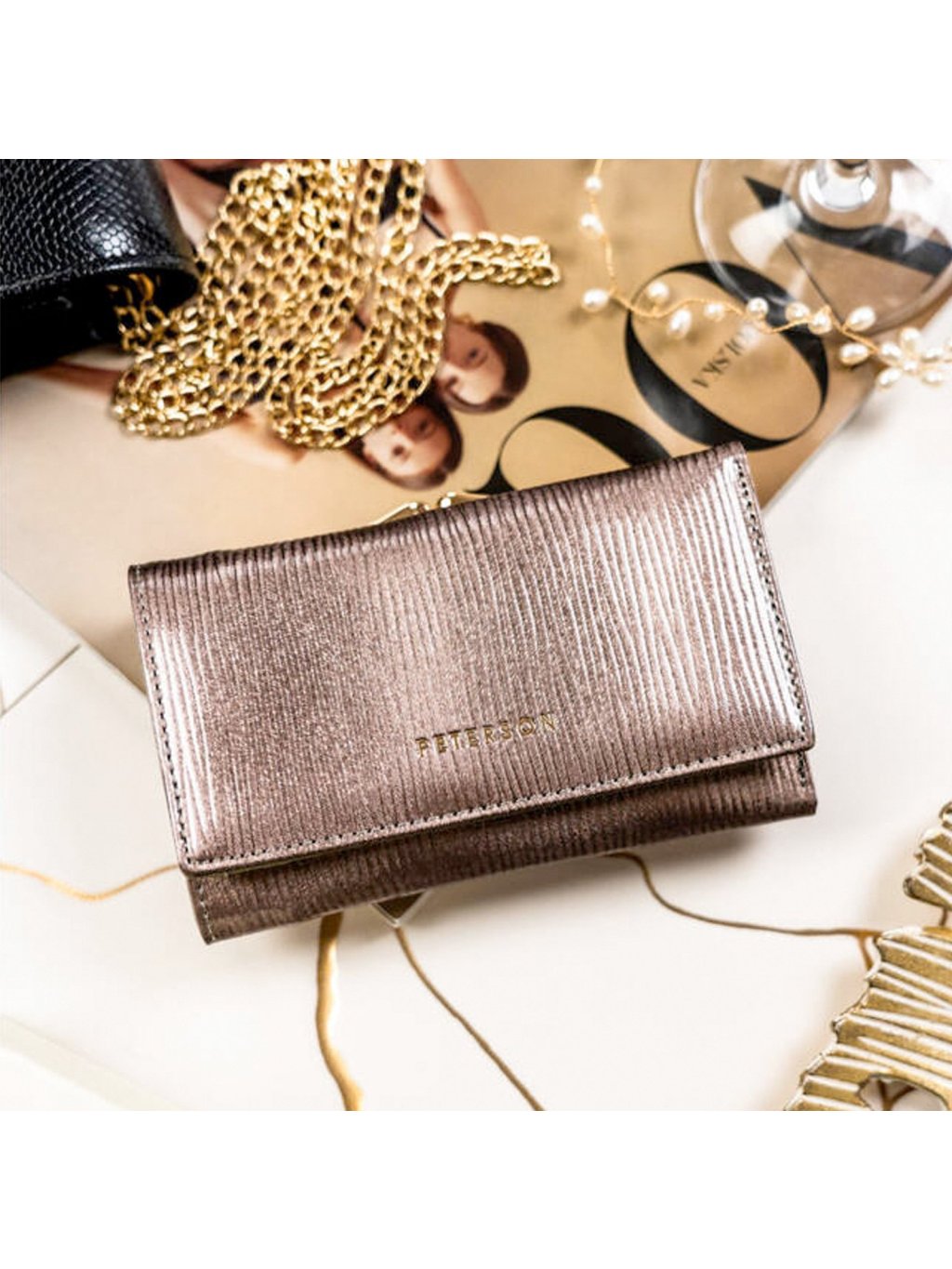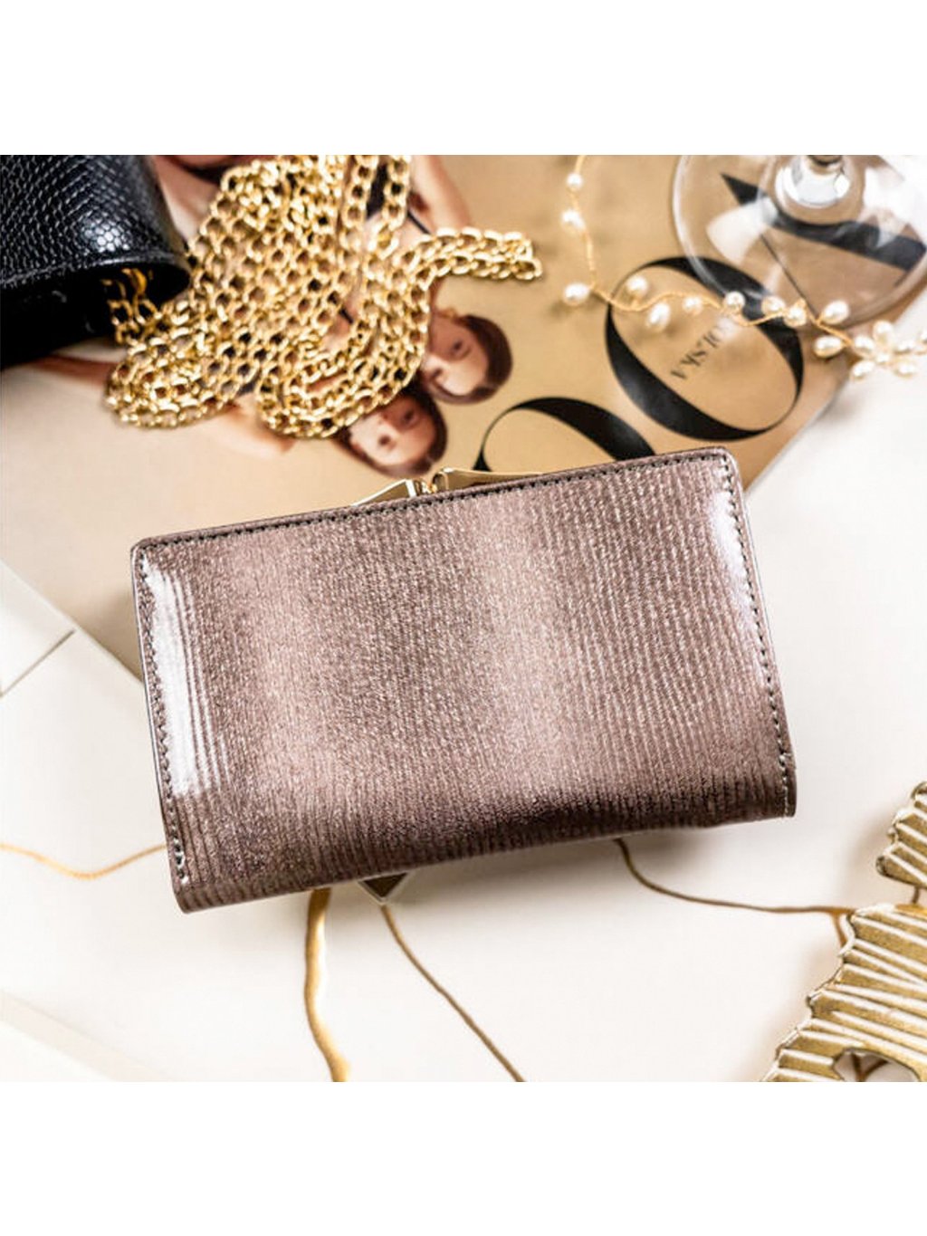 Středně velká dámská peněženka ušitá z přírodní kůže. Peněženka se zapíná drukem a nabízí praktické členění: Fochy na papírové bankovky, sloty platební karty věrnostní karty a doklady a kapsu na drobné mince uzavíratelnou kovovým rámečkem na zadní straně. Celá peněženka se zapíná klopou na patent a je dodávána v originální dárkové krabičce, která ideální jako stylový a praktický dárek.
