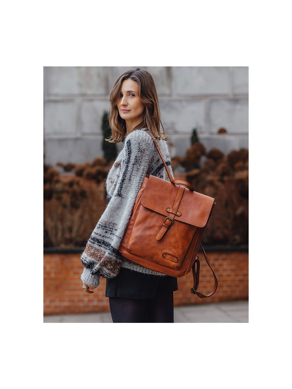 Elegantní batoh, který je ručně šitý a následně je celý podroben procesům stárnutí a zušlechťování kůže, díky čemuž kůže kromě vizuálního efektu - vintege efektu - zůstává bezchybně zachována. Projevy stárnutí jsou patrné na celém batohu, také na kování, zámcích a podšívce. Díky tomu je každý kus jedinečný a originální. Přístup do vnitřní části batohu je zajištěn zipem a klopou s magnetickým zapínáním. Vnitřek je pečlivě podšitý silnou látkovou podšívkou. Uvnitř batohu jsou dvě kapsy, jedna otevřená a druhá uzavíratelná na zip. Vpředu a vzadu jsou další praktické kapsy. Pohodlné nastavitelné ucha jsou vyrobené výhradně z přírodní kůže zajišťují komfort při nošení.