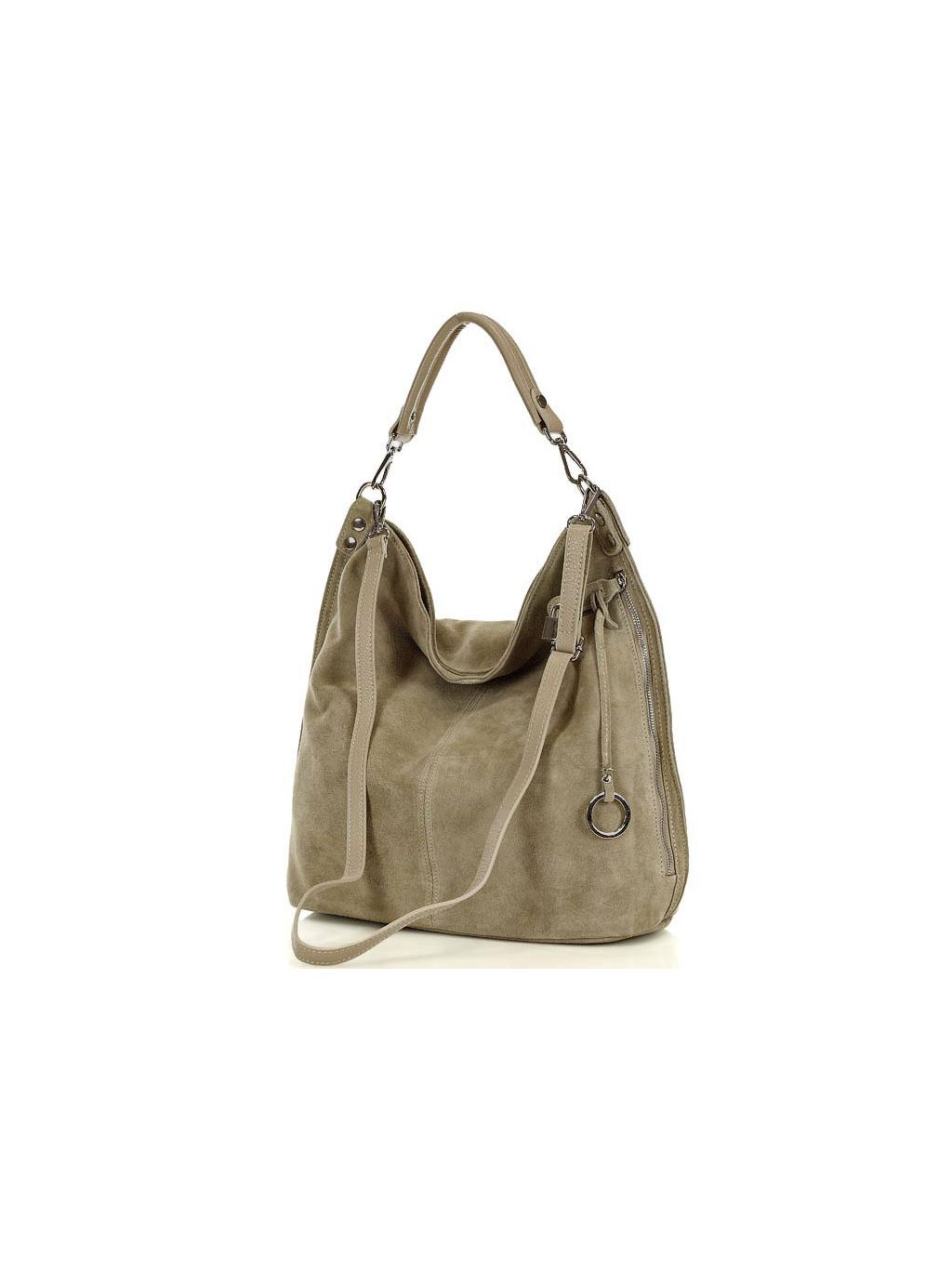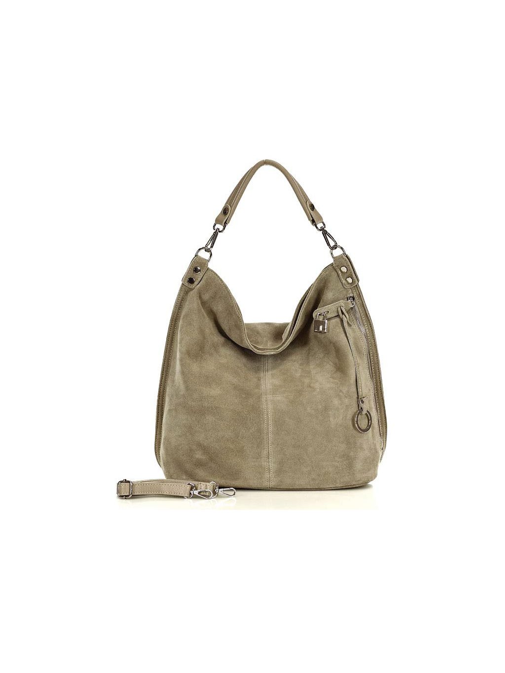 Dámská kožená kabelka Mazzini ušitá z italské broušené kůže. Prostorný vnitřek je tvořen dvěma velkými přihrádkami, oddělenými uzavíratelnou kapsou, dvě otevřené kapsičky a jednu kapsu na zip. Na venkovní čelní straně se nachází prostorná, leč téměř skrytá kapsa, zajištěná jednak zipem a za druhé okrasným, ale funkčním zámečkem. Taška se může nosit jak na předloktí, tak přes rameno, a to díky přídavnému dlouhému řemínku.