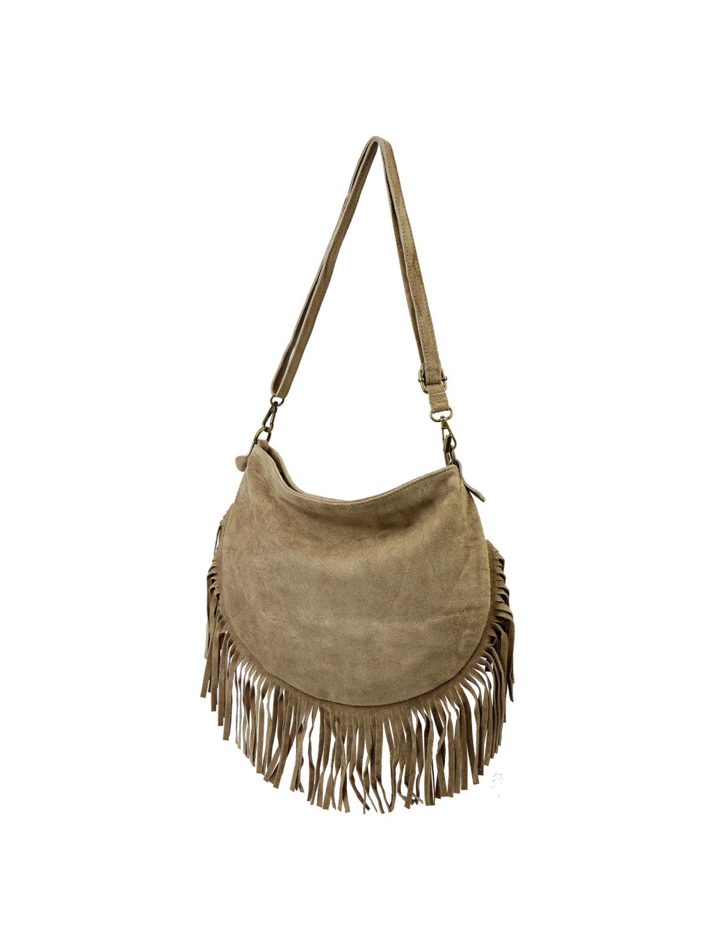 Tato středně velká dámská kabelka z pravé broušené kůže spojuje ležérní styl s elegantním provedením. Má jednokomorový vnitřní prostor uzavíratelný na zip a praktickou vnitřní kapsu na zip. Měkký přírodní semiš zajišťuje příjemný omak i stylový vzhled, zatímco zlaté kovové detaily dodávají nádech luxusu. Ozdobné třásně na přední straně podtrhují jemný boho nádech celého modelu. Díky nastavitelnému popruhu se kabelka pohodlně nosí na rameni nebo křížem přes tělo. Ideální kousek pro každodenní nošení